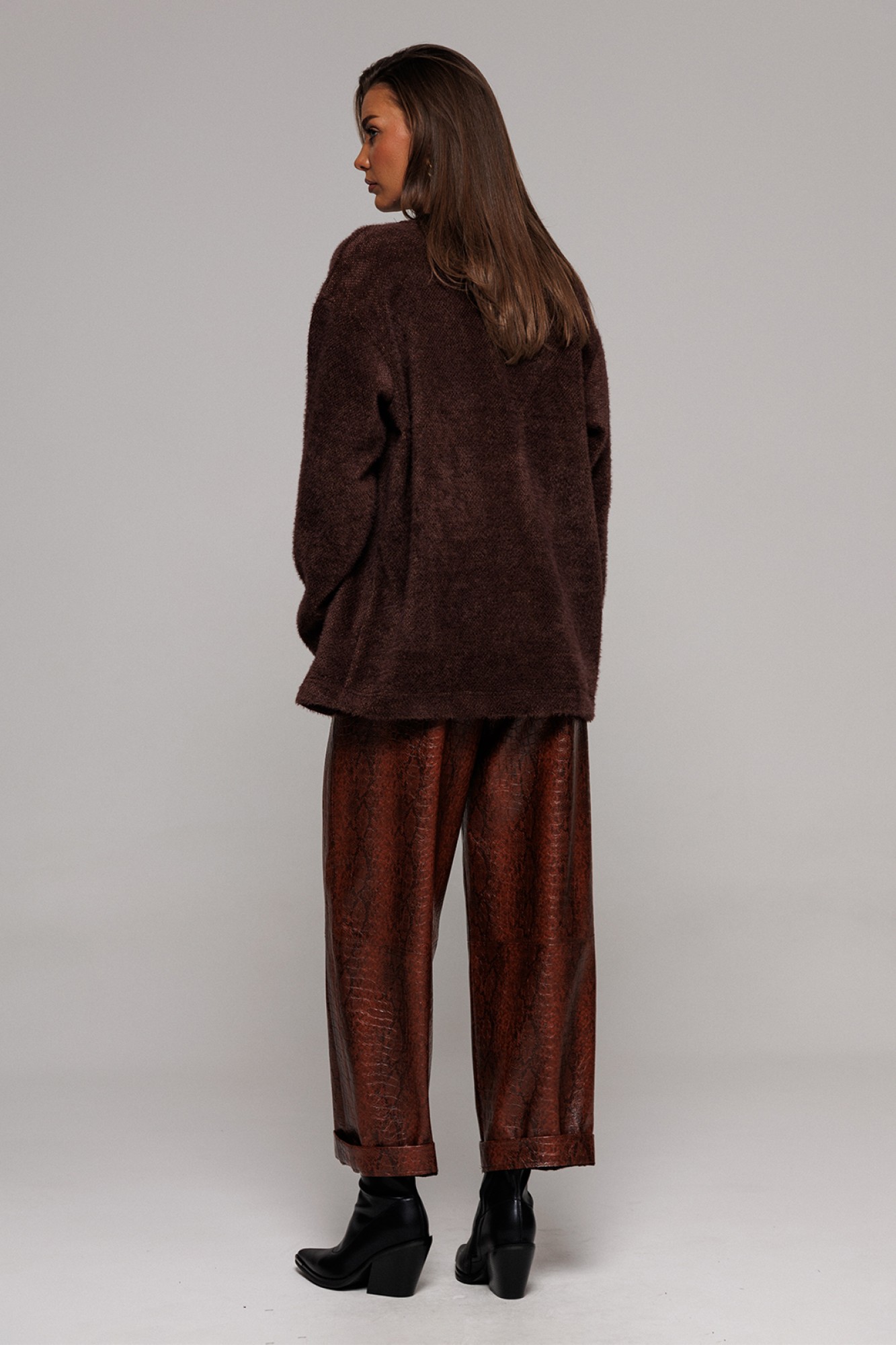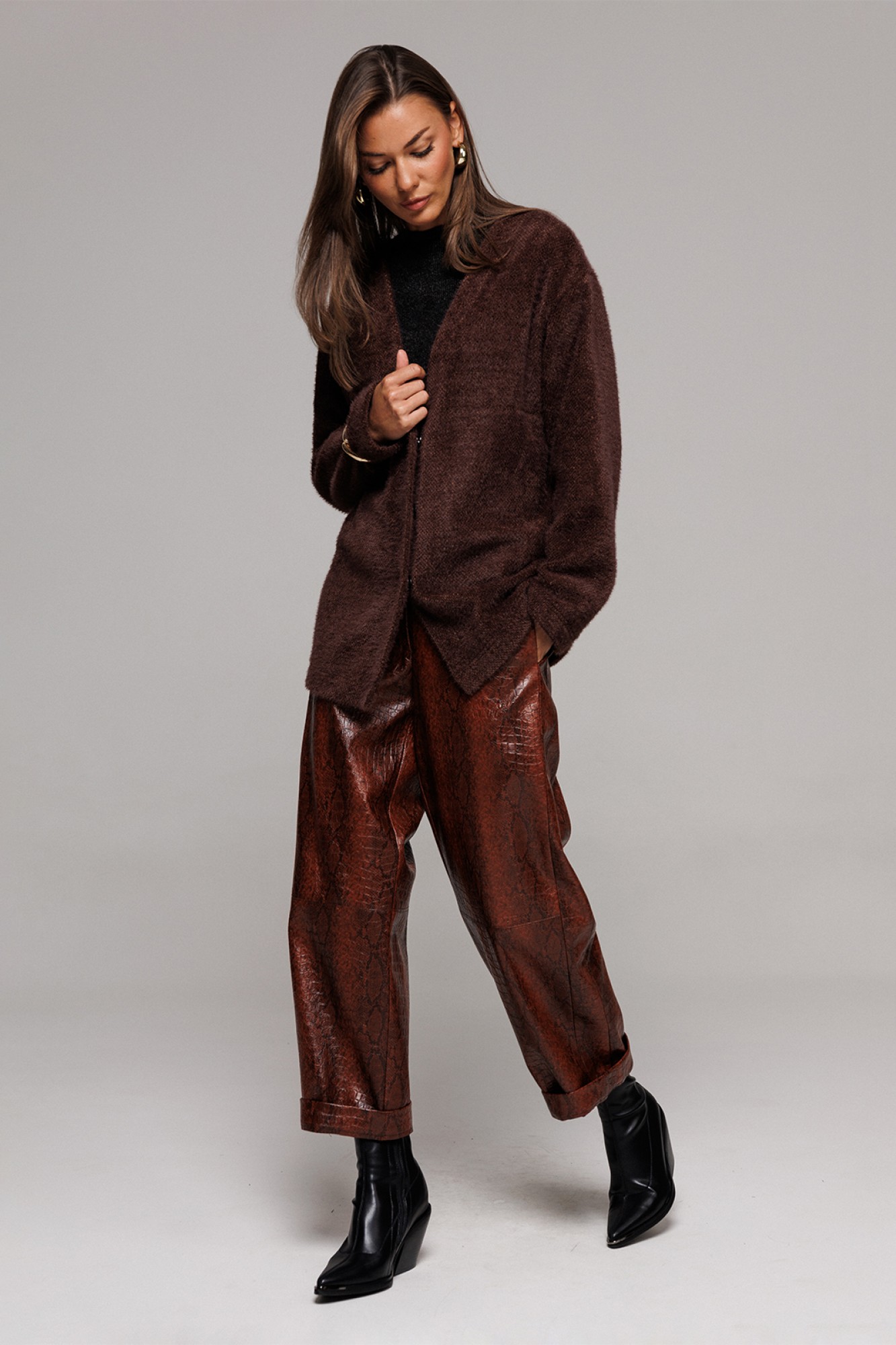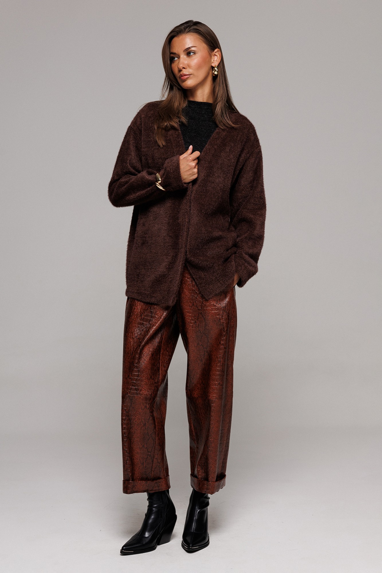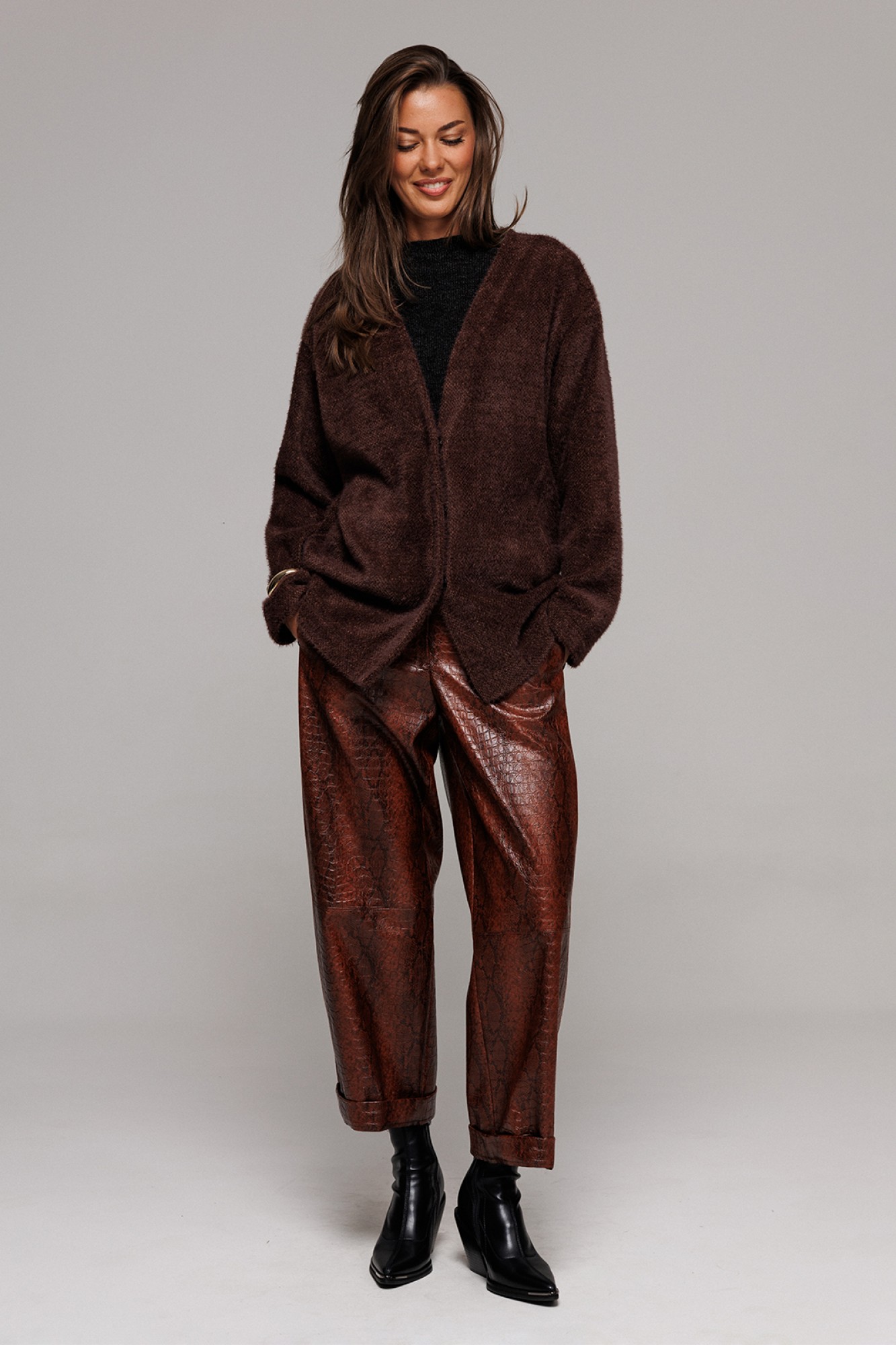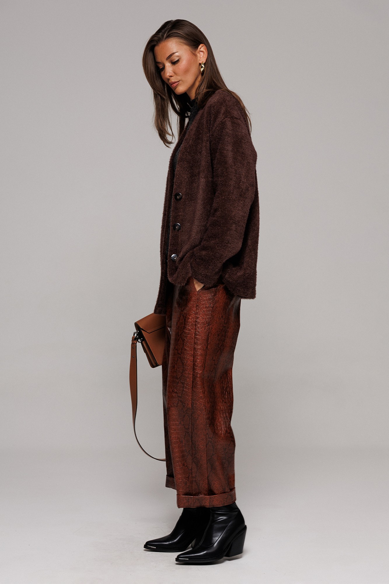 Кардиган из трикотажного полотна, свободного силуэта, слегка заужен к низу, со спущенной линией плеча и втачным рукавом. Полочка с V-образным вырезом и центральной застежкой на пришивные кнопки. Без подкладки.