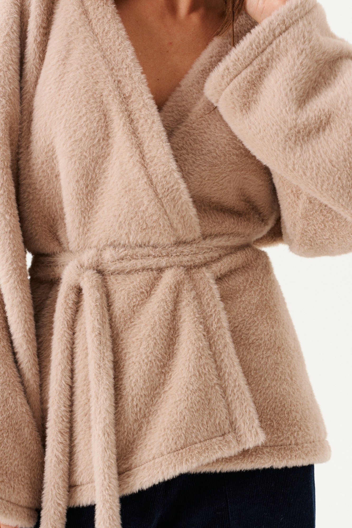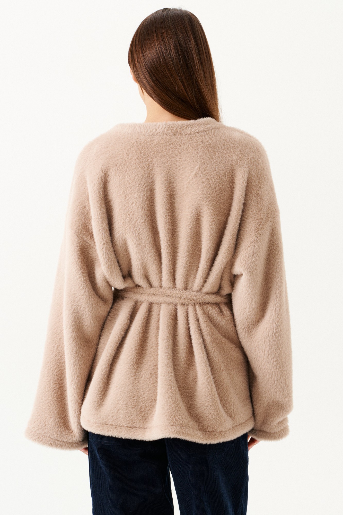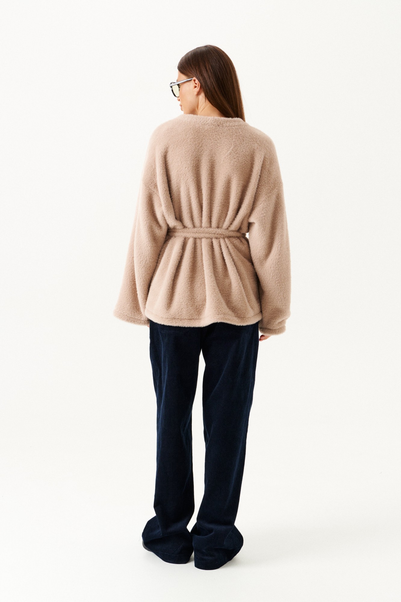 Кардиган из трикотажного полотна умеренного объема, прямого силуэта, на подкладке. Вырез горловины и борта обработаны цельнокроеной планкой. Линия плеча спущенная. Спинка цельная. Рукав втачной, широкий. В комплекте пояс из основной ткани.