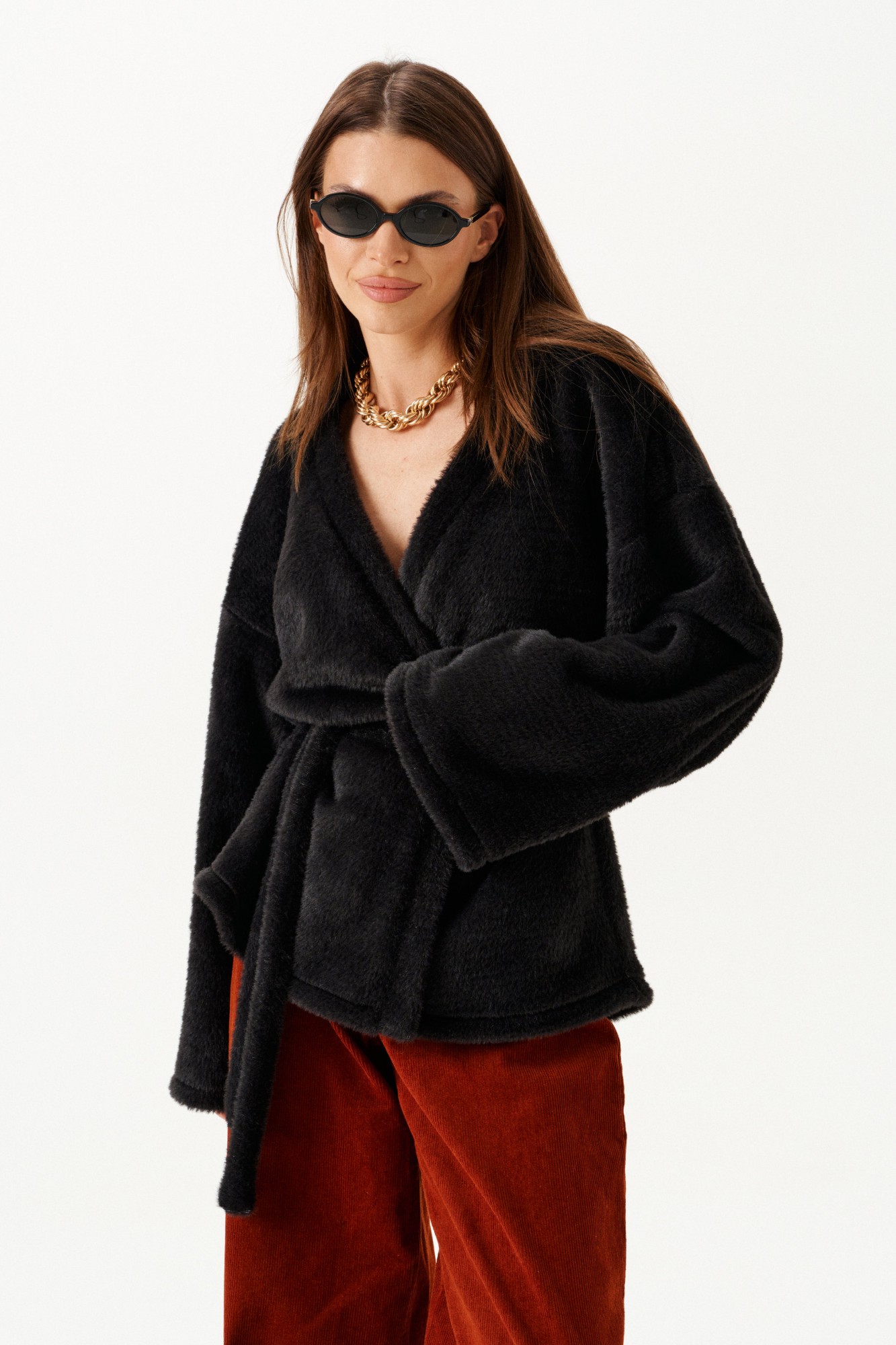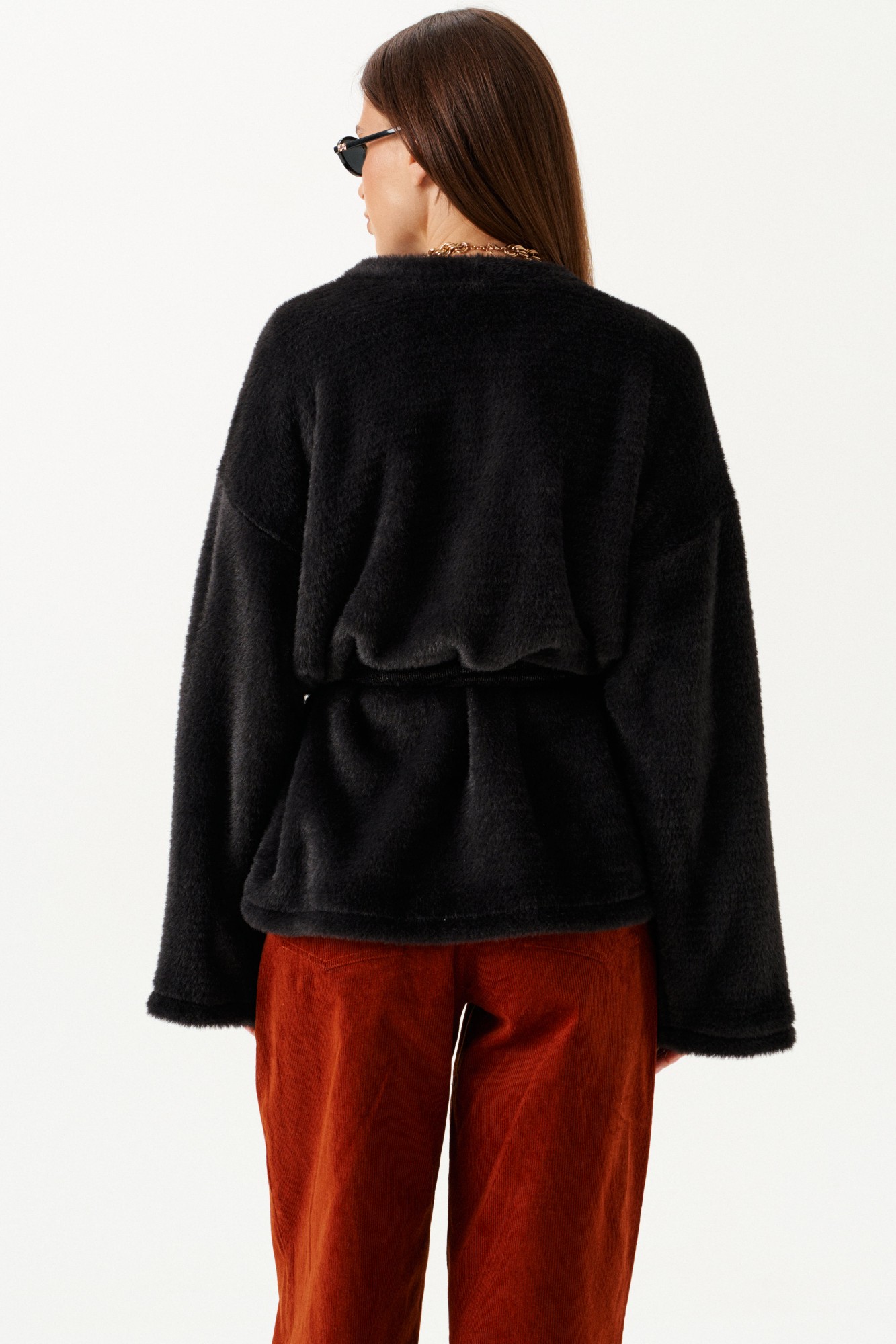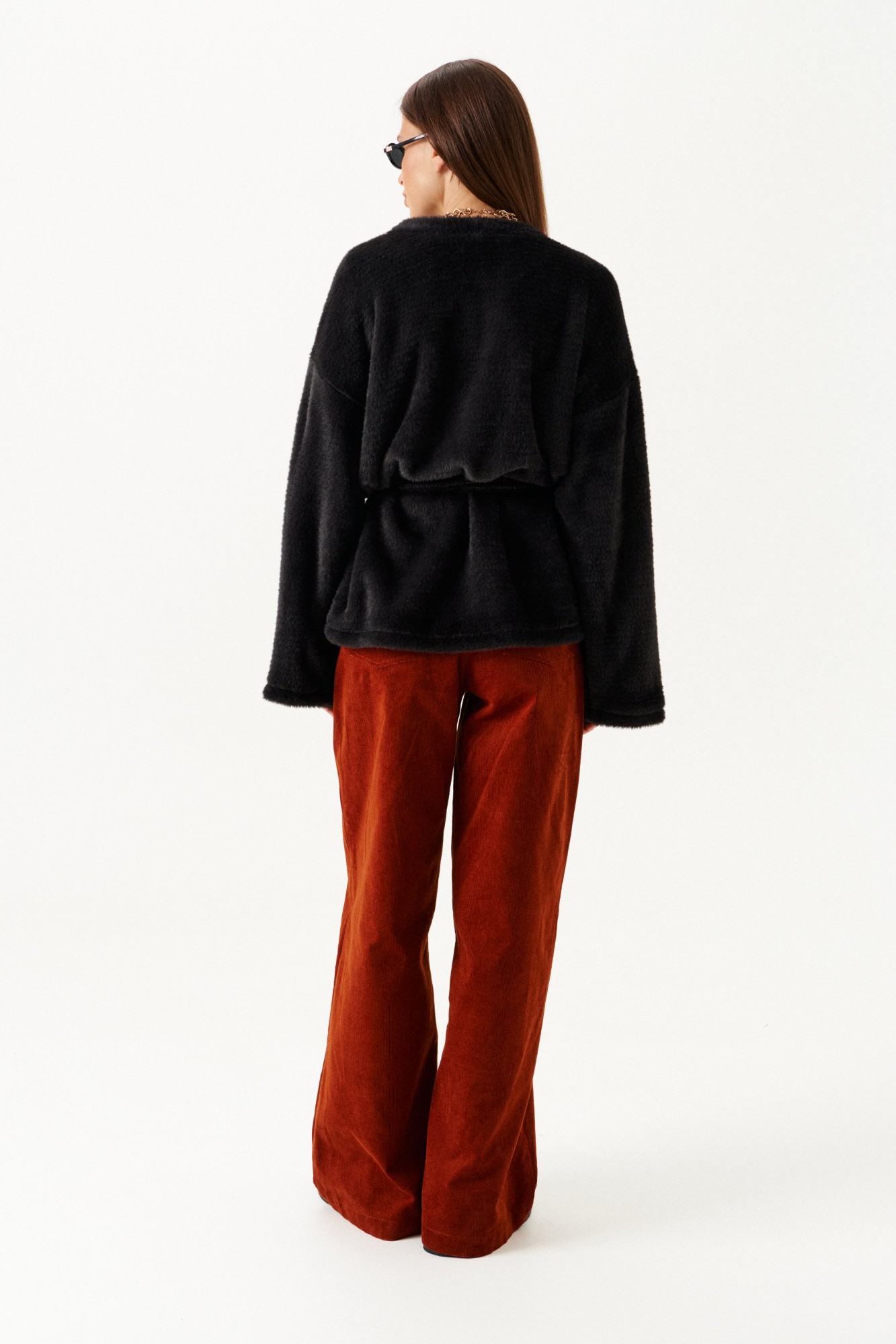 Кардиган из трикотажного полотна умеренного объема, прямого силуэта, на подкладке. Вырез горловины и борта обработаны цельнокроеной планкой. Линия плеча спущенная. Спинка цельная. Рукав втачной, широкий. В комплекте пояс из основной ткани.