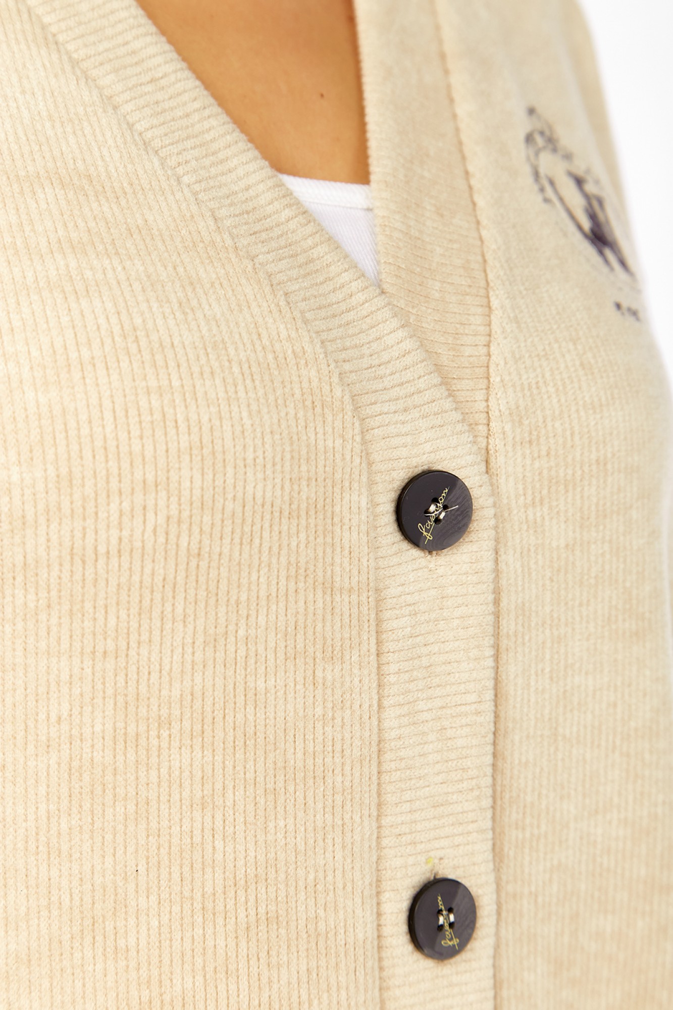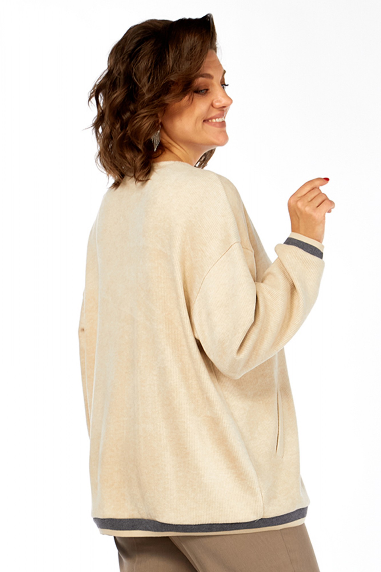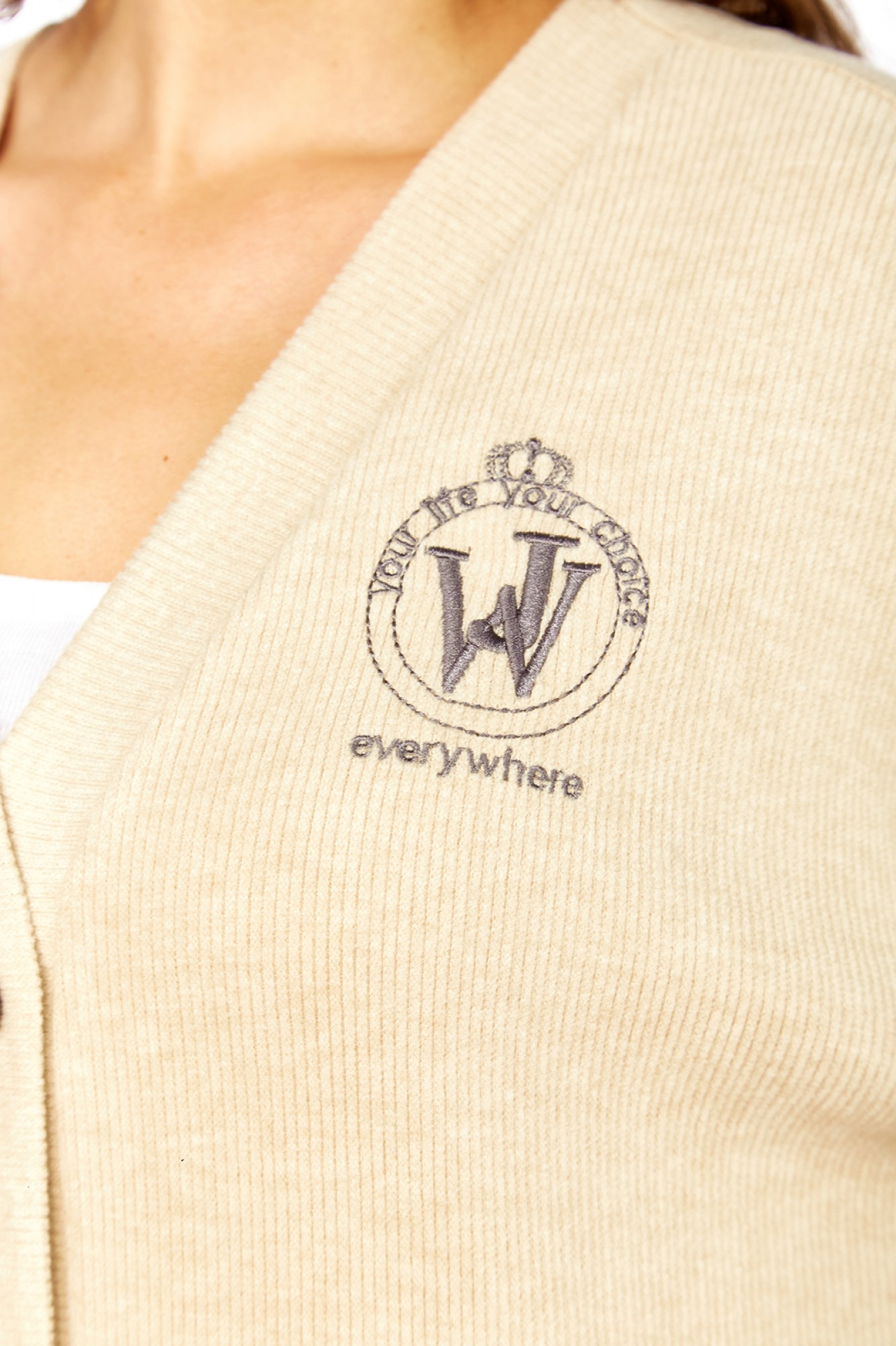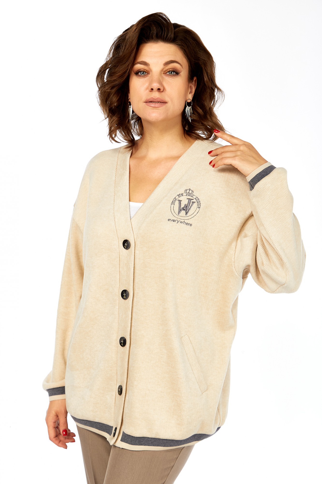 Кардиган женский, изготовлен из трикотажного полотна. Горловина V-образной формы, застежка отрезная планка на петли и пуговицы. Карманы с листочками. По низу изделия и низу рукавов-декоративные довязы. Спинка цельнокроеная. Рукава спущенные длинные. Отделочный элемент — вышивка на детали переда.