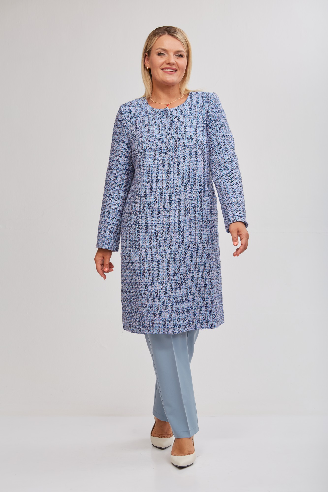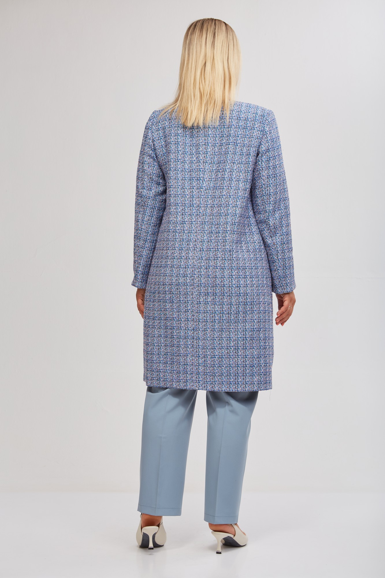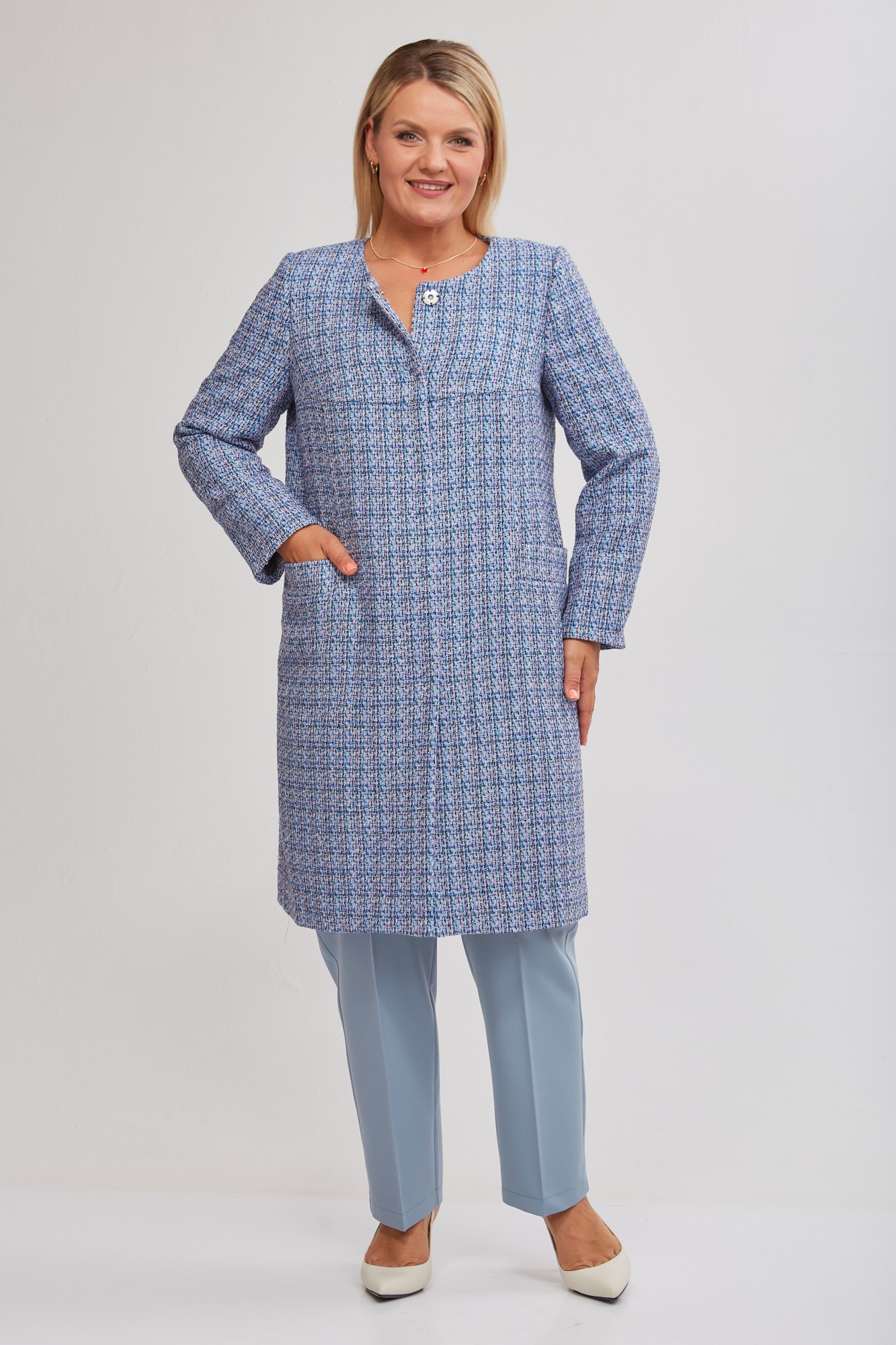 Кардиган из жаккардовой ткани «Шанель» на подкладке, полуприлегающего силуэта, без воротника, с центрально бортовой застежкой на пришивные кнопки. Перед с таллиевыми вытачками, карманами с листочкой входящей в подрез бочка и боковой шов . Спинка со средним швом. Рукав втачной двухшовный с широкой обтачкой для отворота. Вырез горловины круглый. Длина по спинке 100. Длина рукава 64.
