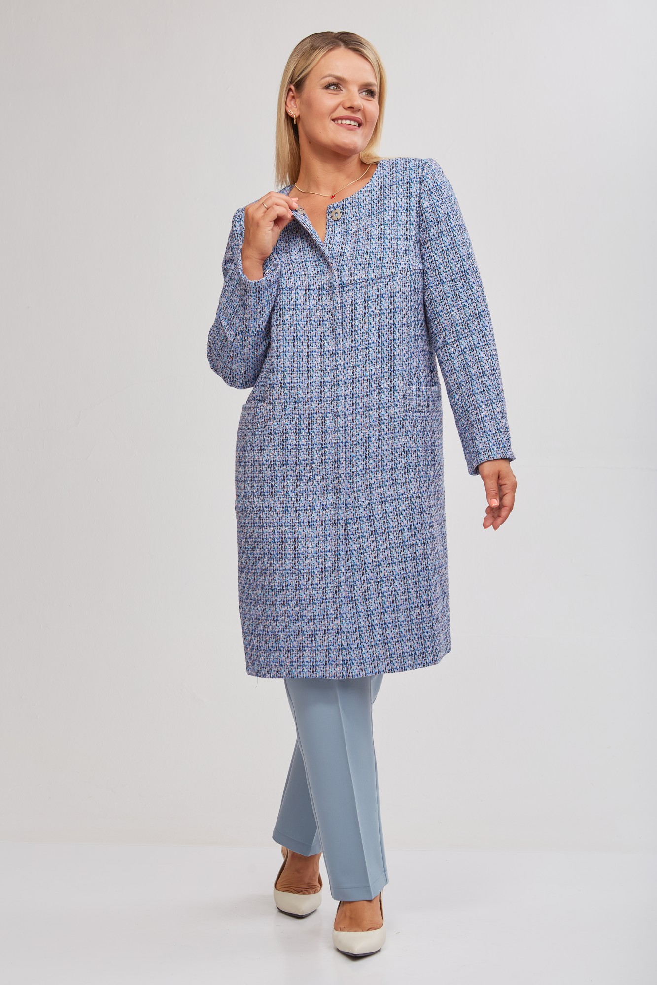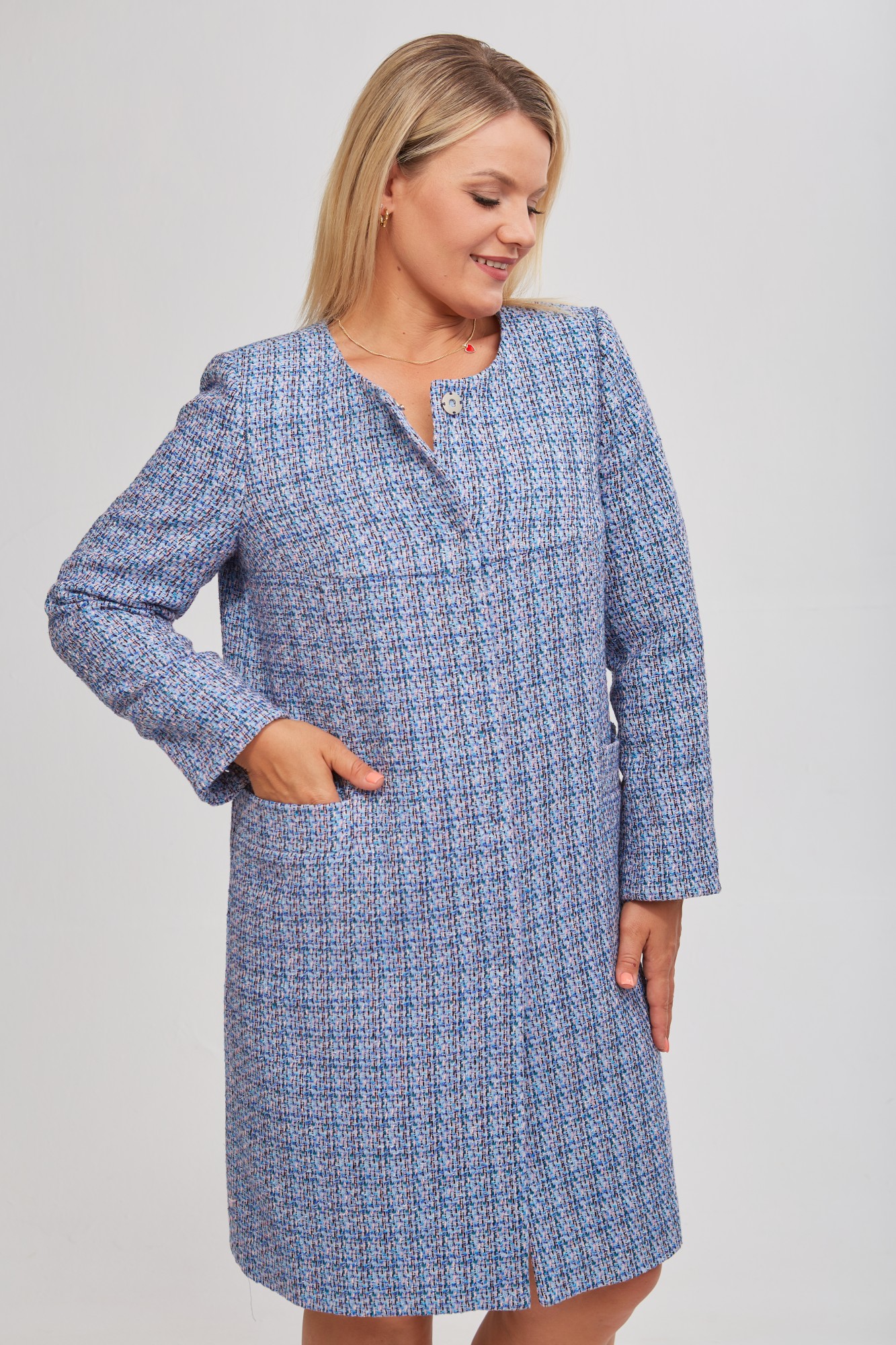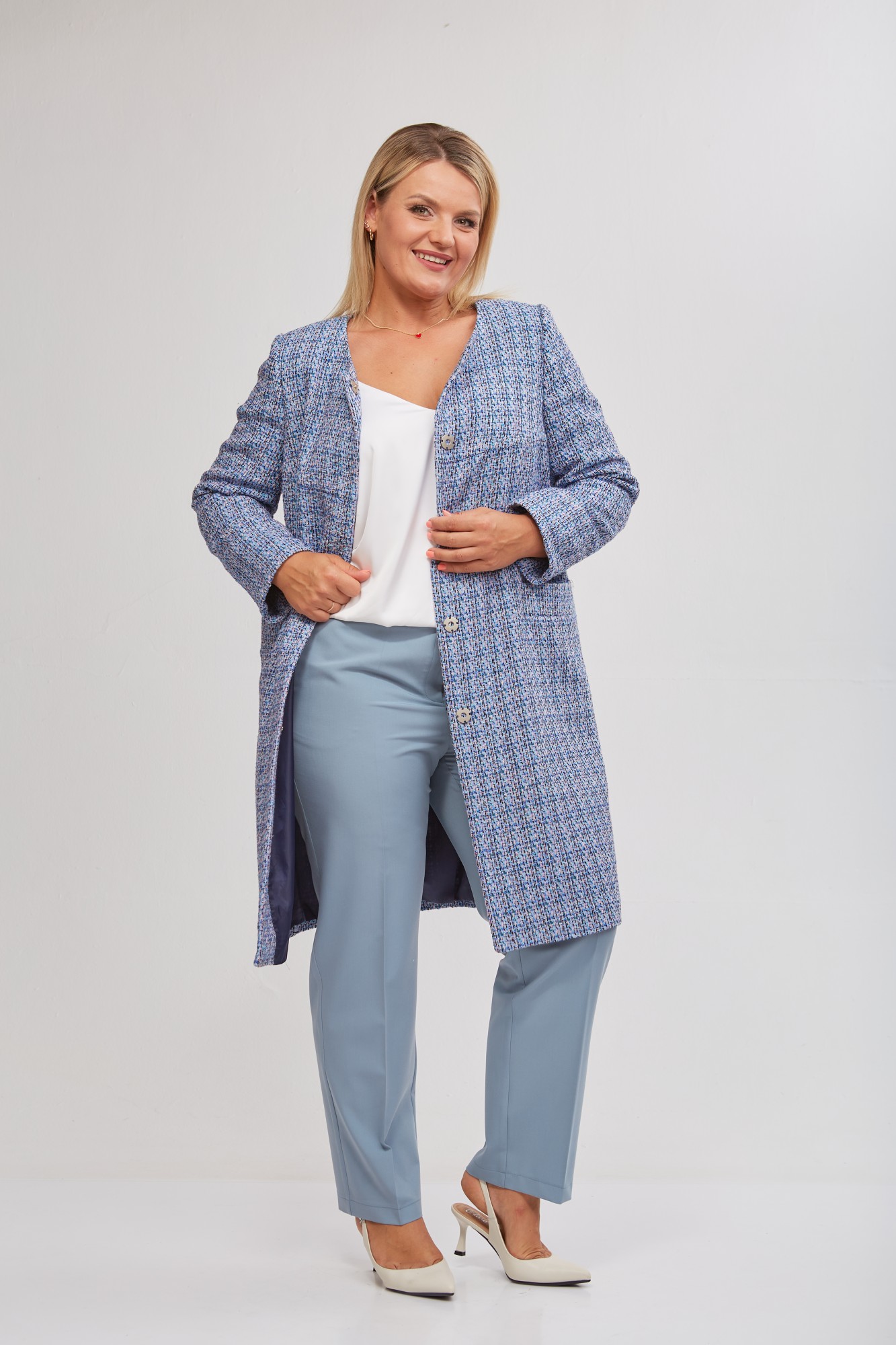 Кардиган из жаккардовой ткани «Шанель» на подкладке, полуприлегающего силуэта, без воротника, с центрально бортовой застежкой на пришивные кнопки. Перед с таллиевыми вытачками, карманами с листочкой входящей в подрез бочка и боковой шов . Спинка со средним швом. Рукав втачной двухшовный с широкой обтачкой для отворота. Вырез горловины круглый. Длина по спинке 100. Длина рукава 64.