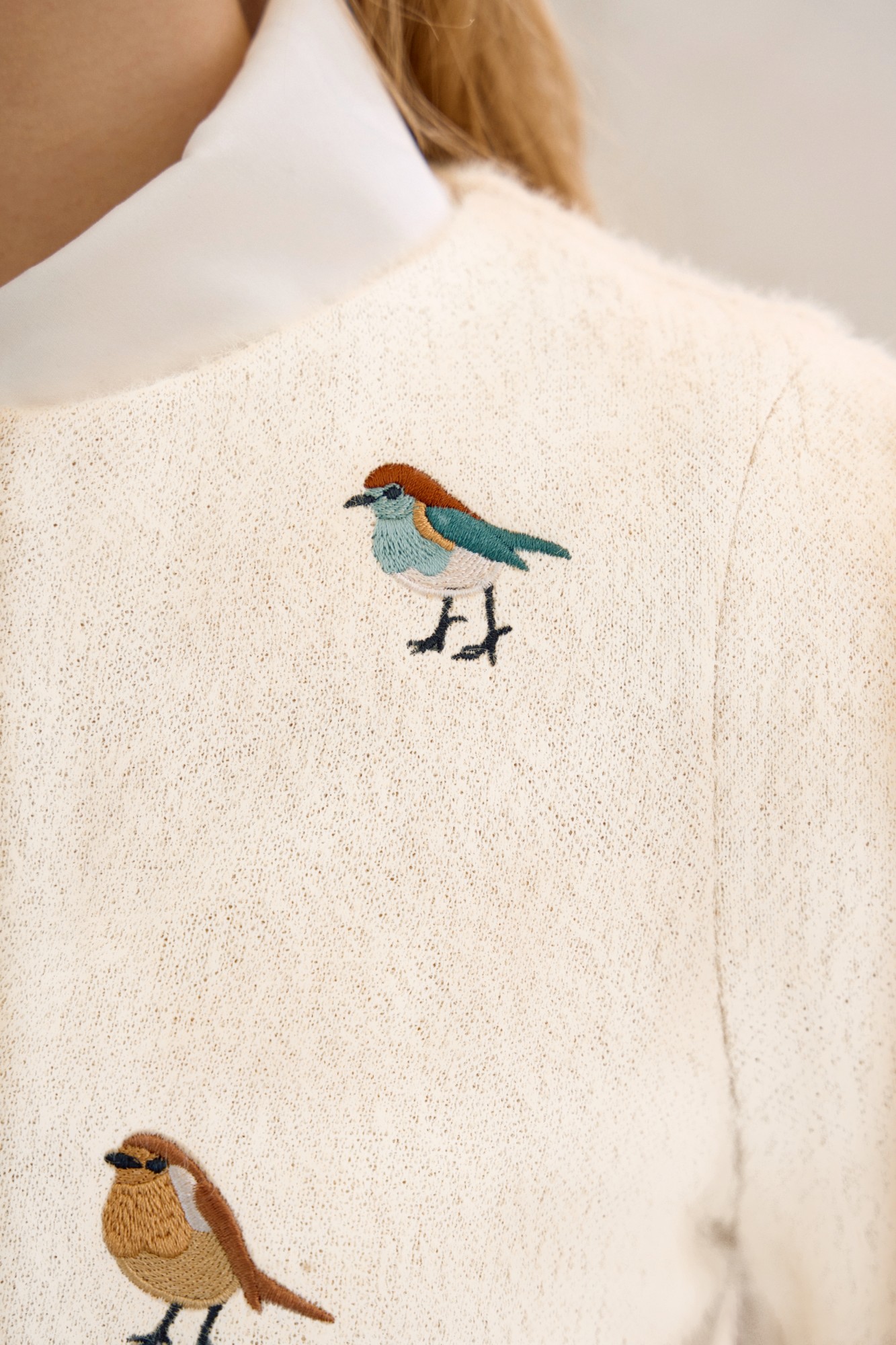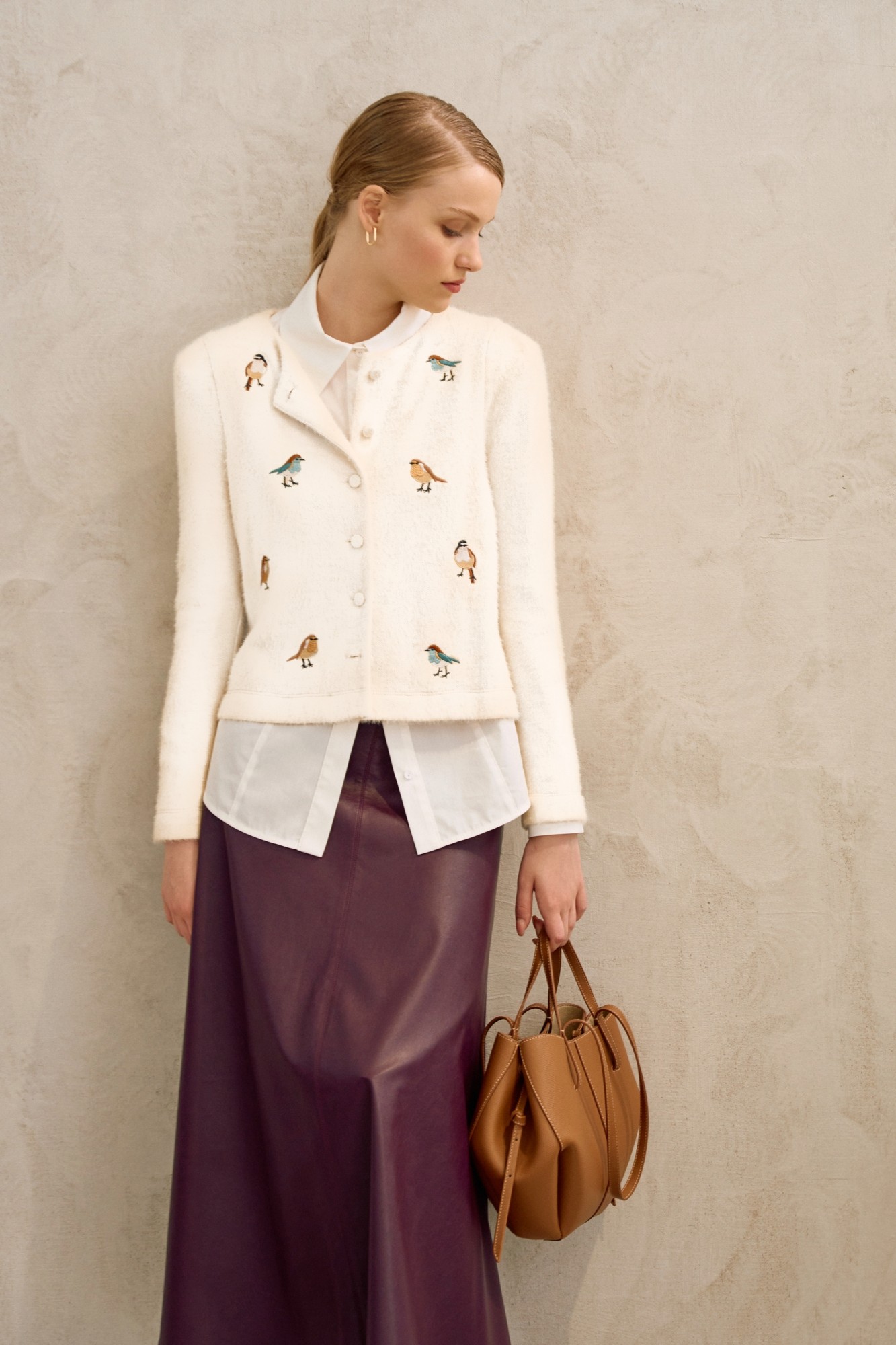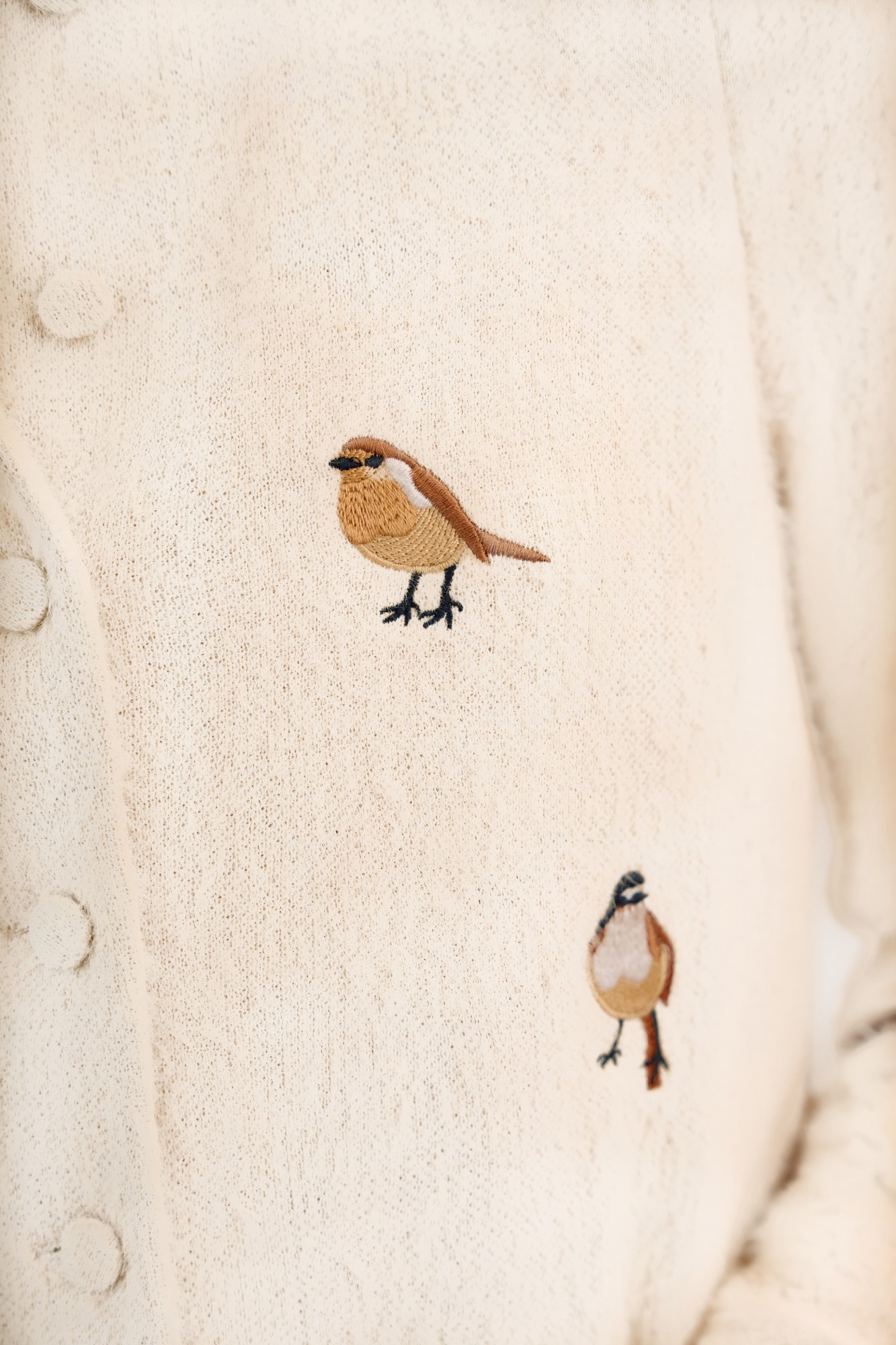 Жакет прямого силуэта и выполнен из нежного трикотажного полотна. Рукав втачной длинный, по верхней части рукава встречная складка. Округлый вырез горловины. Застежка на петли и пуговицы, по переду жакета выполнена вышивка – птички.