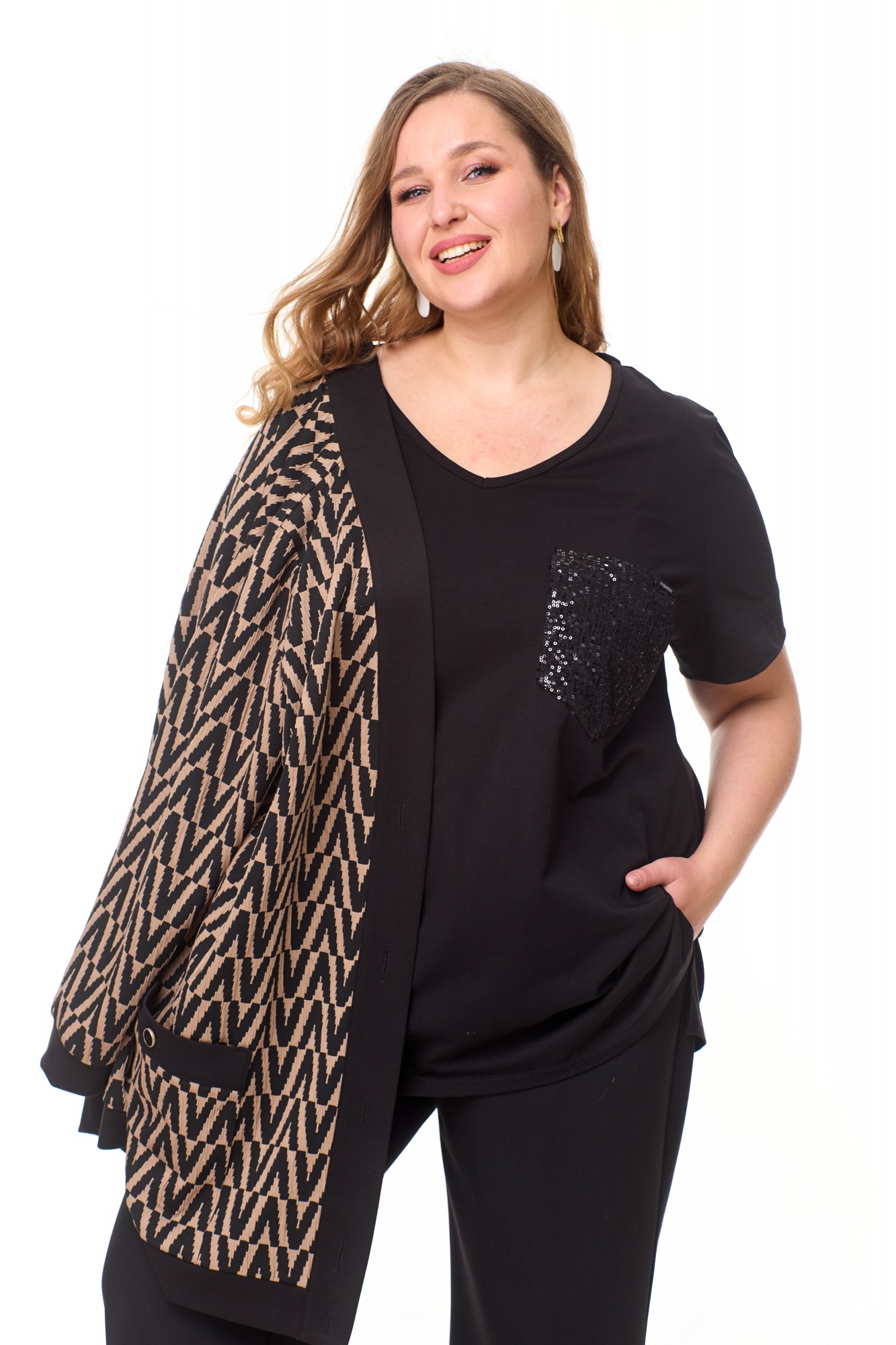 Кардиган свободного покроя, на пуговицах, с вырезом V-образной формы. Кардиган без подкладки и плечевых накладок. Рукав втачной на манжете из контрастной ткани, горловина с планкой тоже из контрастной ткани. На полочках накладные карманы Кардиган выполнен из трикотажной, приятной к телу ткани. Его можно носить на топ, блузку ли водолазку. Стильный женский кардиган станет незаменимой вещью в Вашем гардеробе