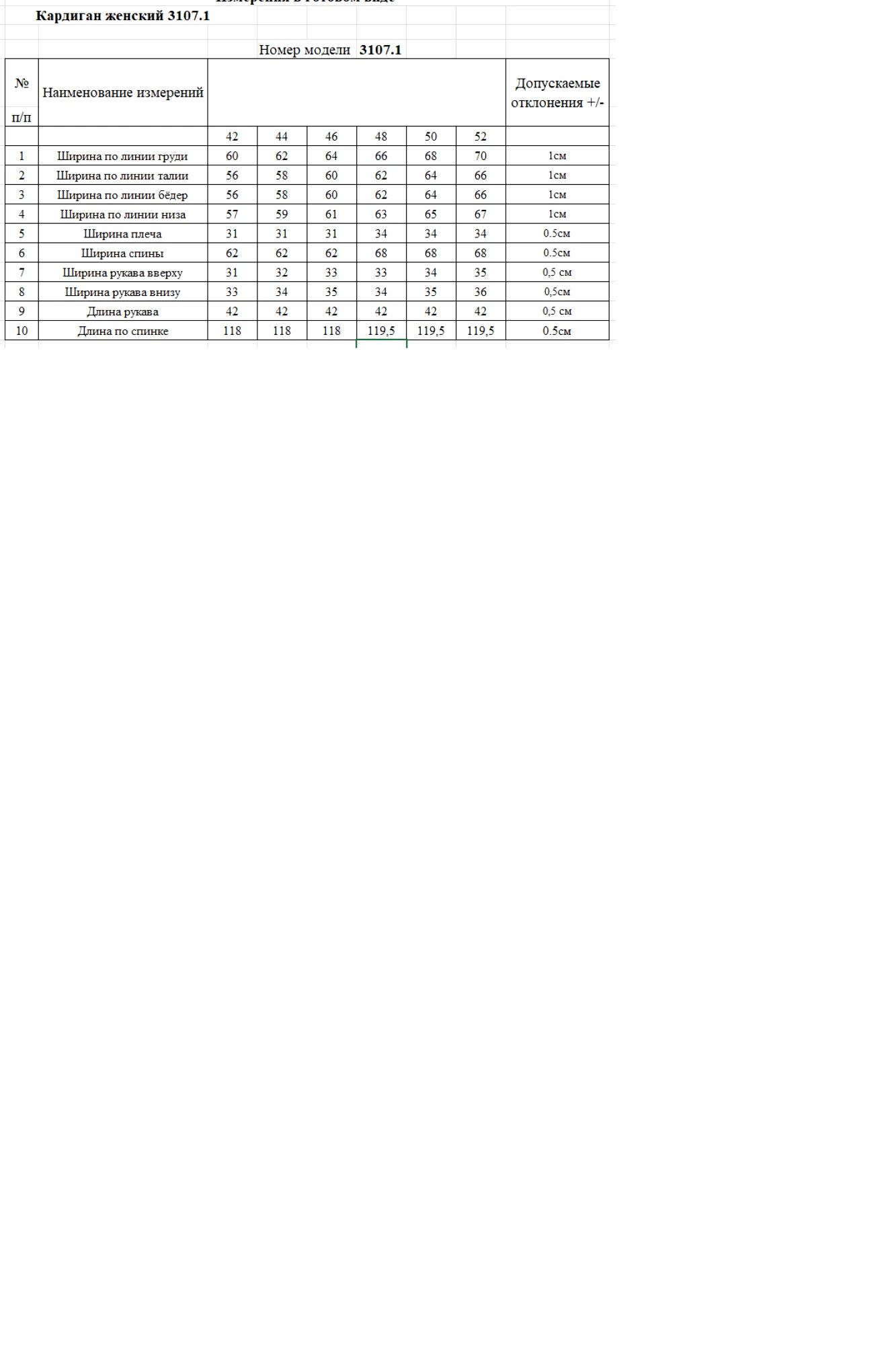 Таблица размеров