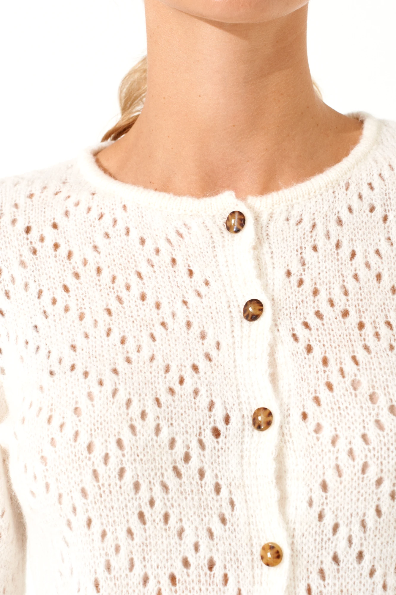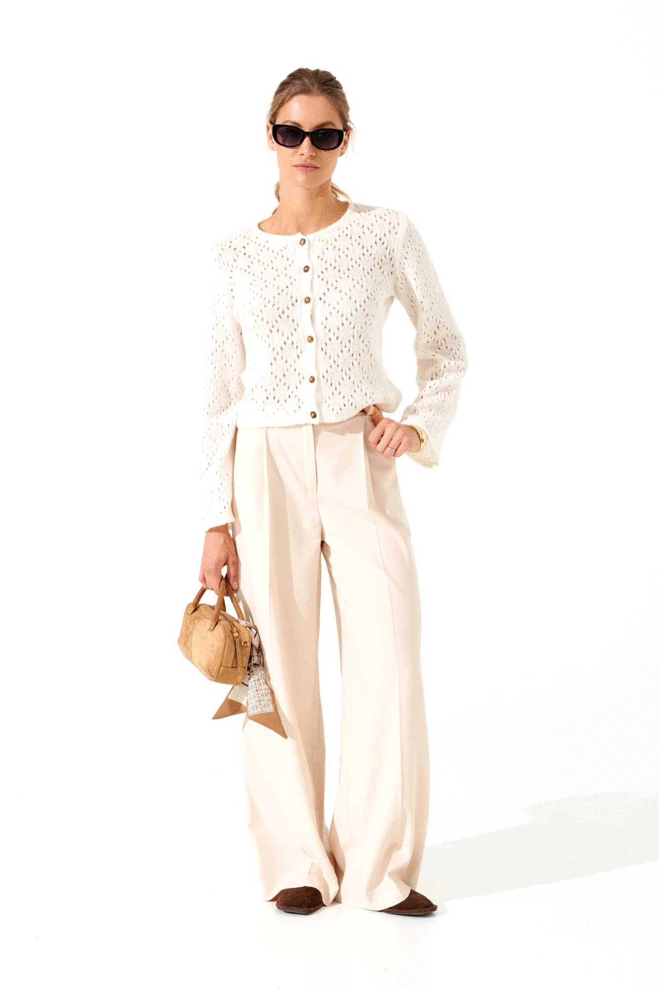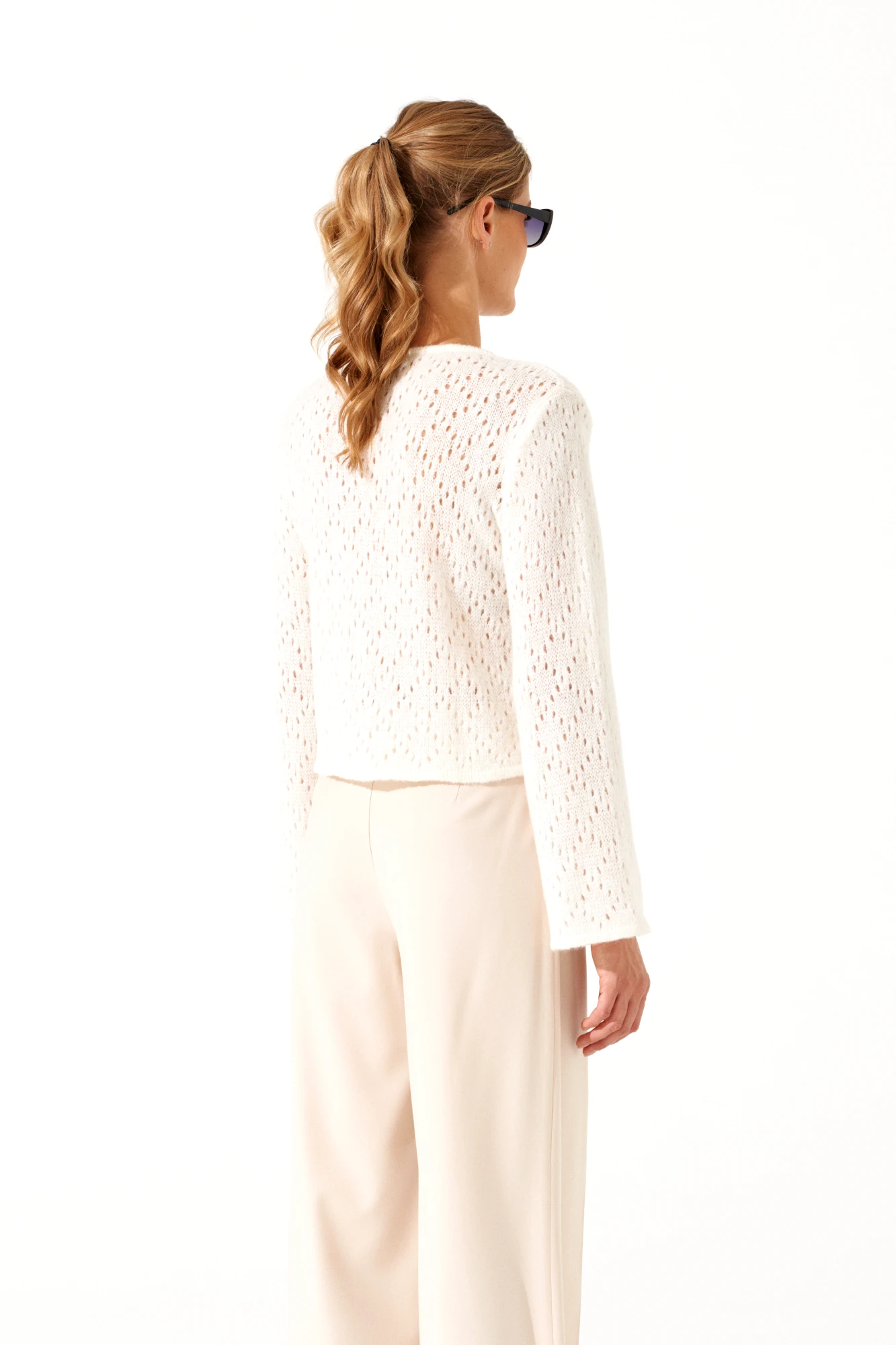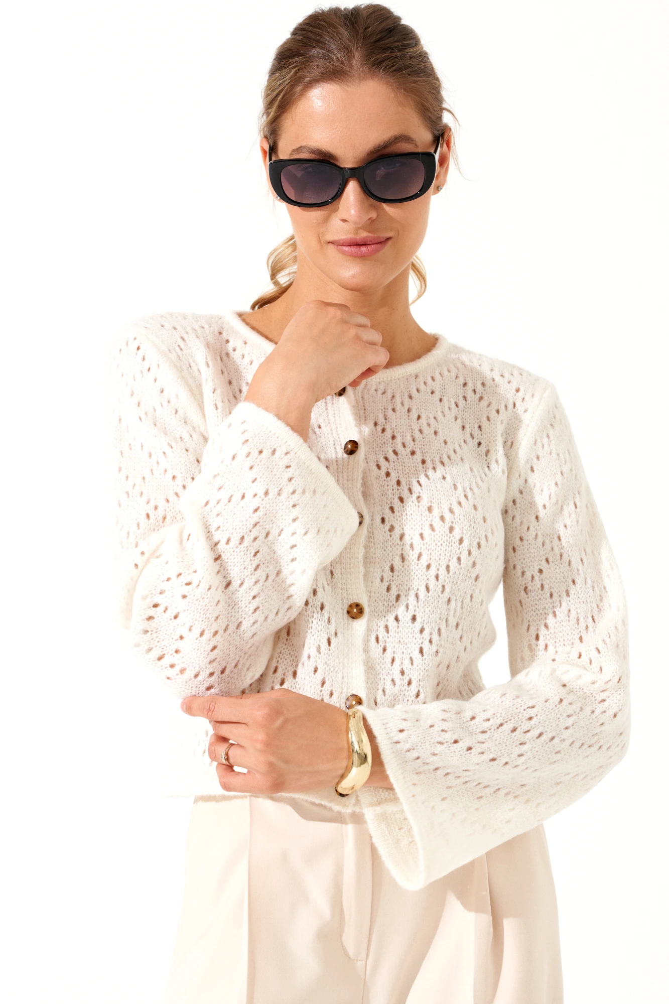Дизайн: жакет с длинными рукавами, застёжкой на пуговицы и ажурными вставками на груди. Такие детали придают изделию оригинальность и женственность;