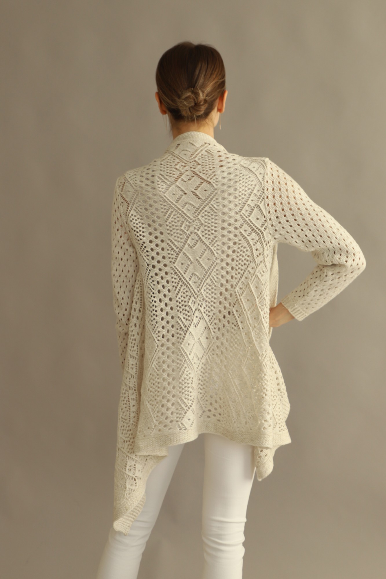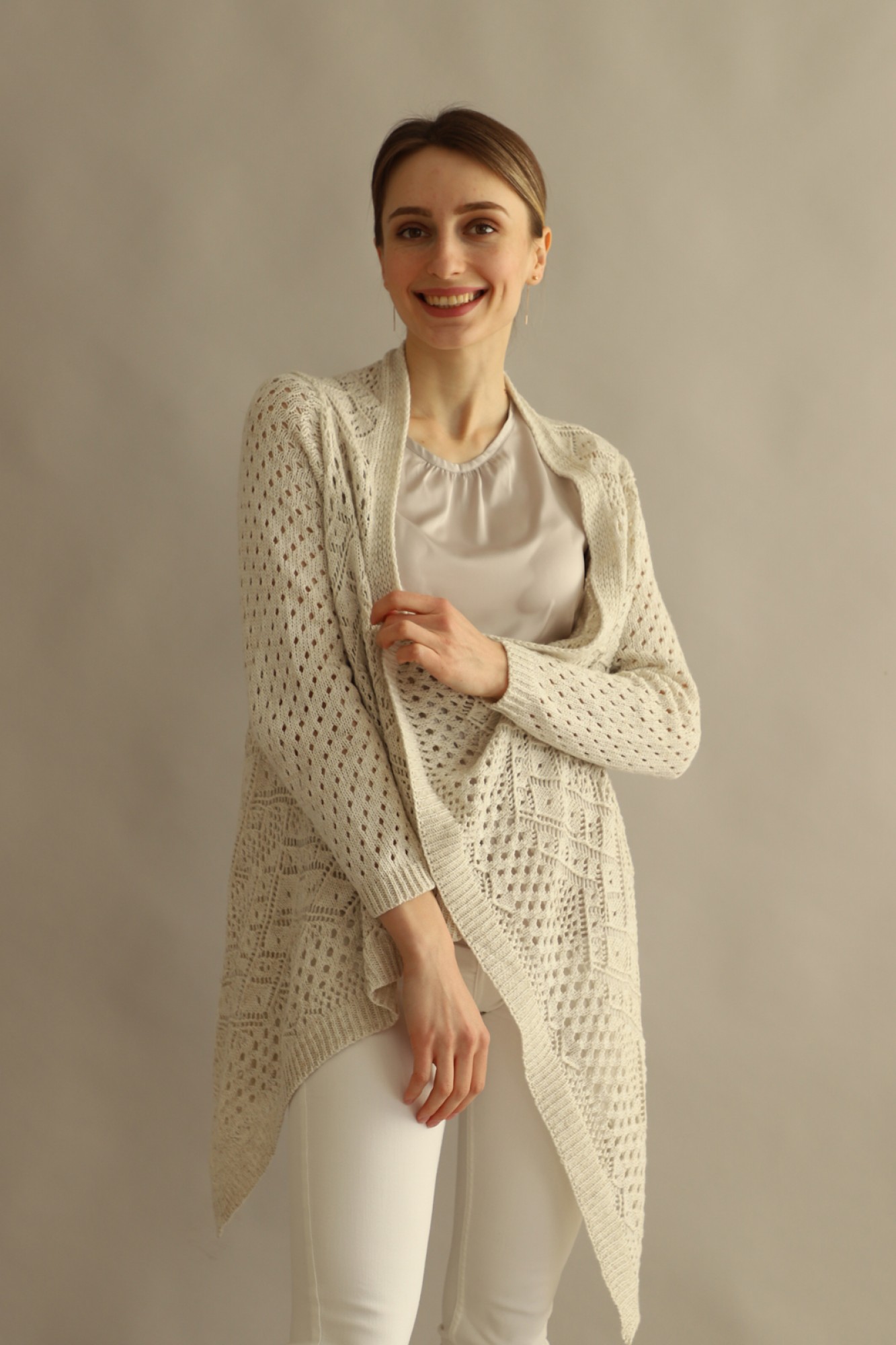 Базовый повседневный летний легкий кардиган без пуговиц, с запахом и ассиметричным передом. Свободный оверсайз крой изделия подойдет для любой фигуры. Ажурная вязка кардигана отлично сочетается со всеми предметами гардероба. Этот кардиган из хлопка отлично подходит, как для прогулок в прохладные летние дни, так и для офисной работы в любое время года. Носи с классическими брюками, брюками палаццо, костюмами, джинсами, юбками-плиссе и шортами. Идеально подходит для повседневной носки. Приятный к телу и легкий в уходе, после стирки - не линяет, не изменяет форму.