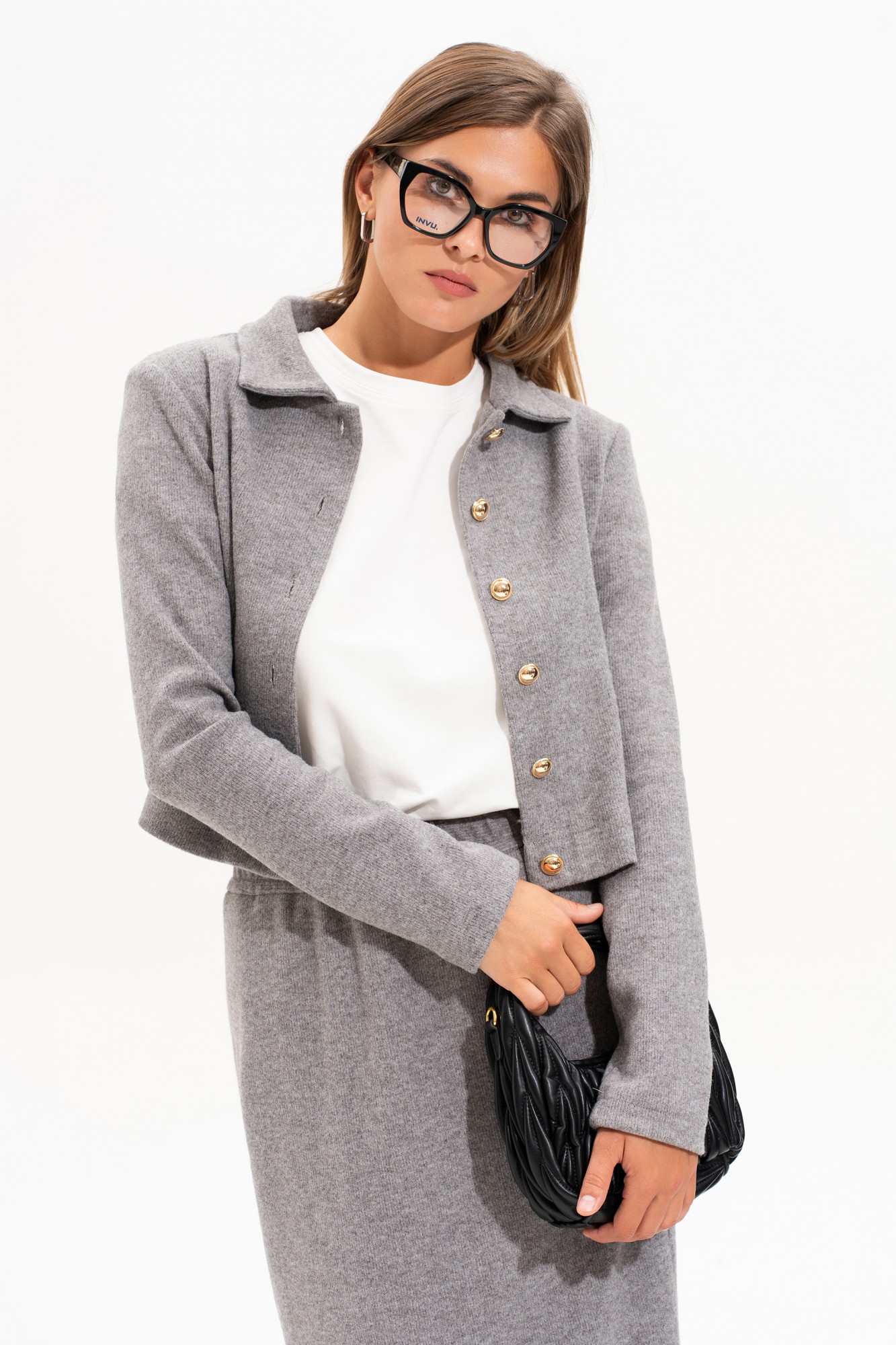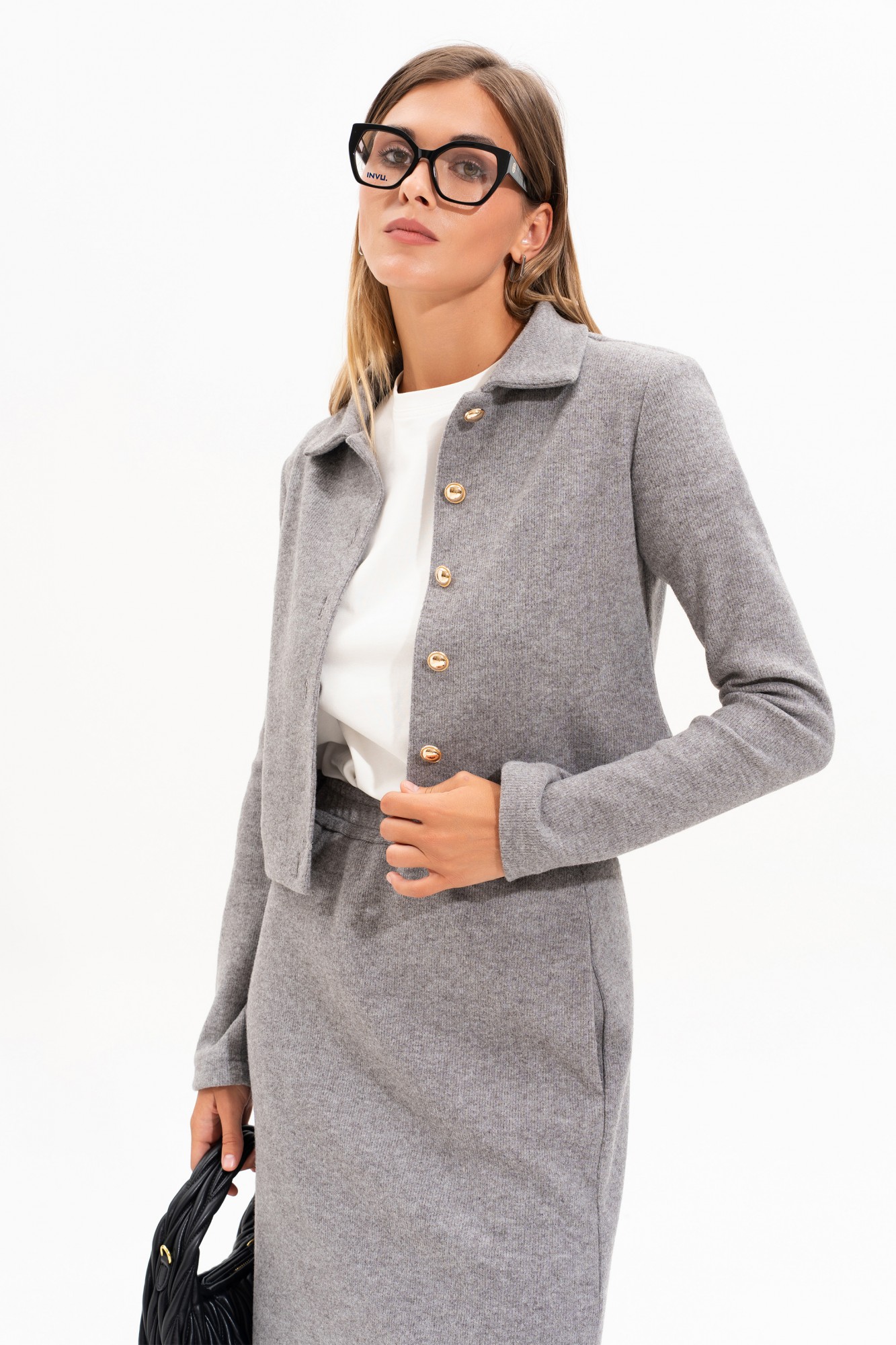 Блуза (кардиган) прямого силуэта с застежкой на золотые металлические пуговицы и воротником. Рукав втачной, с плечевой накладкой. Изделие выполнено из мягкого трикотажного полотна, которое сочетает в себе благородный внешний вид и приятную текстуру.