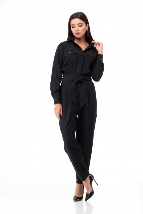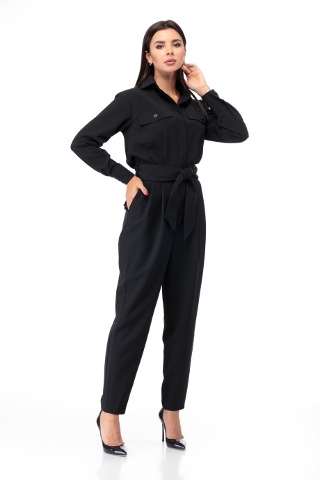 Комбинезон полуприлегающего силуэта, на передних частях обработаны нагрудные вытачки и клапаны, потайная застежка планка на петли и пуговицы, спинка с кокеткой, по центру складка на свободу движения. Нижняя часть комбинезона выполнена на широком поясе, по переду заложены складки, застежка «гульфик». Обработаны боковые карманы, на задних частях обработаны талиевые вытачки и клапаны. Воротник рубашечного типа, на стойке. Рукава втачные, длинные, на притачной манжете, с застежкой на петли и пуговицы. В комплекте съемный пояс из основной ткани.