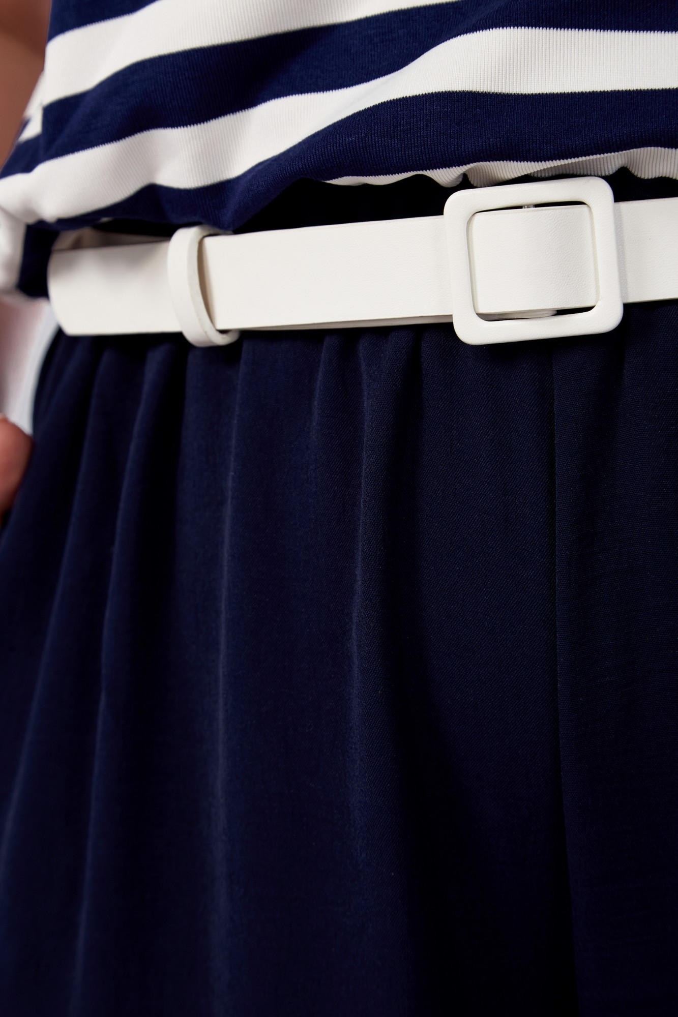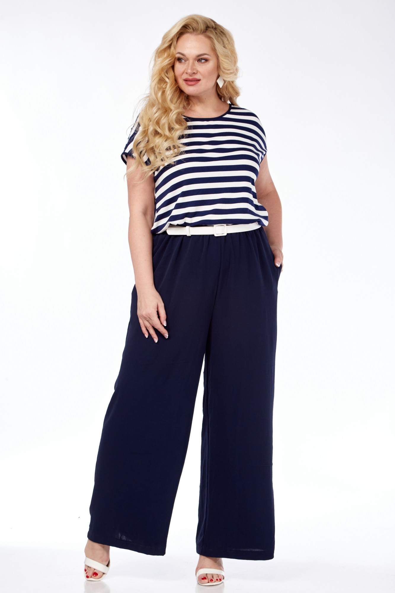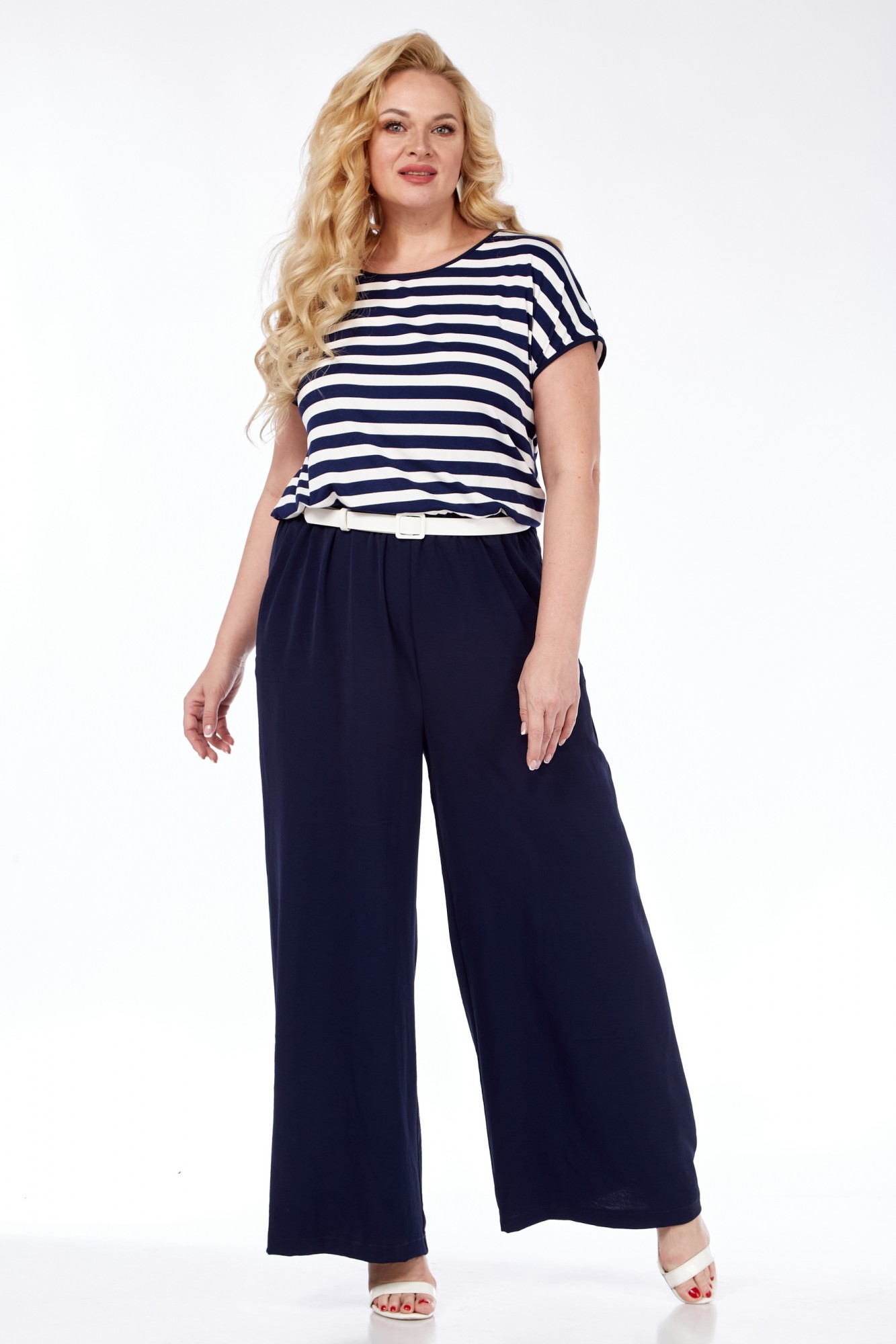 Комбинезон женский ( выполнен из двух видов ткани) свободного кроя с застежкой на 1 навесную петлю и пуговицу на горловине спинки. Лиф из трикотажа в полоску с запахом на спинке. Горловина округлой формы. Нижняя часть комбинезона с притачным поясом и резинкой. В боковых швах обработаны карманы.