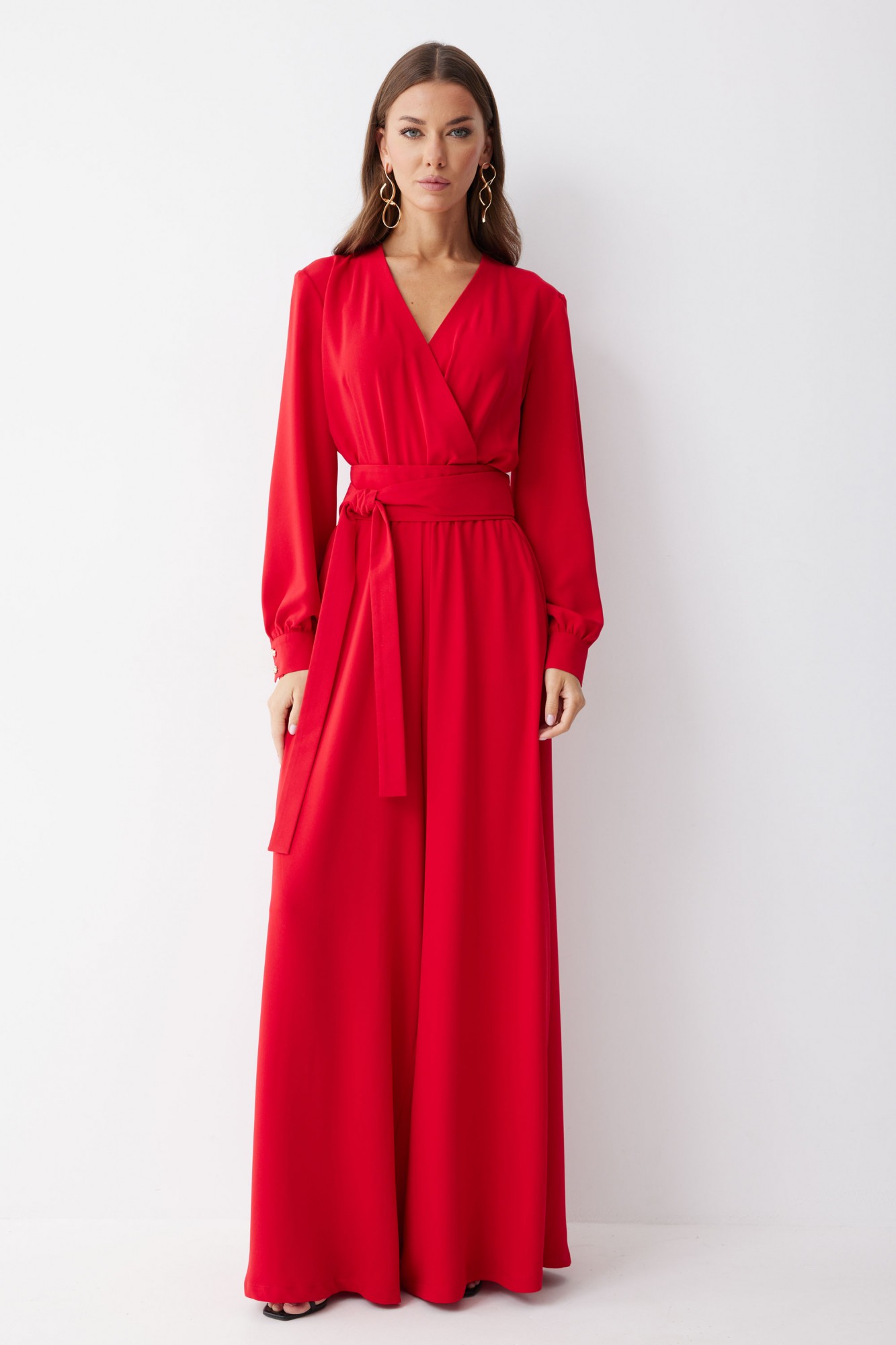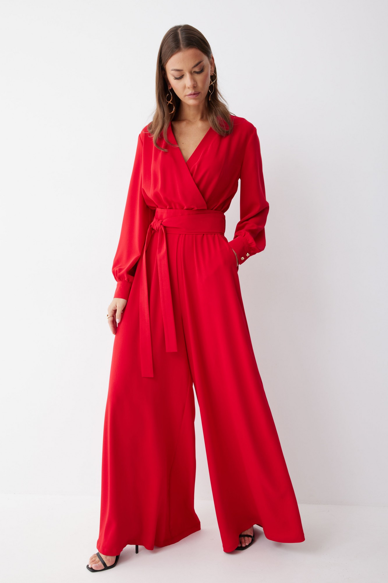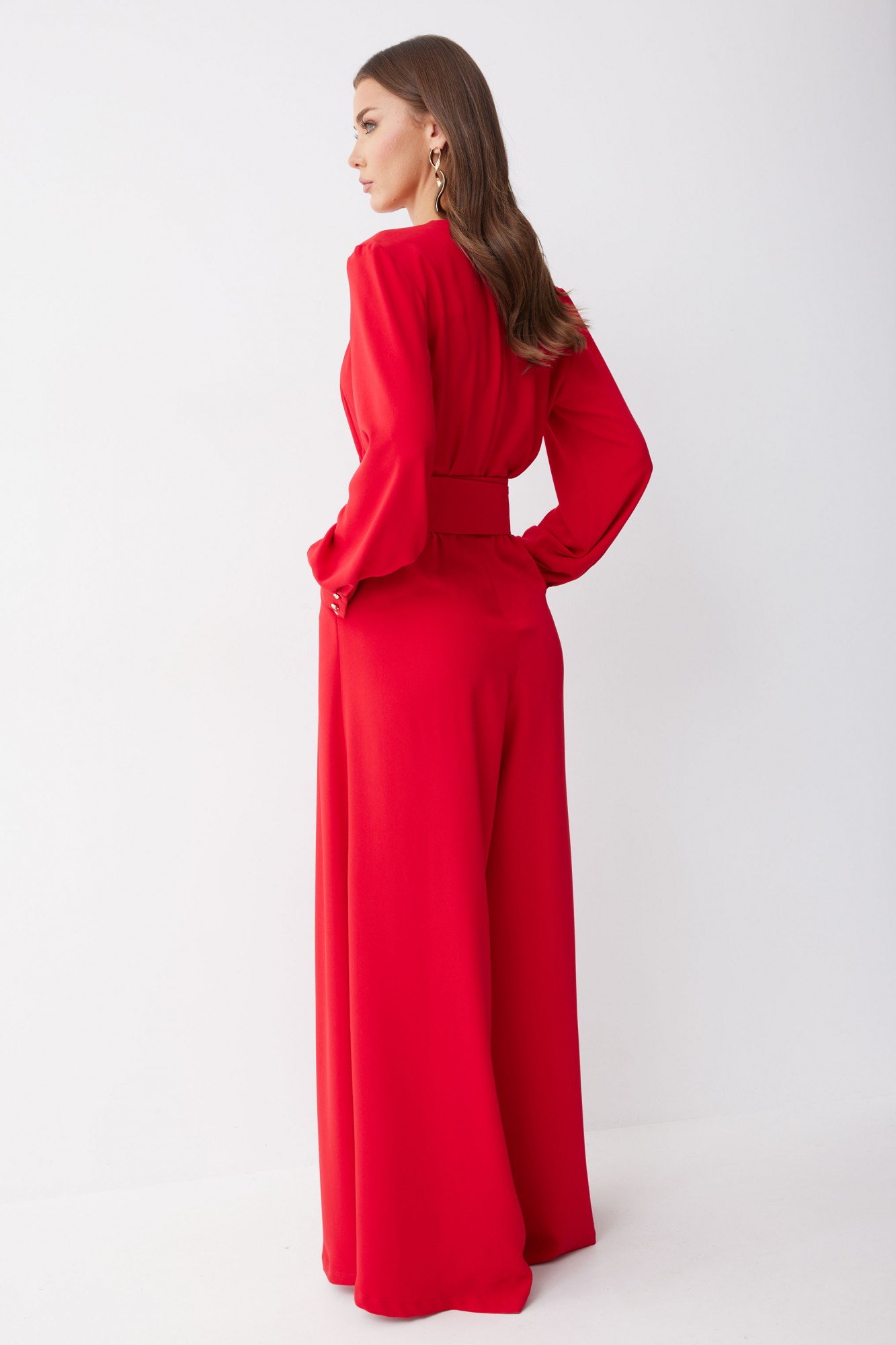 Комбинезон полуприлегающего силуэта с расширенными книзу брюками из струящейся ткани. Комбинезон отрезной по линии талии на резинке, верхняя часть комбинезона на запах. Рукав втачной, длинный, по низу манжета с застежкой на петлю и пуговицу. На спинке в среднем шве застежка на потайную молнию. В боковых швах карманы. В комплект входит пояс. Обращаем ваше внимание, что фурнитура может отличаться от фото.