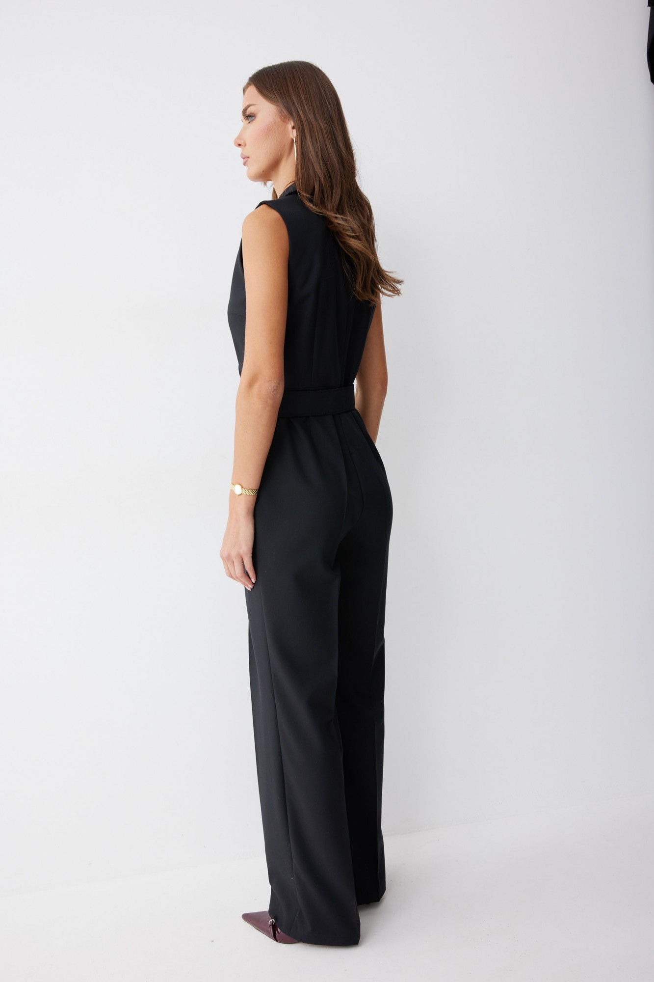Комбинезон полуприлегающего силуэта из костюмной ткани. Воротник пиджачного типа. Комбинезон отрезной по линии талии, верхняя часть комбинезона на запах. На спинке в среднем шве застежка на потайную молнию. В боковых швах карманы. По переду на лифе таллиевые и нагрудные вытачки, на брюках декоративные складки. На спинке лифа таллиевые вытачки. В комплект входит ремень. Обращаем ваше внимание, что фурнитура может отличаться от фото.