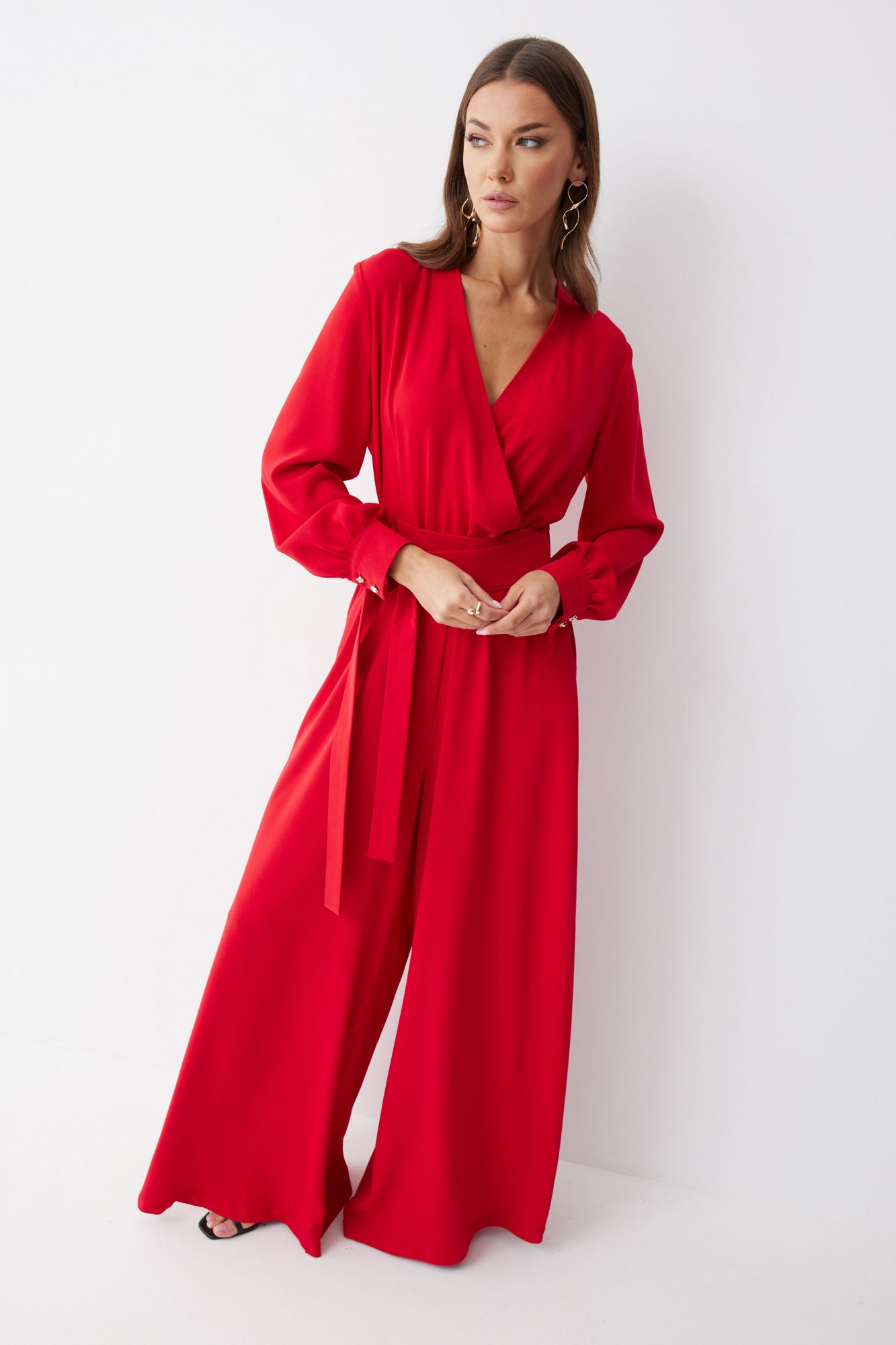 Комбинезон полуприлегающего силуэта с расширенными книзу брюками из струящейся ткани. Комбинезон отрезной по линии талии на резинке, верхняя часть комбинезона на запах. Рукав втачной, длинный, по низу манжета с застежкой на петлю и пуговицу. На спинке в среднем шве застежка на потайную молнию. В боковых швах карманы. В комплект входит пояс. Обращаем ваше внимание, что фурнитура может отличаться от фото.