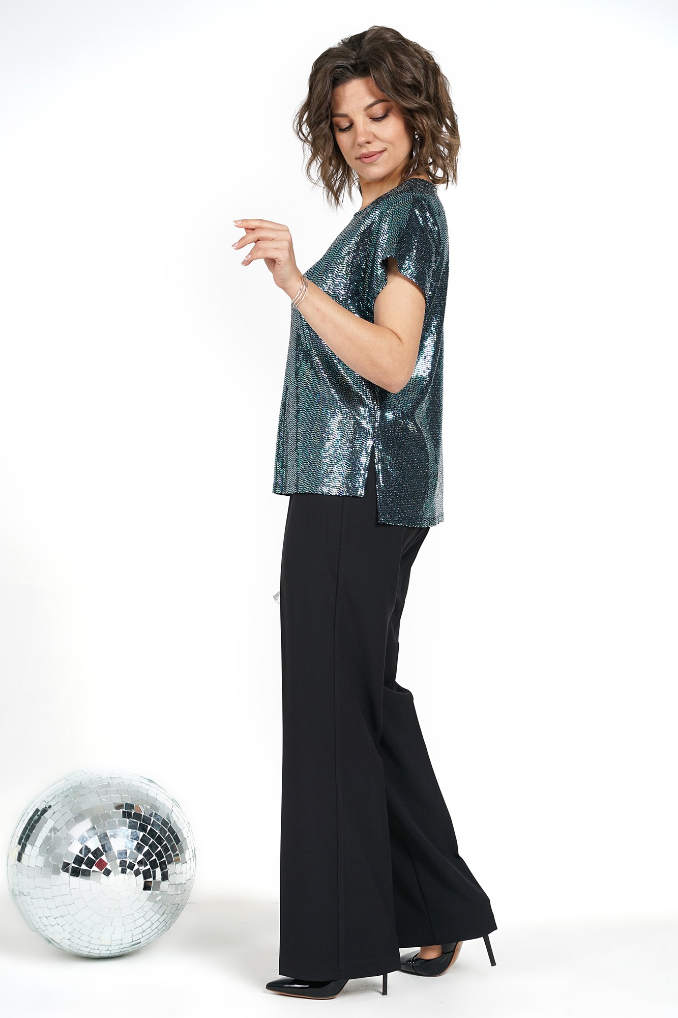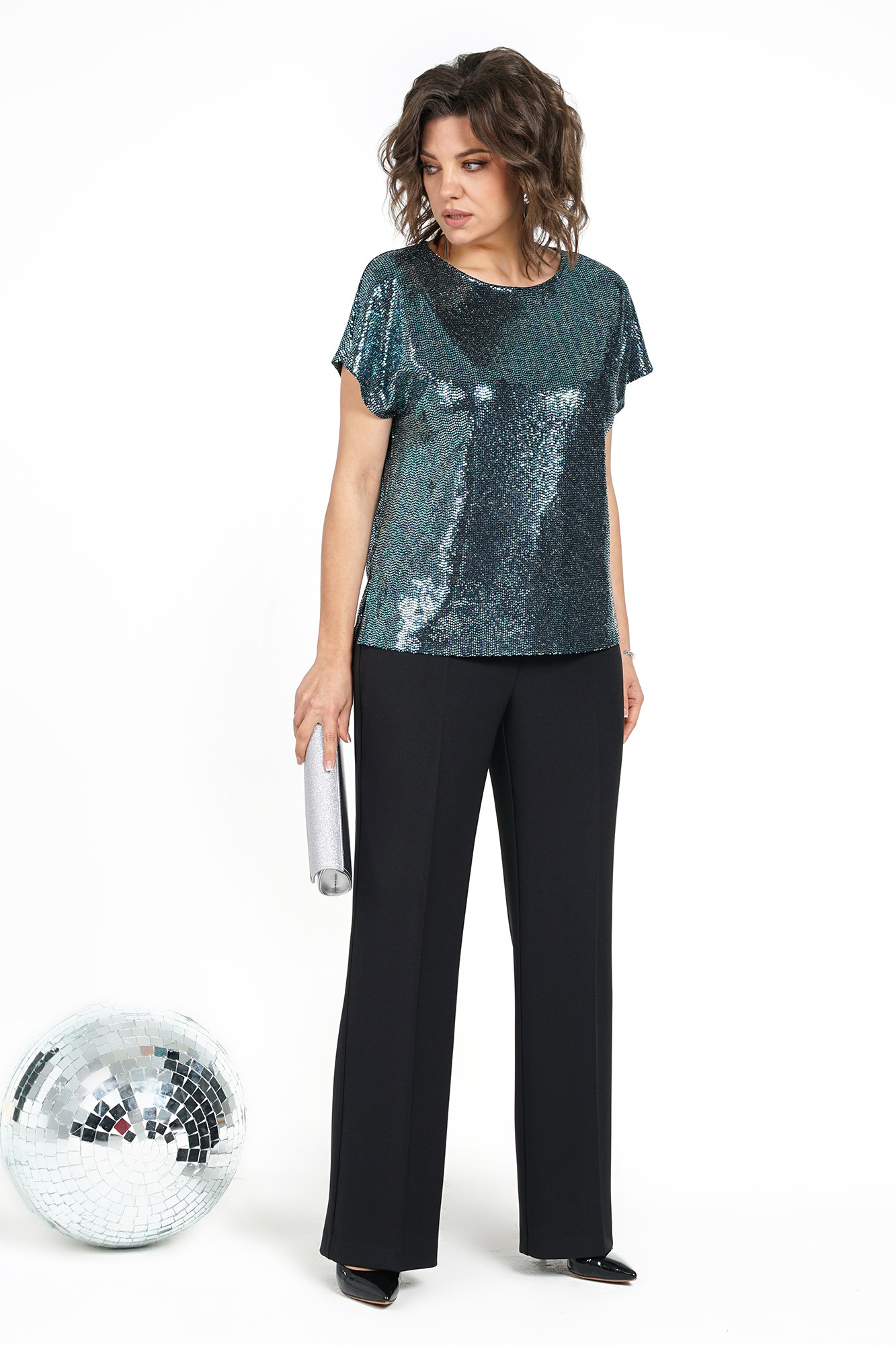 Брюки женские длинные, типа «клёш» прилегающего силуэта по бёдрам и от линии колена идут на расширение, со сгибом, на притачном поясе, застежка типа «гульфик» на молнию и по краю пояса на петлю и пуговицу. Задние части с талевыми выточками.