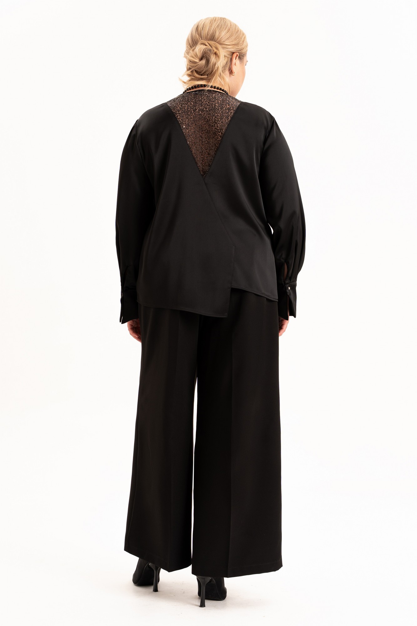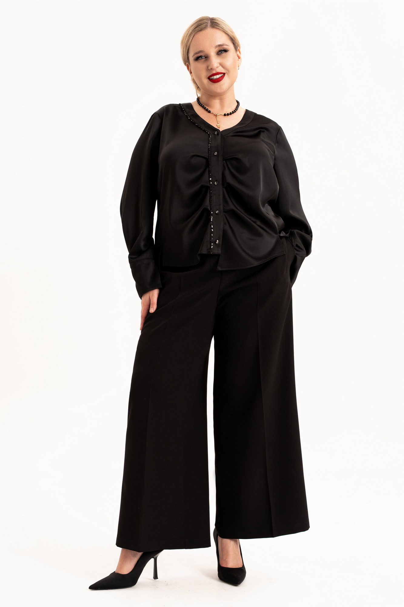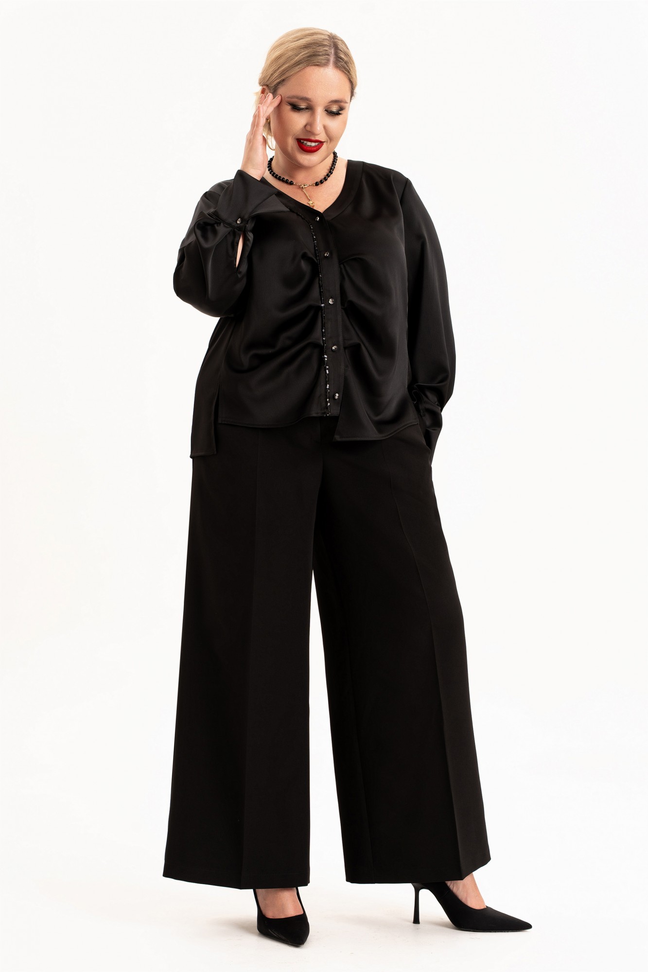 Элегантный женский брючный костюм  — настоящая находка для тех, кто ищет идеальный образ на праздник, свадьбу или важный вечер. Классический крой и свободные брюки палаццо подчёркивают достоинства фигуры и дарят комфорт. Нарядный и вечерний стиль — безупречно смотрится на большом мероприятии, создавая образ, полный уверенности и шарма. Блуза выполнена из шелковистой ткани с приятной фактурой. Блузка с длинными струящимися рукавами выглядит очень изящно и очаровательно. Блузка без воротника, застежка на петли и пуговицы по планке, с V – образным вырезом горловины. Спинка с декоративным элементом из паеток. По переду вдоль планок заложены складки и обработан кант из паеток. Изделие  асимметрично  по низу. Боковые швы перенесены в линию рельфа полочки и спинки. В рельефах полочки обработаны разрезы. Рукав со складкой по шву притачивания манжеты. Прямого силуэта с втачным , длинным рукавом. Брюки с широкими штанинами палаццо выгодно подчеркивают женственные формы, а свободный крой обеспечивает удобство в любой ситуации. На брюках обработаны карманы в боковых швах, по талии пояс с застежкой на молнию  и частично на резинке. Красивая двойка строгого силуэта — идеальное сочетание для торжеств и даже для делового офисного дресс-кода. Подходит для женщин больших и полных размеров, продуманный крой визуально стройнит, подчёркивает талию и скрывает лишнее. Создайте идеальный образ — выберите стильный женский нарядный костюм с брюками палаццо и подчеркните свою индивидуальность!