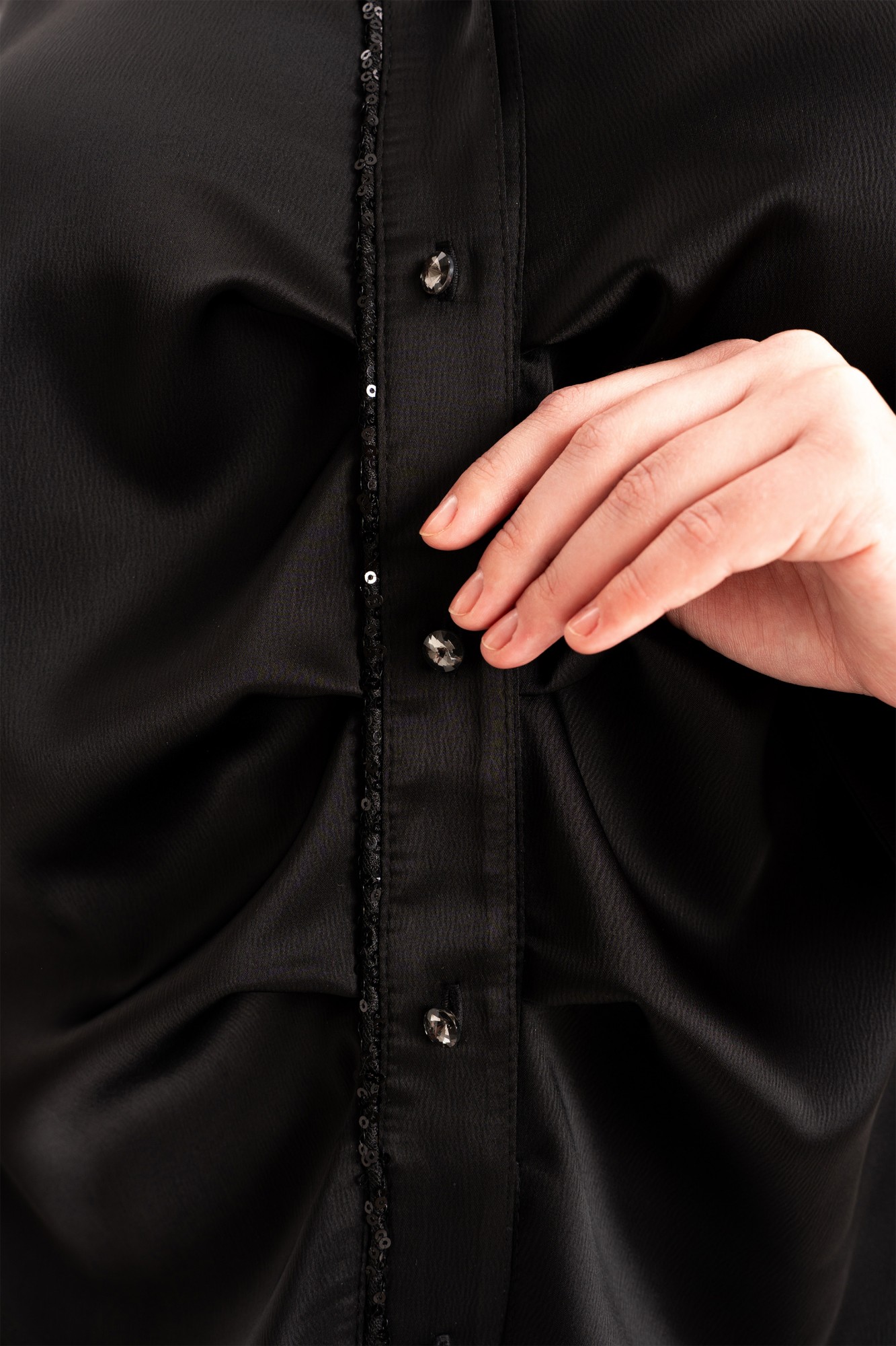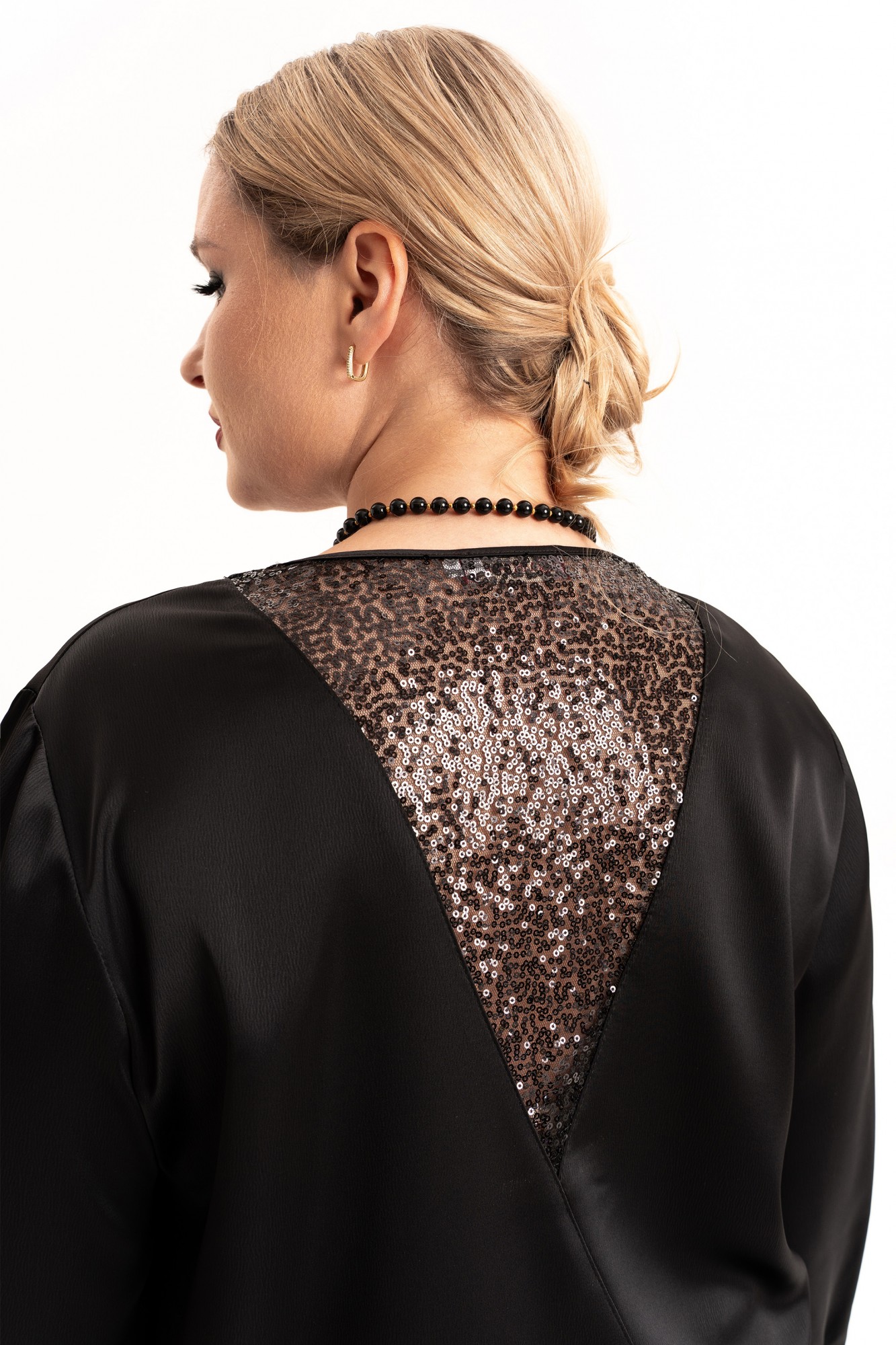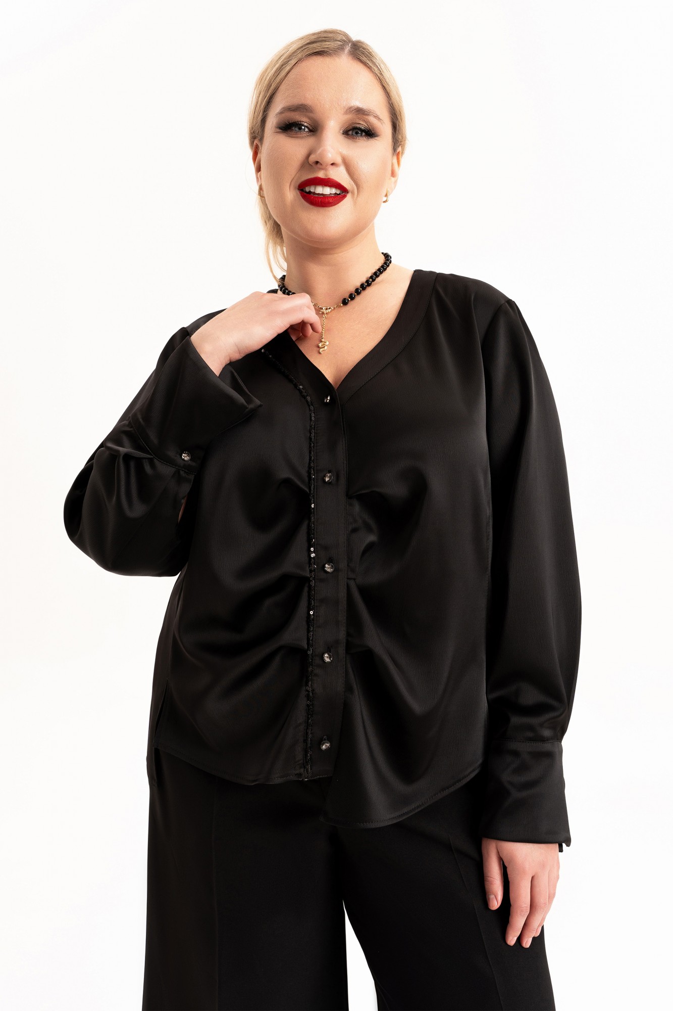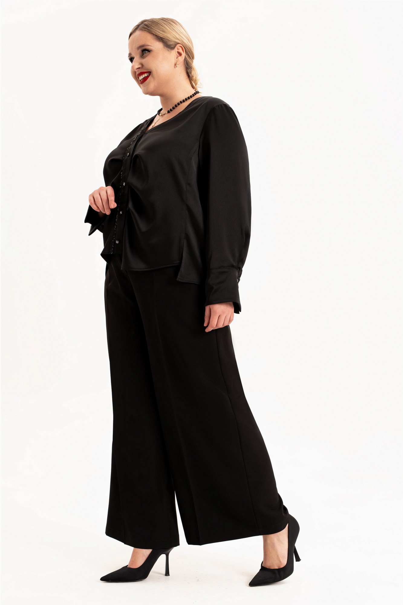 Элегантный женский брючный костюм  — настоящая находка для тех, кто ищет идеальный образ на праздник, свадьбу или важный вечер. Классический крой и свободные брюки палаццо подчёркивают достоинства фигуры и дарят комфорт. Нарядный и вечерний стиль — безупречно смотрится на большом мероприятии, создавая образ, полный уверенности и шарма. Блуза выполнена из шелковистой ткани с приятной фактурой. Блузка с длинными струящимися рукавами выглядит очень изящно и очаровательно. Блузка без воротника, застежка на петли и пуговицы по планке, с V – образным вырезом горловины. Спинка с декоративным элементом из паеток. По переду вдоль планок заложены складки и обработан кант из паеток. Изделие  асимметрично  по низу. Боковые швы перенесены в линию рельфа полочки и спинки. В рельефах полочки обработаны разрезы. Рукав со складкой по шву притачивания манжеты. Прямого силуэта с втачным , длинным рукавом. Брюки с широкими штанинами палаццо выгодно подчеркивают женственные формы, а свободный крой обеспечивает удобство в любой ситуации. На брюках обработаны карманы в боковых швах, по талии пояс с застежкой на молнию  и частично на резинке. Красивая двойка строгого силуэта — идеальное сочетание для торжеств и даже для делового офисного дресс-кода. Подходит для женщин больших и полных размеров, продуманный крой визуально стройнит, подчёркивает талию и скрывает лишнее. Создайте идеальный образ — выберите стильный женский нарядный костюм с брюками палаццо и подчеркните свою индивидуальность!