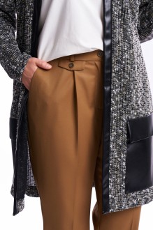 Комплект женский, состоит из кардигана и брюк. Кардиган выполнен из ткани - букле, прямого силуэта, без застежки и без подкладки. По переду накладные карманы с клапанами и планка из эко кожи. Рукав втачной. Брюки прямые с мягкими складками по переду на поясе. Сзади по поясу резинка. Застежка на молнии. Карманы в боковом шве.