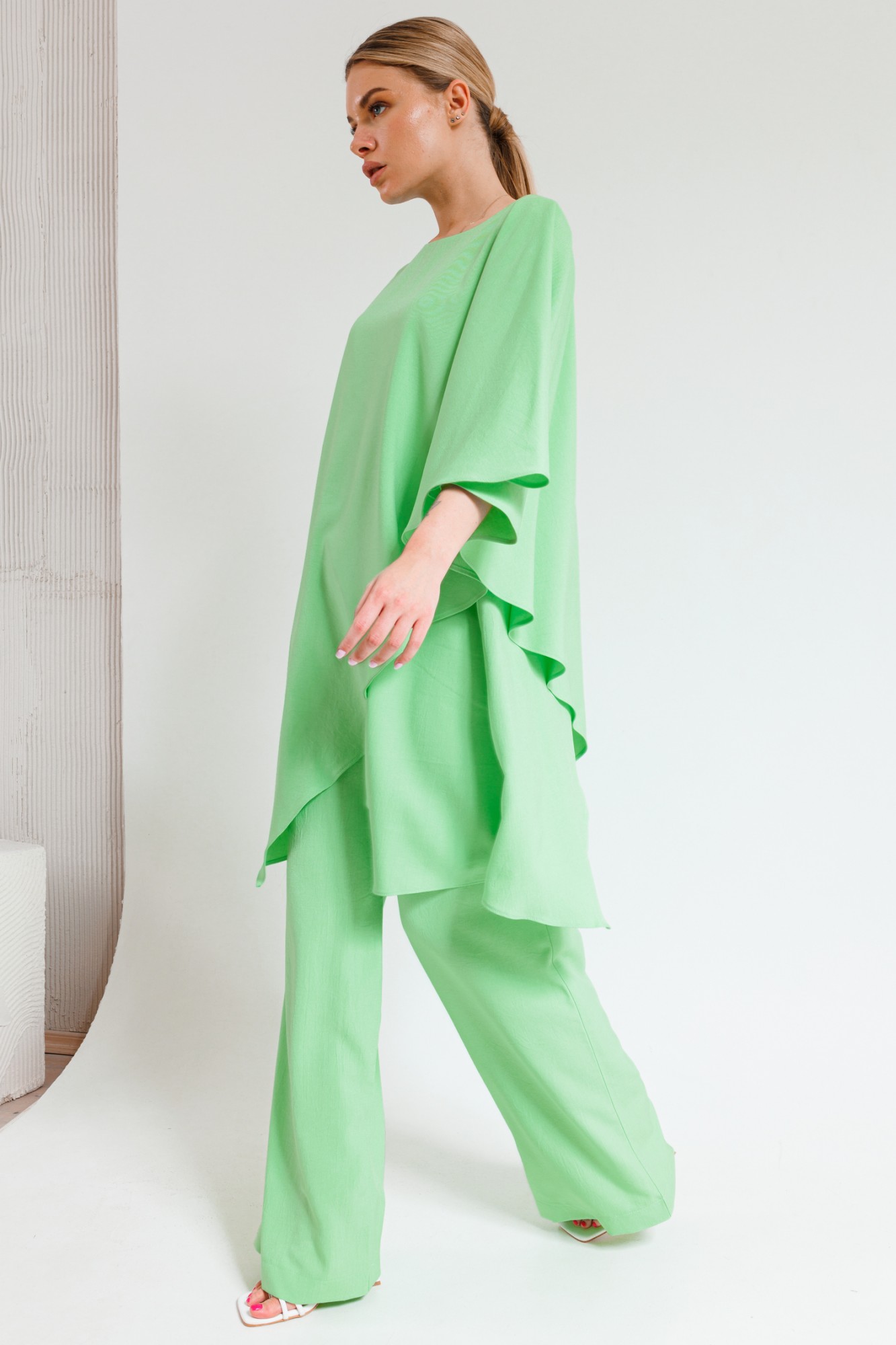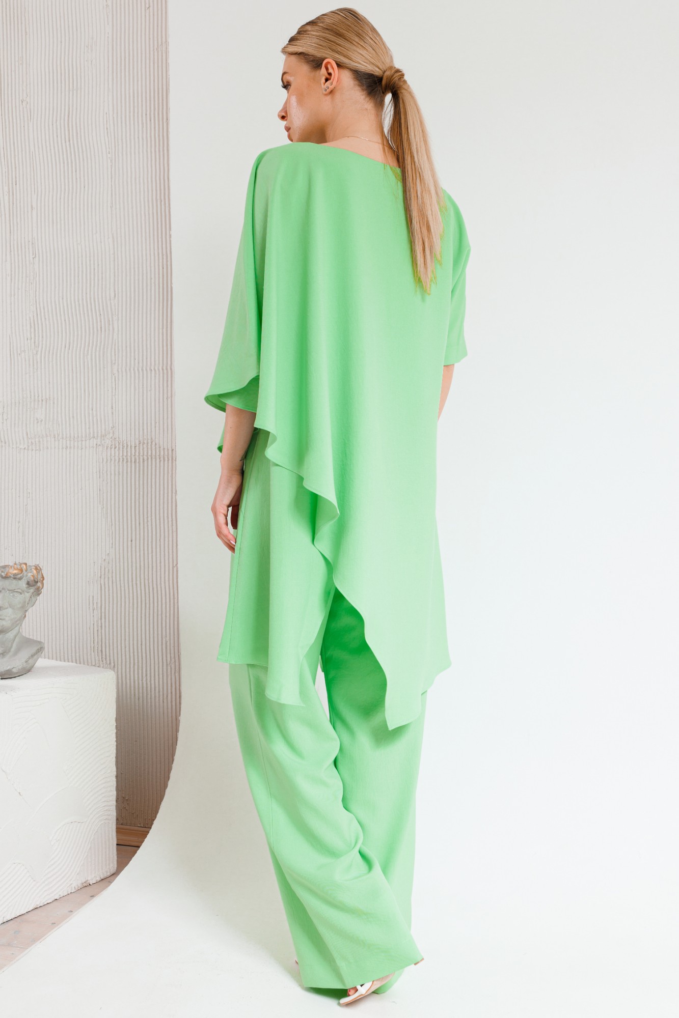 Костюм двухпредметный: состоящий из Блузки и брюк .Блузка-Туника А-силуэта,двойная с фигурным низом.Вырез горловины круглый,рукав летучая мышь.Брюки палаццо свободного кроя с притачным поясом на резинеке.В боковых шах прорезные карманы.