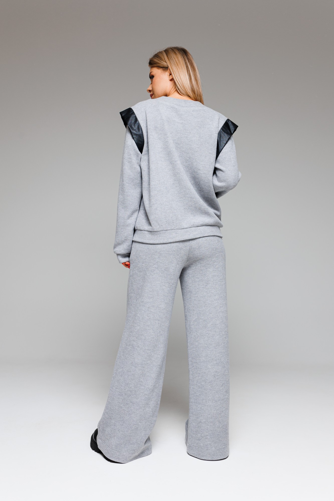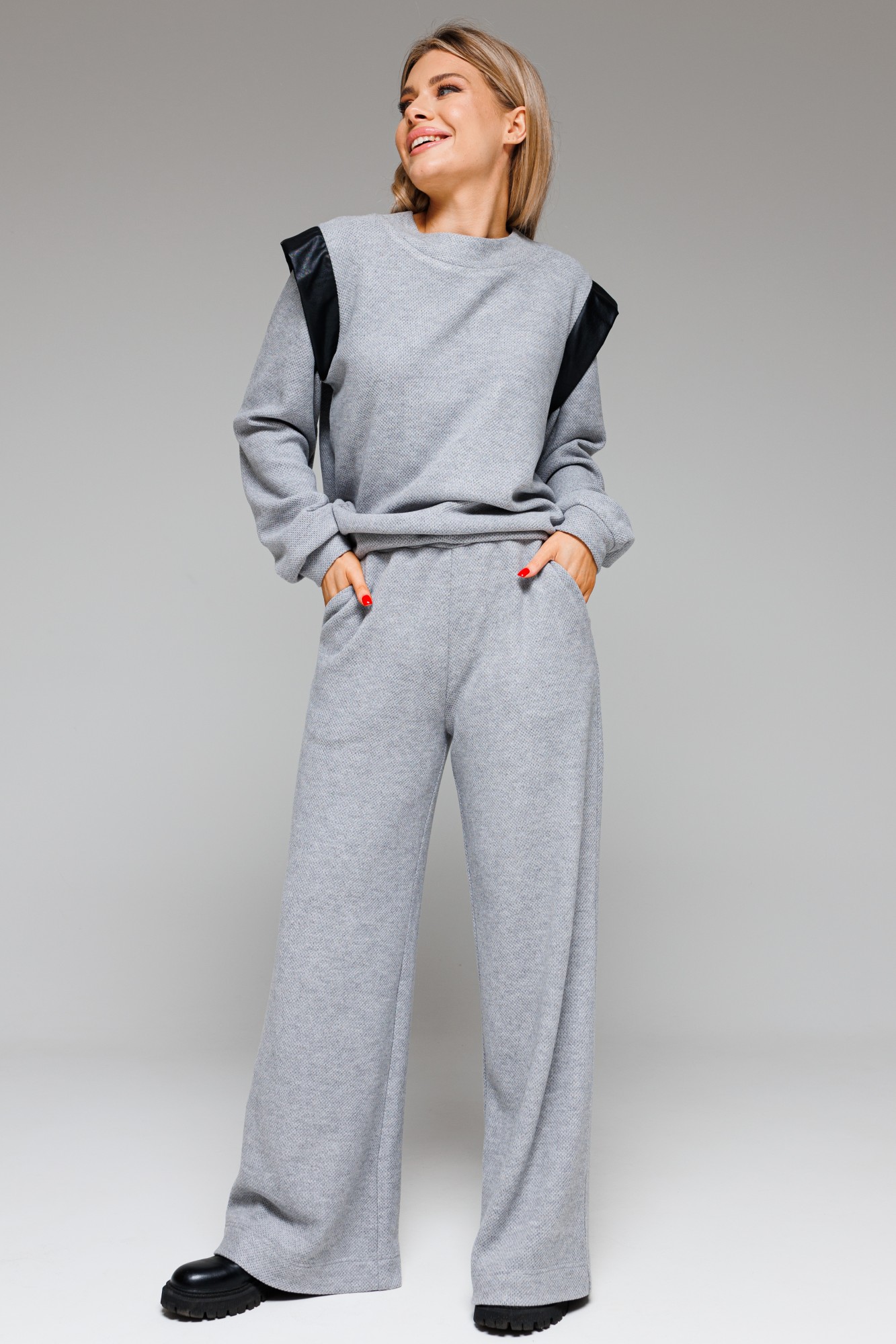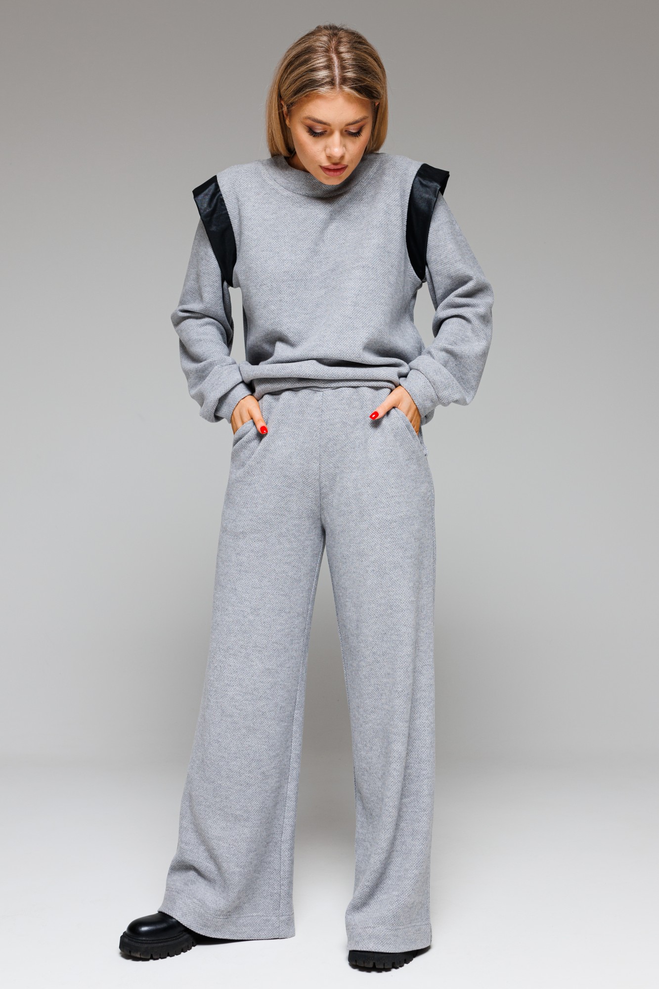 Костюм двойка.Свитшот прямого силуэта.Вырез горловины круглый,рукав втачной на манжете.По рукаву притачные "крылышки" из экокожи.По низу свитшота притачная планка.Брюки-палаццо.На притачном поясе с резинкой.В боковых швах действующие угловые карманы.