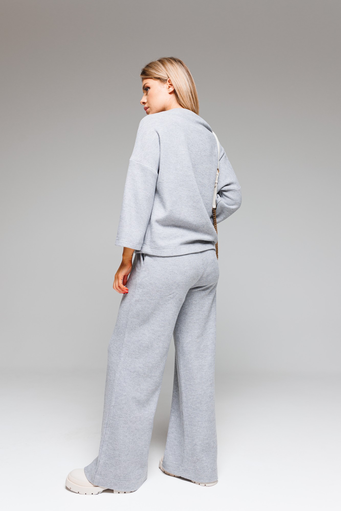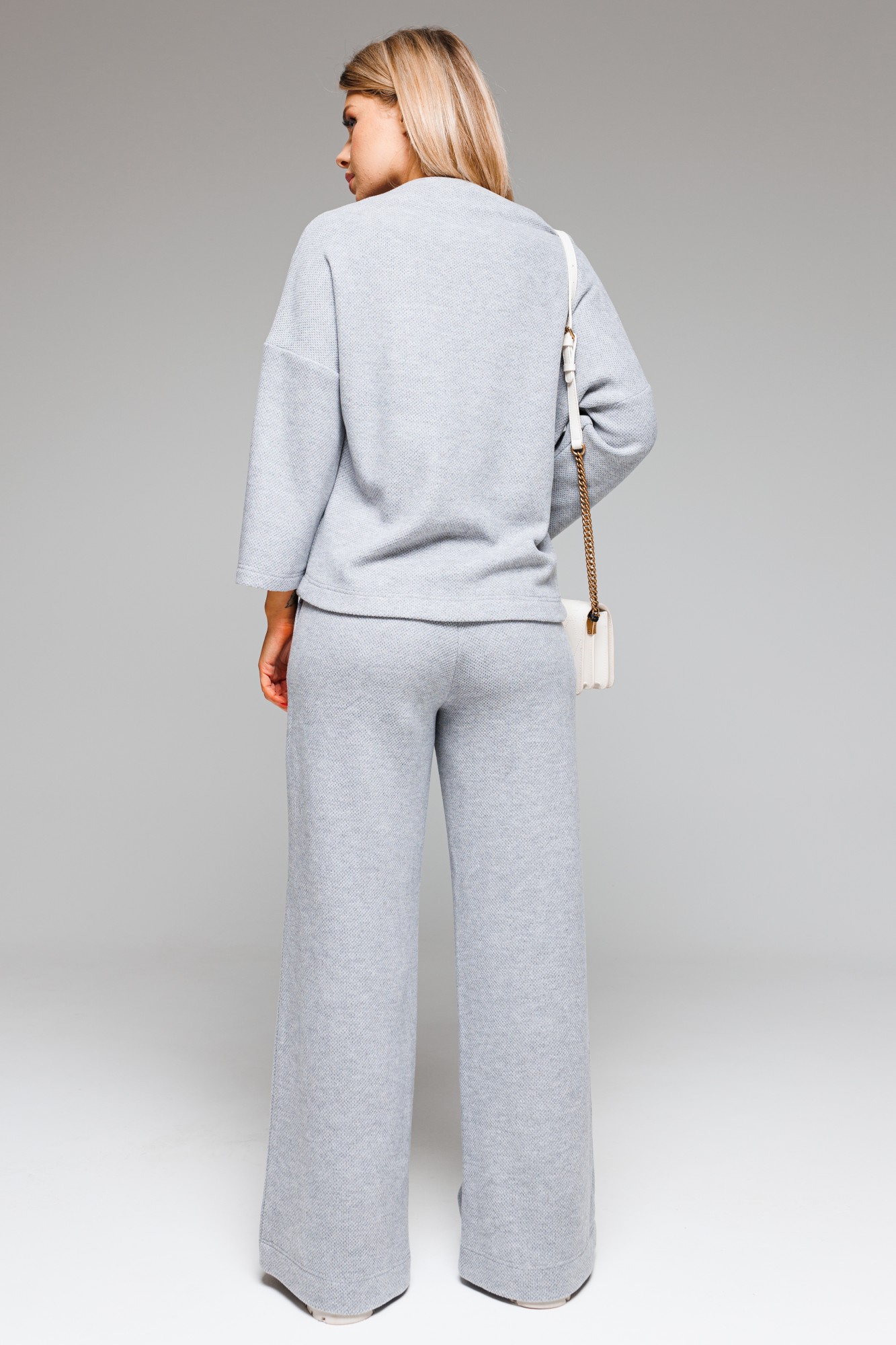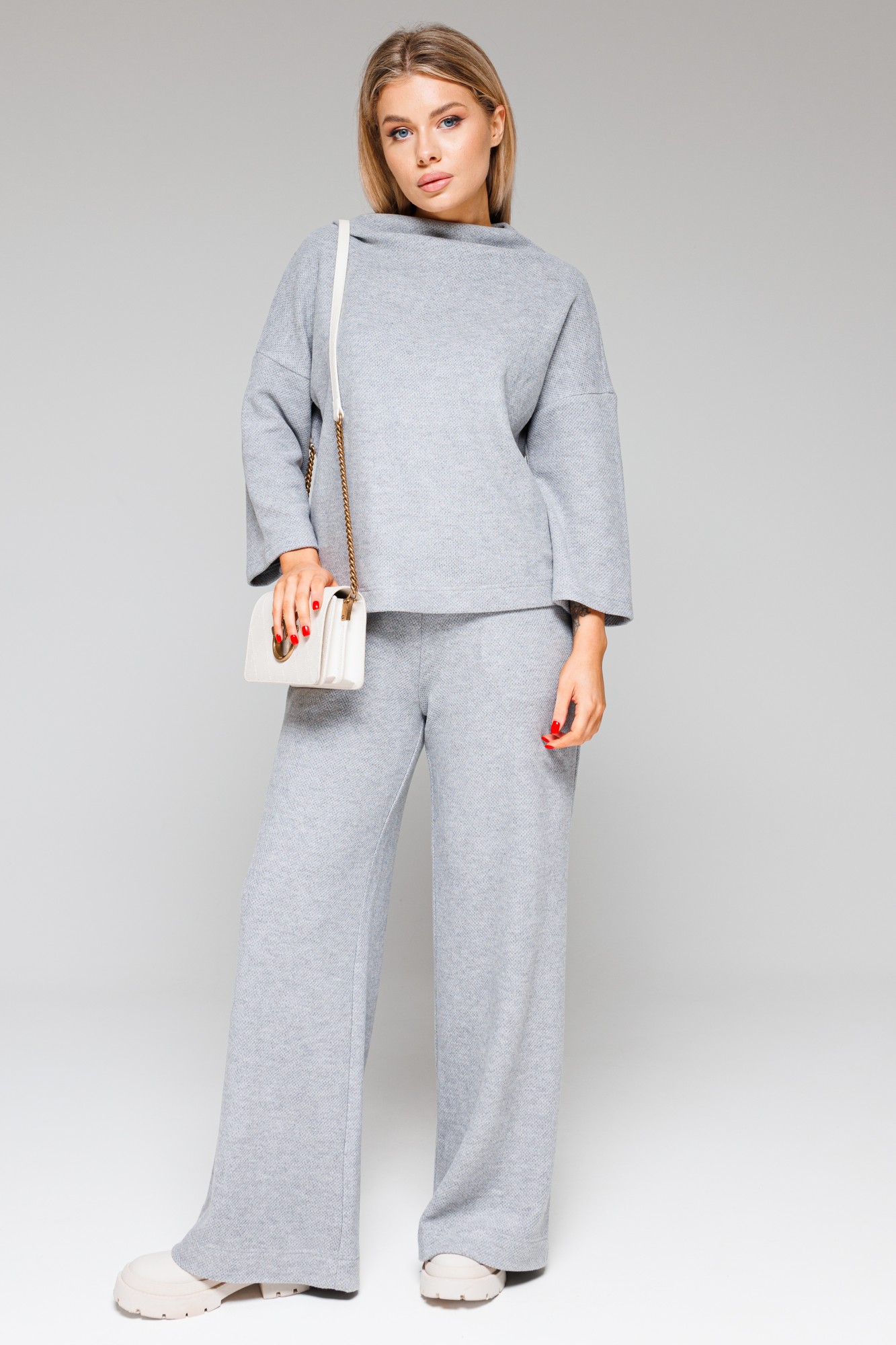 Костюм двухпредметный: состоит из джемпера и брюк.Джемпер выполнен из трикотажной ткани с цельнокроеной стойкой,спущенным плечом.Рукав 7/8. Брюки-палаццо.На притачном поясе с резинкой.В боковых швах действующие угловые карманы.