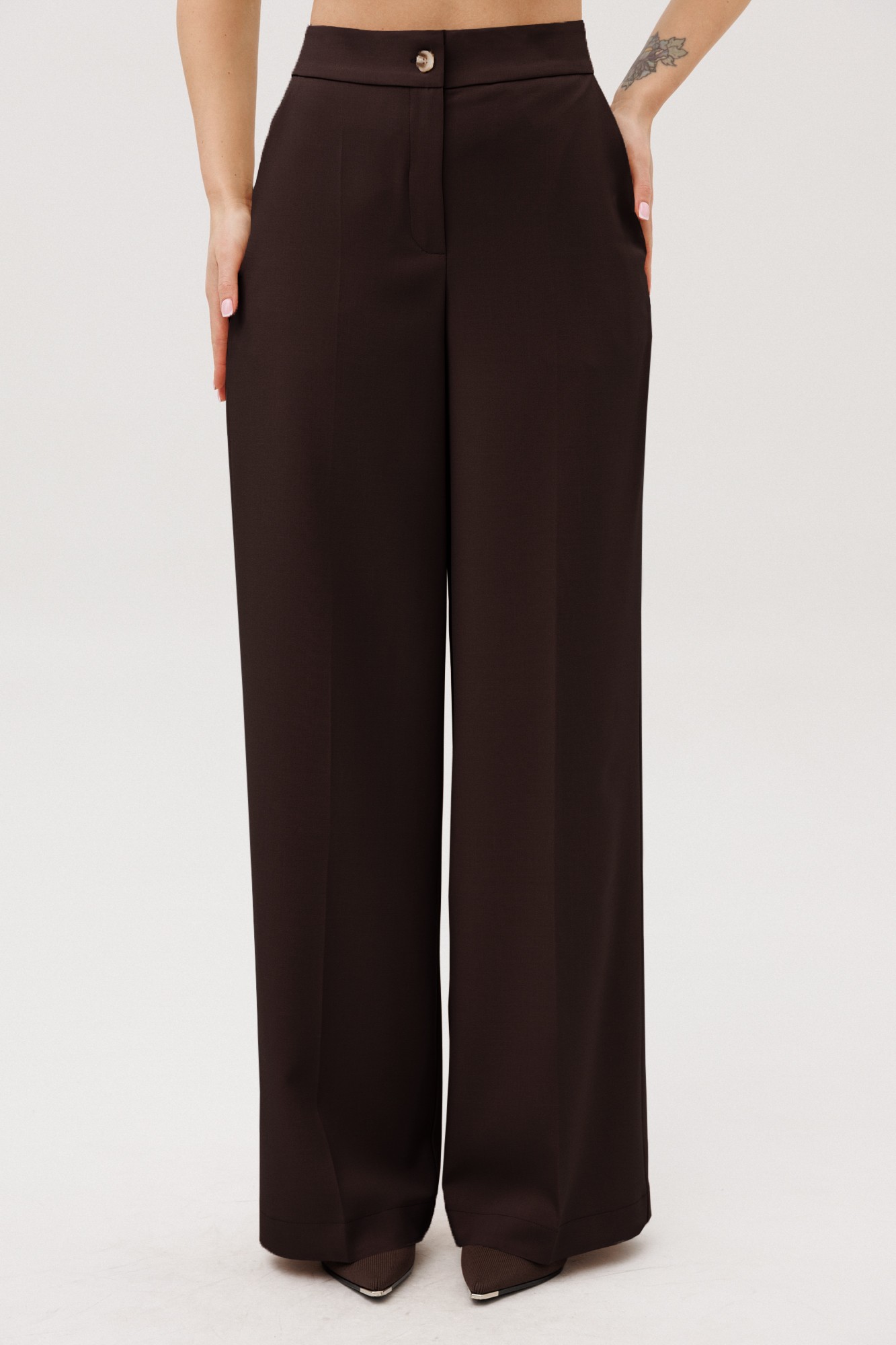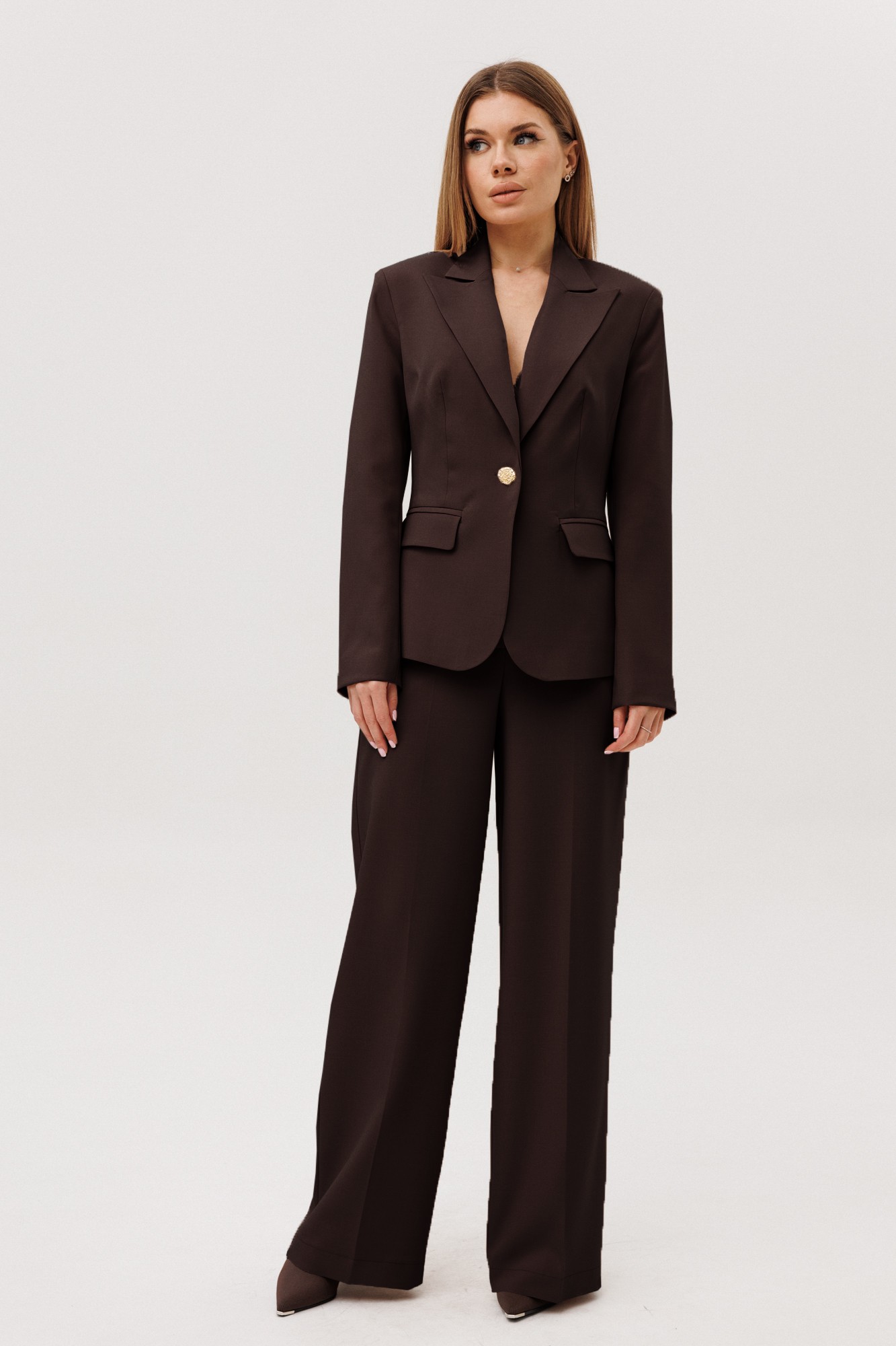 Костюм двухпредметный состоящий из жакета и брюк. Жакет прилегающего силуэта, с v-образным вырезом, прорезными карманами и клапаном, застежка на петлю пуговицу. На рукавах декоративные пуговицы. Изделие на подкладке. Брюки прямого кроя с высокой посадкой на притачном поясе, застежка на тесьму-молнию гарантирует удобство при носке. Удобные боковые карманы повышают функциональность изделия. Модель выполнена из качественного тканевого материала, который хорошо держит форму и подходит для деловых встреч, официальных мероприятий или повседневной носки в офисе. Этот костюм — прекрасный выбор для женщин, ценящих в одежде универсальность и изысканность.