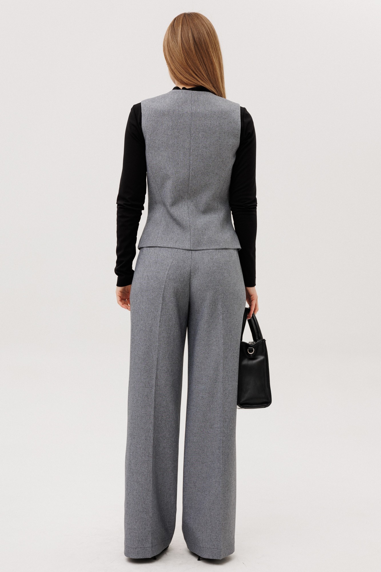 Костюм трехпредметный состоящий из жилета, гольфа, брюк .Жилет прилегающего силуэта, с V- образным вырезом, на подкладке. По переду рельефа карманы "листочки", застёжка на петли-пуговицы. По спинке вытачки. Джемпер женский прилегающего силуэта с втачным одношовным рукавом с воротником-стойкой. Элегантные женские брюки прямого кроя ,по переду на брючинах стрелки. Модель с высокой посадкой на притачном поясе обеспечивает идеальное прилегание. Спереди расположена практичная застежка на тесьму-молнию, добавляющая удобства при носке. Брюки укомплектованы функциональными боковыми карманами, что придает модели дополнительную практичность и удобство. Эта модель идеально подойдет как для офиса, так и для создания повседневных стильных образов.