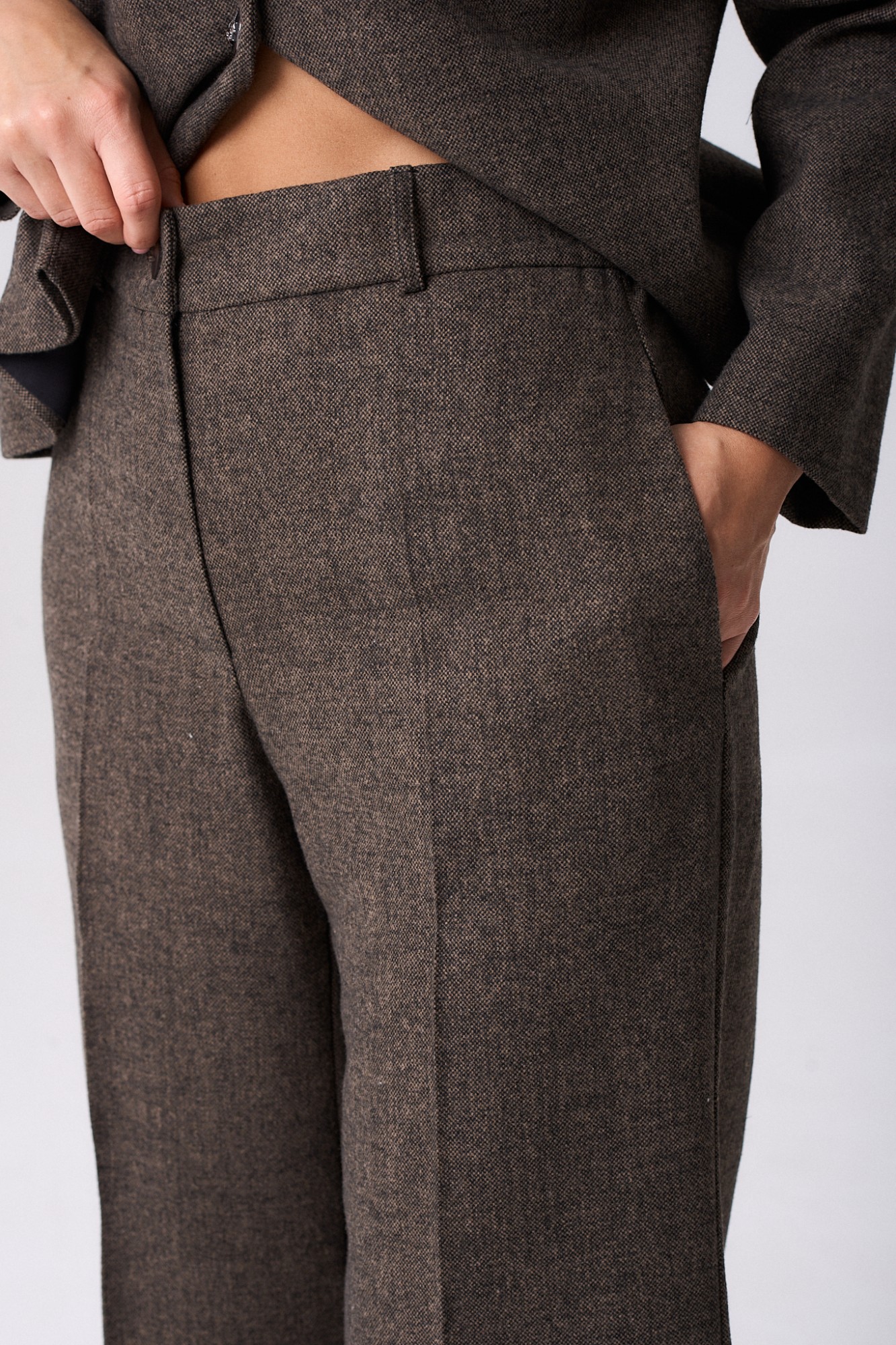 Костюм женский из костюмной ткани состоящий из жакета полуприлегающего силуэта на подкладки и брюк классического прямого кроя. Жакет с круглой горловиной и центральной застёжкой на петли и декоративные пуговицы. По полочке обработана нагрудная вытачка, в области груди настрочен клапан, закрепленный пуговицей. Спинка цельнокроеная. Рукав втачной двухшовный, длинный. Брюки прямого силуэта в боковых швах обработаны карманы. Верхний срез обработан притачным поясом со шлёвками для ремня, по задним половинкам для лучшей посадки вставлена резинка, застегивающийся на петлю и пуговицу, застёжка центральна с гульфиком и откоском на тесьму молнию.