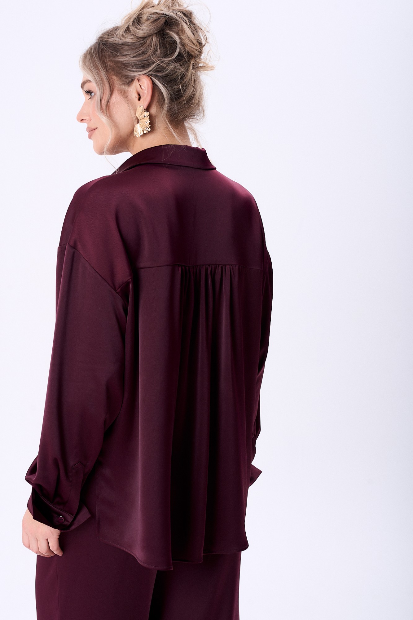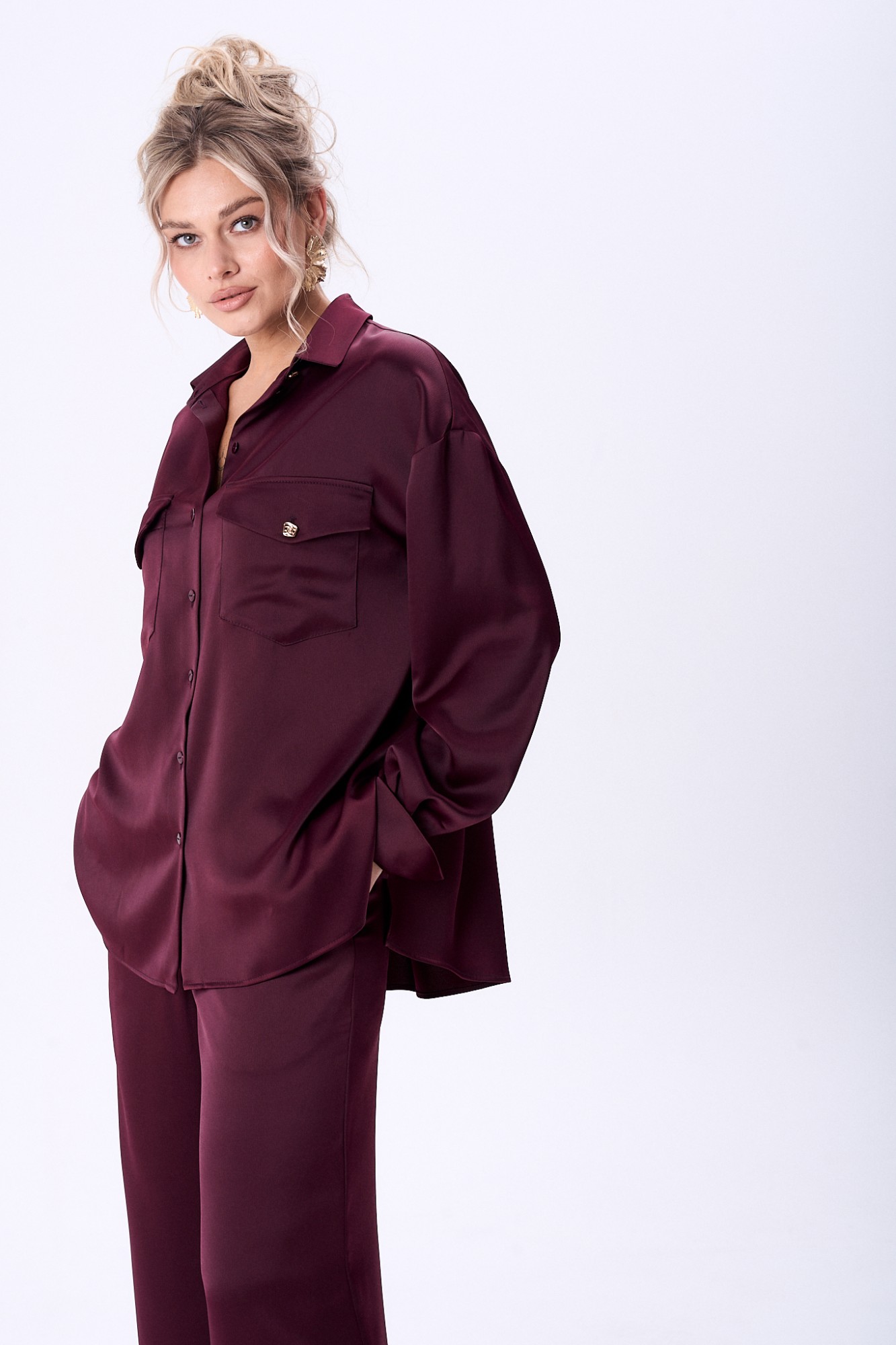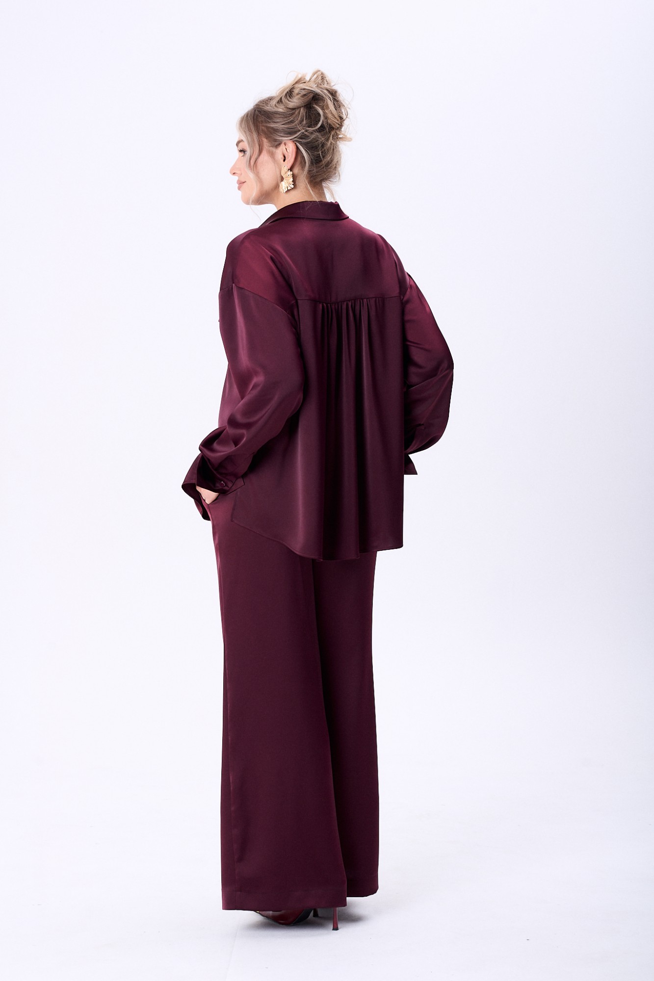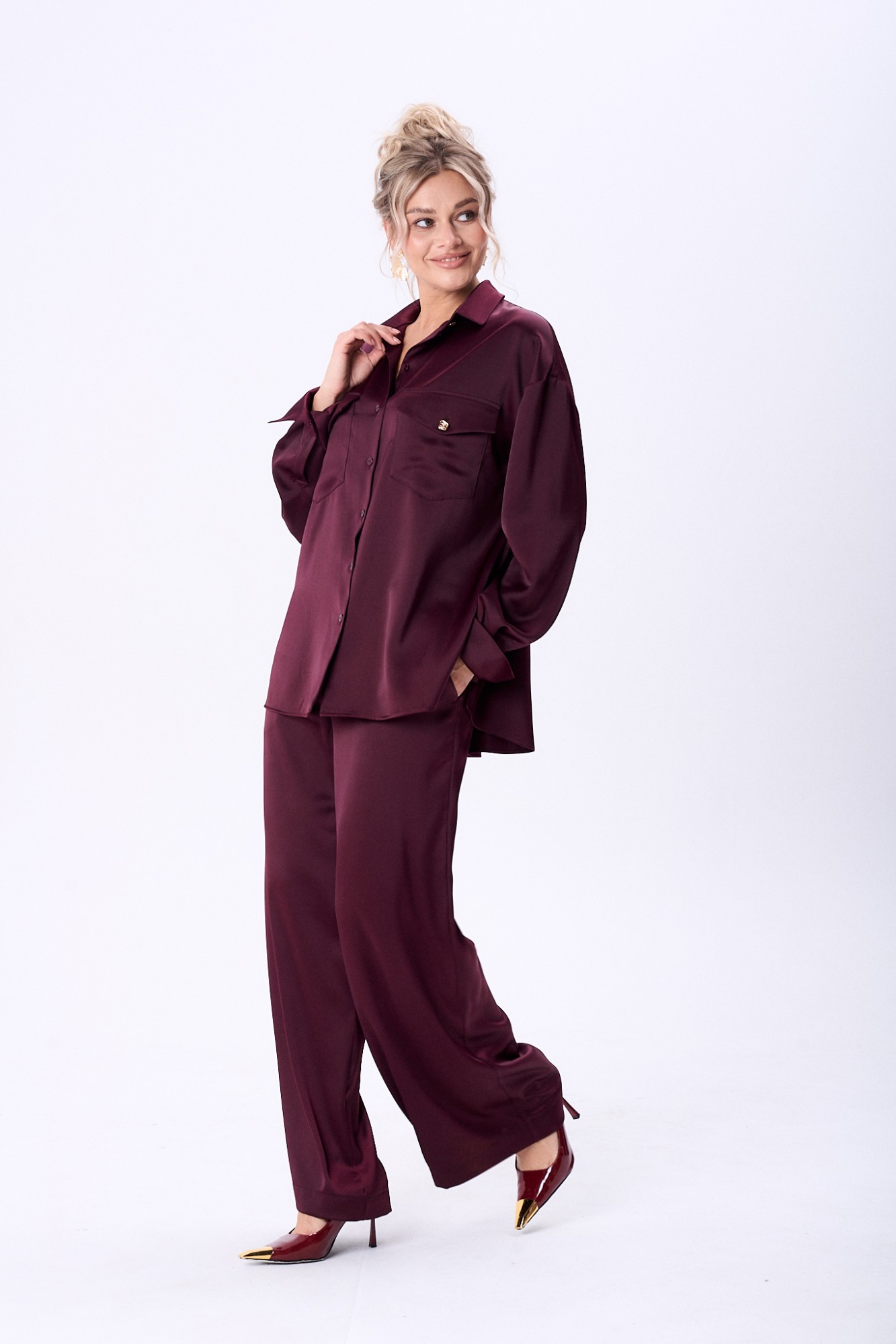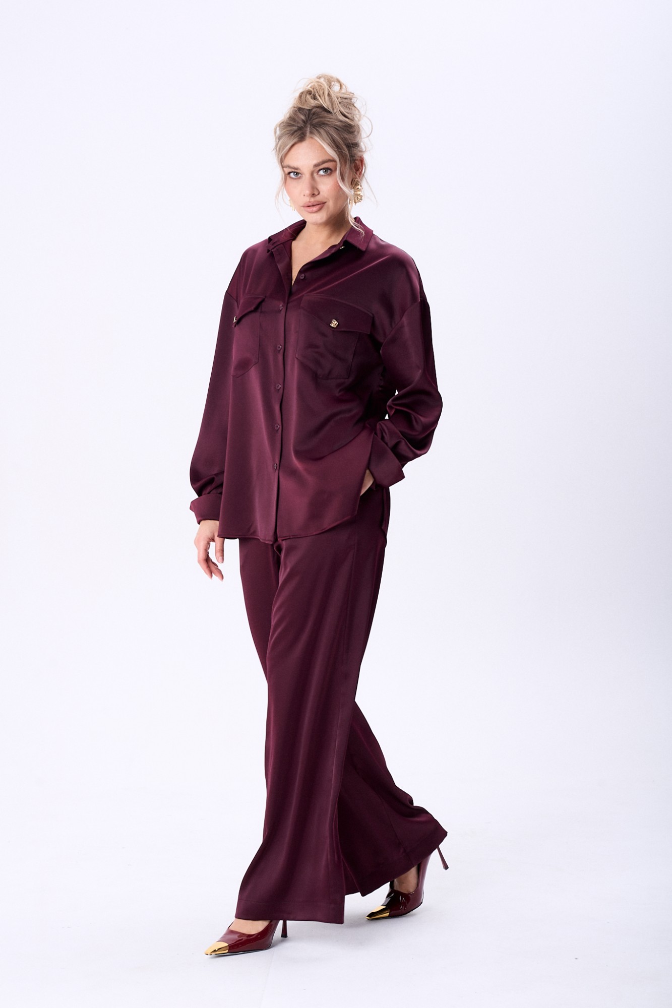 Костюм женский из вискозной ткани с сатиновым блеском свободного силуэта что обеспечит комфорт и идеальную посадку. Рубашка полуприлегающего силуэта со спущенной линией плеча, с центральной застежкой на петли и пуговицы, воротник рубашечный. На полочке в области груди настрочены накладные карманы и клапаны, которые фиксируются на петлю и пуговицу. Рукав длинный по низу притачная манжета, застегивающаяся на петлю и пуговицу. По спинке обработана двойная кокетка, для более комфортной посадки спинка присборена по шву притачивания кокетки. Брюки прямого силуэта, в боковых швах обработан карман с отрезным бочком, верхний срез брюк обработан притачным поясом с эластичной тесьмой, благодаря чему брюки садятся на любую фигуру.