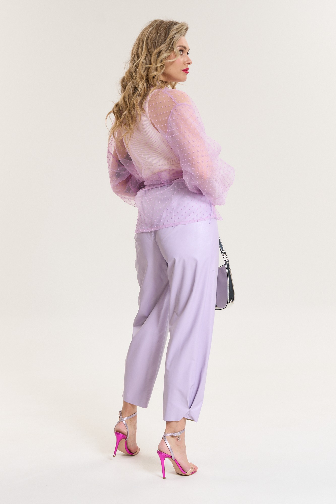 Комплект женский 2-х предметный (туника и брюки).Туника женская прямого силуэта из ткани типа органза со спущенной линией плеча. С ее помощью легко можно трансформировать повседневный образ в праздничный. Идеально сочетается с брюками , юбкой , платьем. Рукав двойной, расширенный к низу со складками. По спинке и полочке идет планка. В комплекте с туникой идет съемный пояс. Брюки из эко-кожи. Укороченные, сужающиеся к низу за счет встречной складки. По переду идут подрезные карманы и складка по линии талии. Застежка на молнию. Пояс отрезной с резинкой. Комплект можно дополнить топом/боди любого подходящего цвета. Детали комплекта легко будут сочетаться с предметами вашего гардероба.