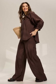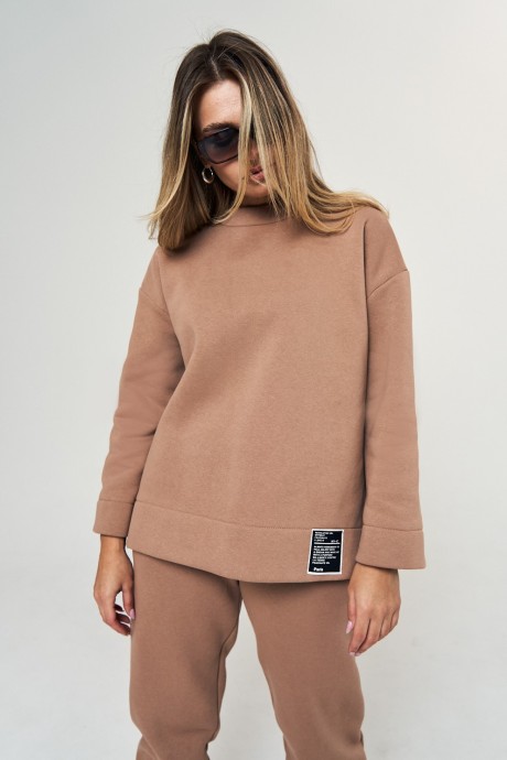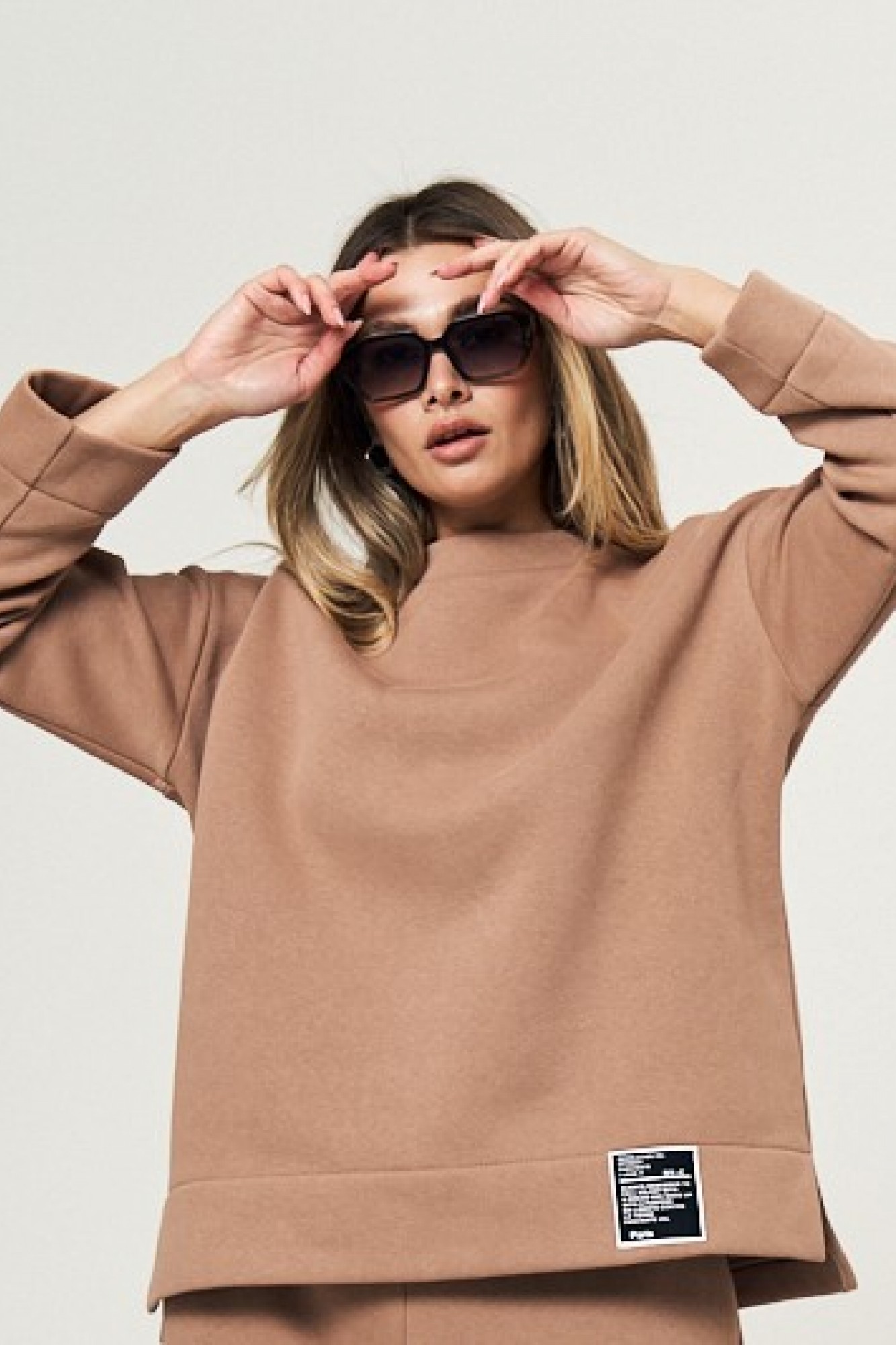 Комплект женский 2-х предметный ( джемпер, брюки) из футера с начесом,"OVERSIZE", очень теплый. Джемпер прямого силуэта со спущенным плечом, по бокам разрезы, по горловине - стойка, спинка длиннее полочки. Низ рукава можно отвернуть как манжету. По низу джемпера идет декоративная нашивка. Брюки в спортивном стиле, внизу манжета на резинке, по бокам карманы, пояс на резине.