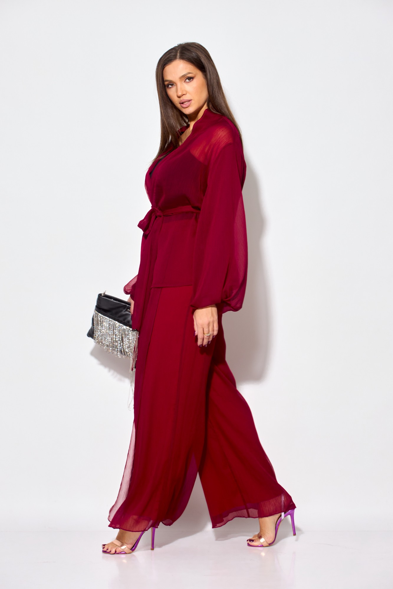 Элегантный вечерний костюм-двойка из шифона, состоящий из блузки свободного кроя и широких брюк на подкладке. Красивый и эффектный брючный костюм - это идеальный образ для особых случаев, вечерних выходов, праздничных и торжественных мероприятий, будь то корпоратив, свадьба, юбилей, выпускной, день рождения, Новый год. Блузка прямого силуэта из шифона со пущенной линией плеча. Рукав двойной, расширенный к низу со складками. По спинке и полочке идет планка. В комплекте с блузкой идет съемный пояс. На концах пояса металлизированная бахрома. Брюки прямые на трикотажной подкладке масло, с запахом по переду, пояс на резинке. Благодаря фасону и крою, костюм визуально вытянет силуэт, сделает фигуру стройнее, подчеркнет ее достоинства, скроет недостатки. Элегантный брючный костюм от Anastasia- комфорт и уверенность в себе!