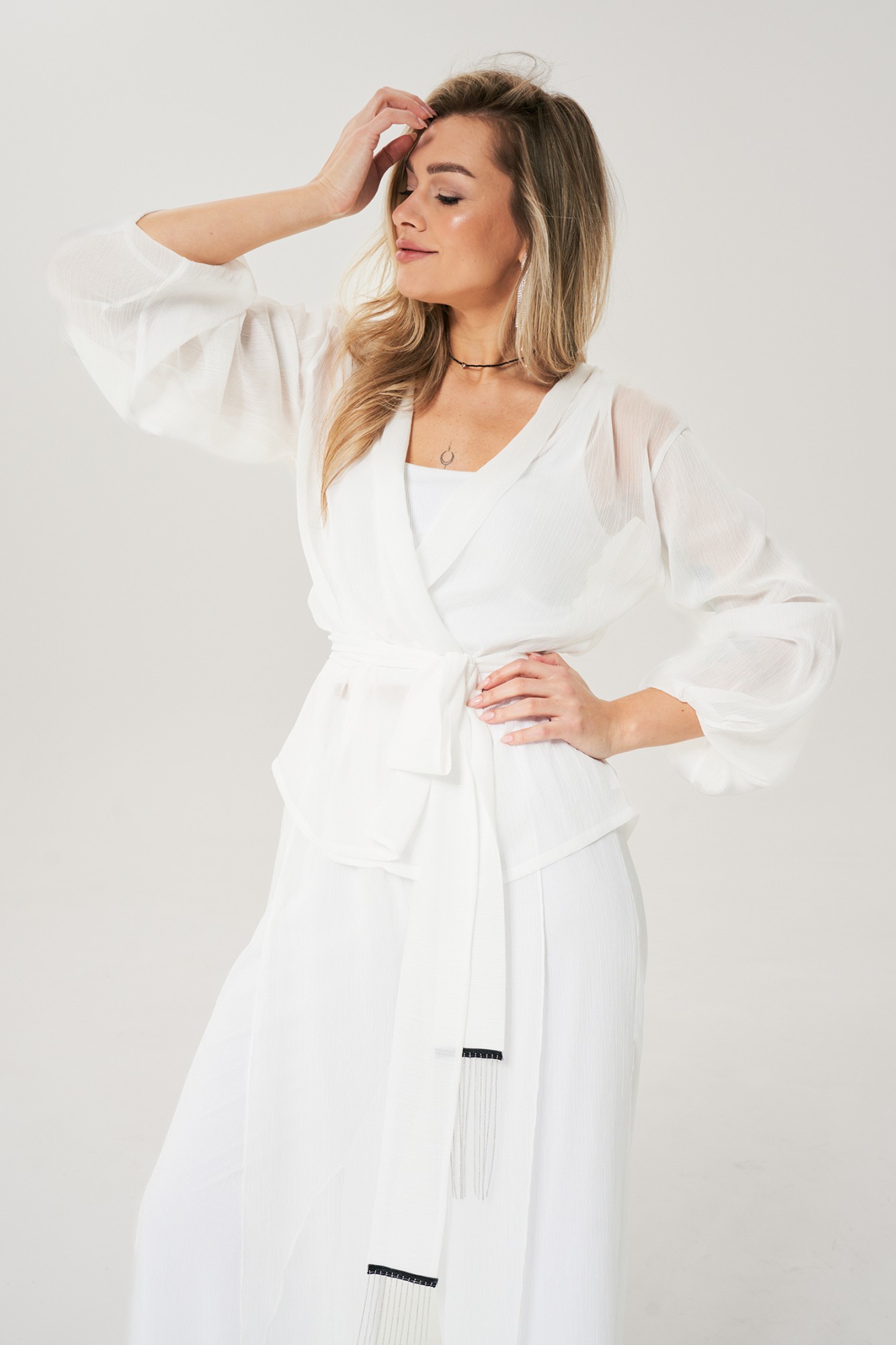 В женском костюме из шифоновой ткани вы будете в центре внимания на любом мероприятии. Легкий материал приятно облегает тело, создавая ощущение комфорта в любое время года. Широкий размерный ряд позволяет каждому найти идеальный вариант, подчеркивающий Вашу индивидуальность, и скроет возможные недостатки в больших размерах. Блузка прямого силуэта из шифона жатка со пущенной линией плеча. Рукав двойной, расширенный к низу со складками. По спинке и полочке идет планка. В комплекте с блузкой идет съемный пояс. Брюки прямые на трикотажной подкладке масло, с запахом по переду, пояс на резинке.
