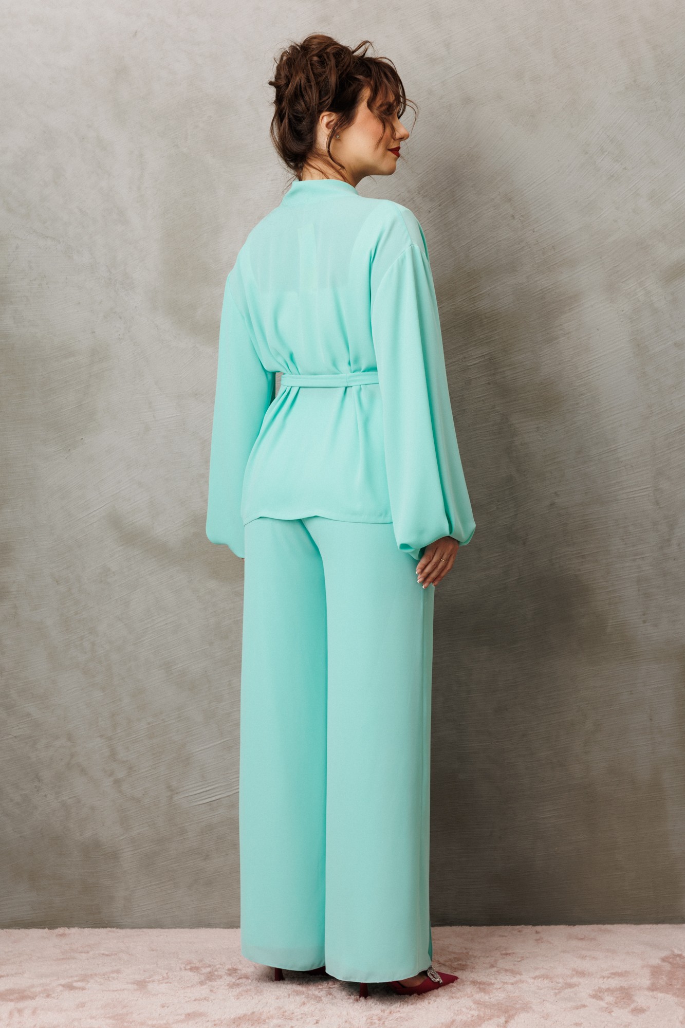 Элегантный вечерний костюм-двойка, состоящий из блузки свободного кроя и широких брюк. Красивый и эффектный брючный костюм - это идеальный образ для особых случаев, вечерних выходов, праздничных и торжественных мероприятий, будь то корпоратив, свадьба, юбилей, выпускной, день рождения, Новый год Блузка прямого силуэта со пущенной линией плеча. Рукав двойной, расширенный к низу со складками. По спинке и полочке идет планка. В комплекте с блузкой идет съемный пояс. На концах пояса металлизированная бахрома. Брюки прямые с запахом по переду, пояс на резинке. Благодаря фасону и крою, костюм визуально вытянет силуэт, сделает фигуру стройнее, подчеркнет ее достоинства, скроет недостатки. Элегантный брючный костюм от Anastasia- комфорт и уверенность в себе на любом мероприятии.