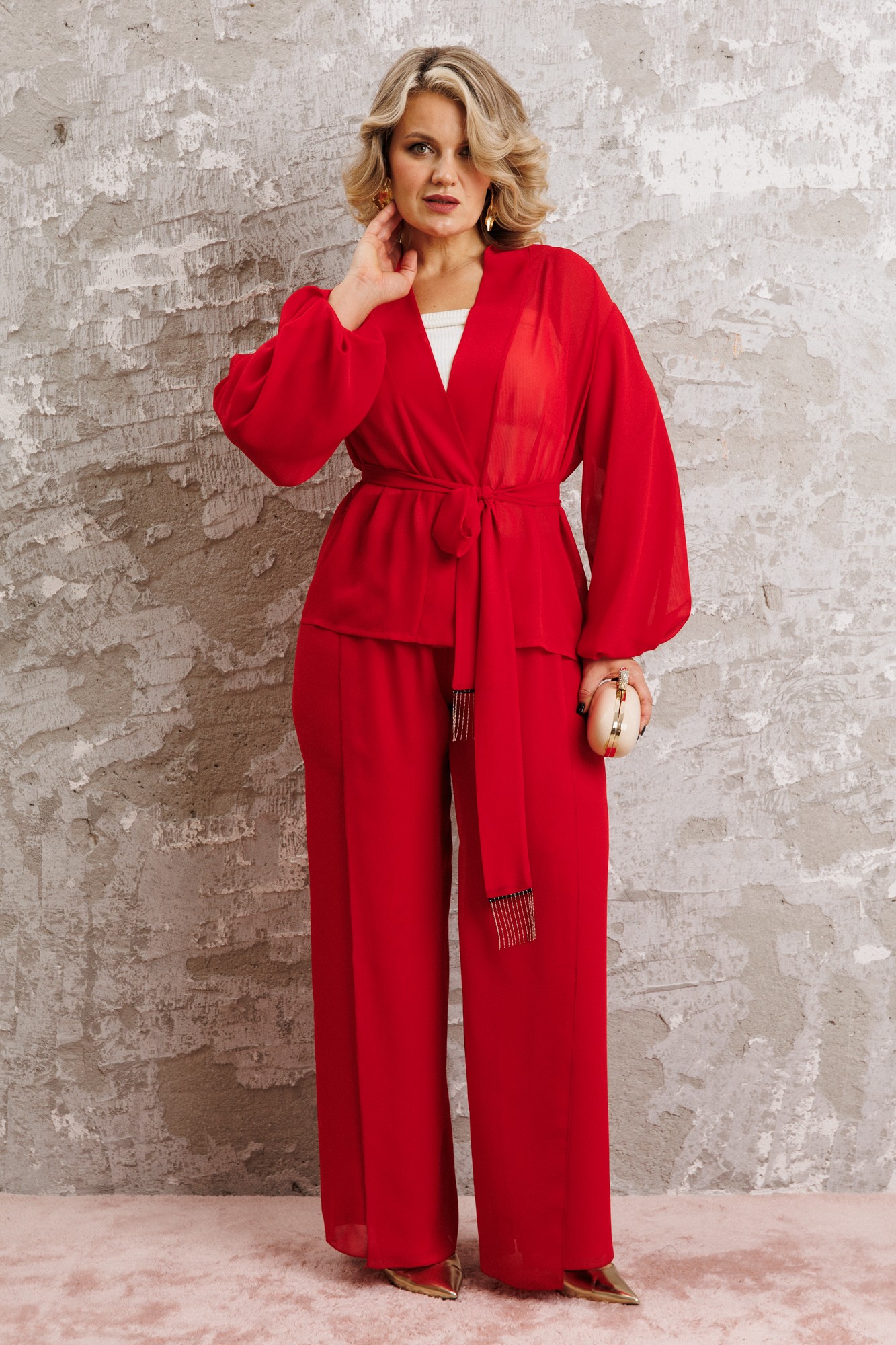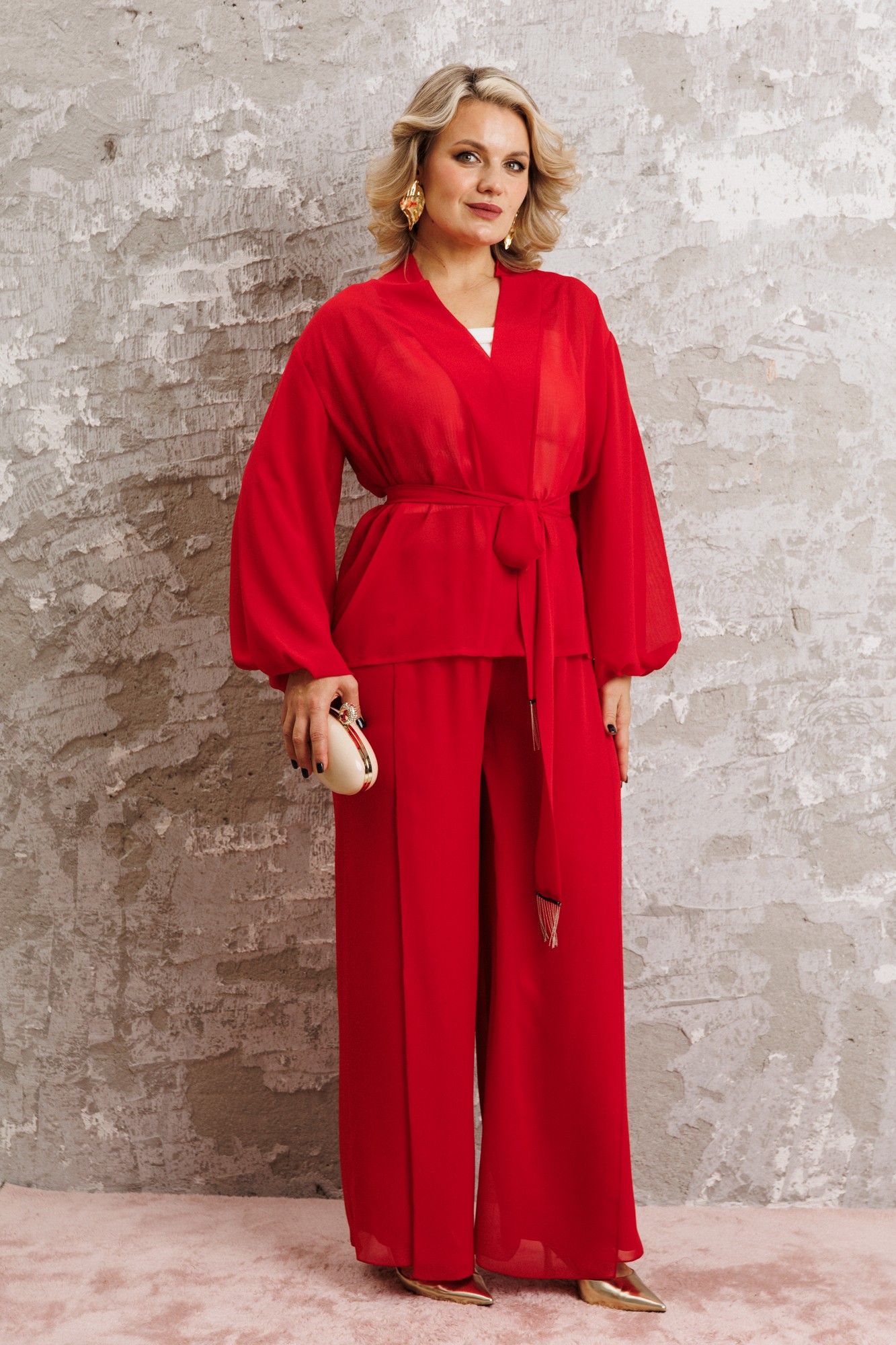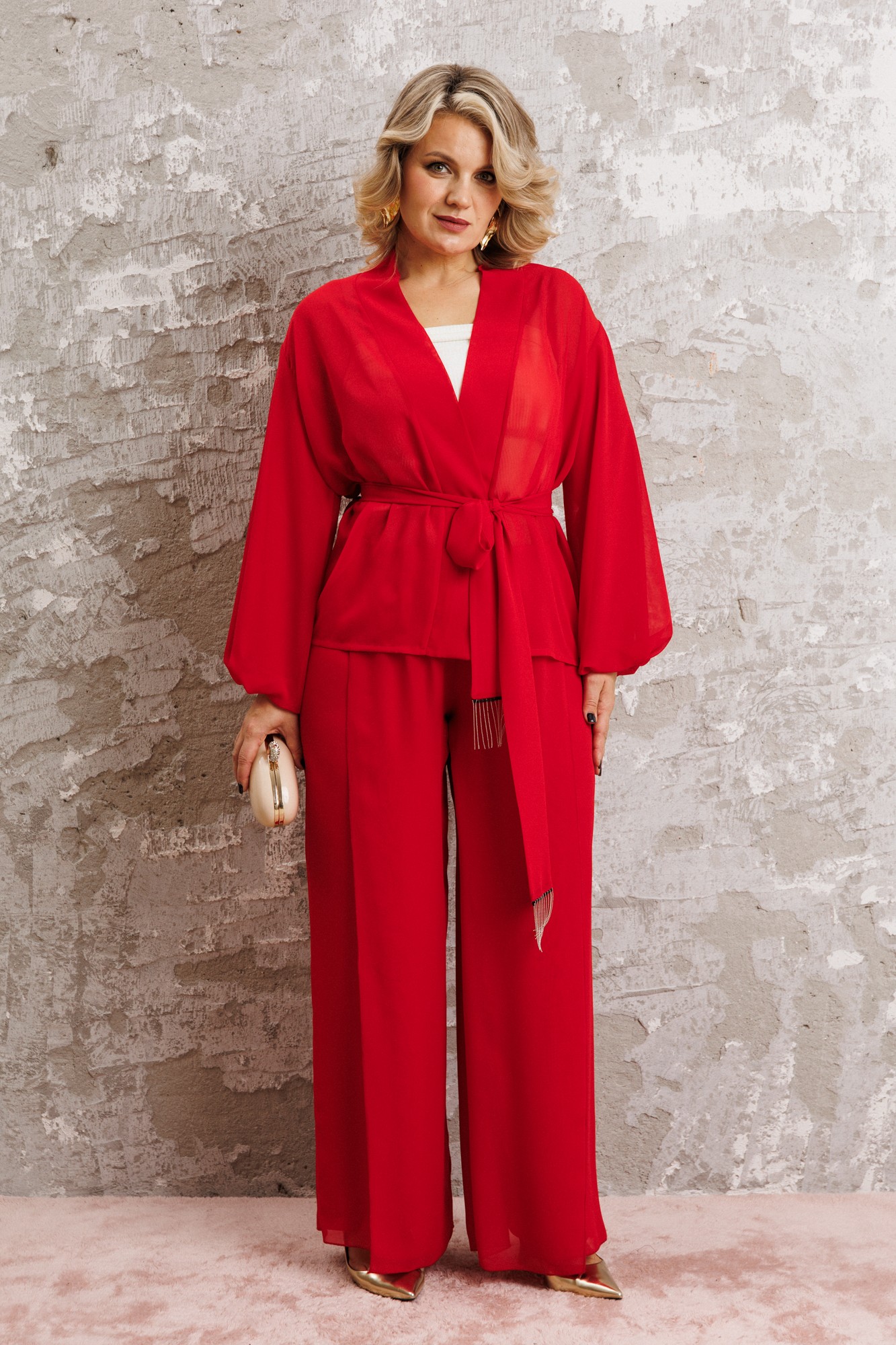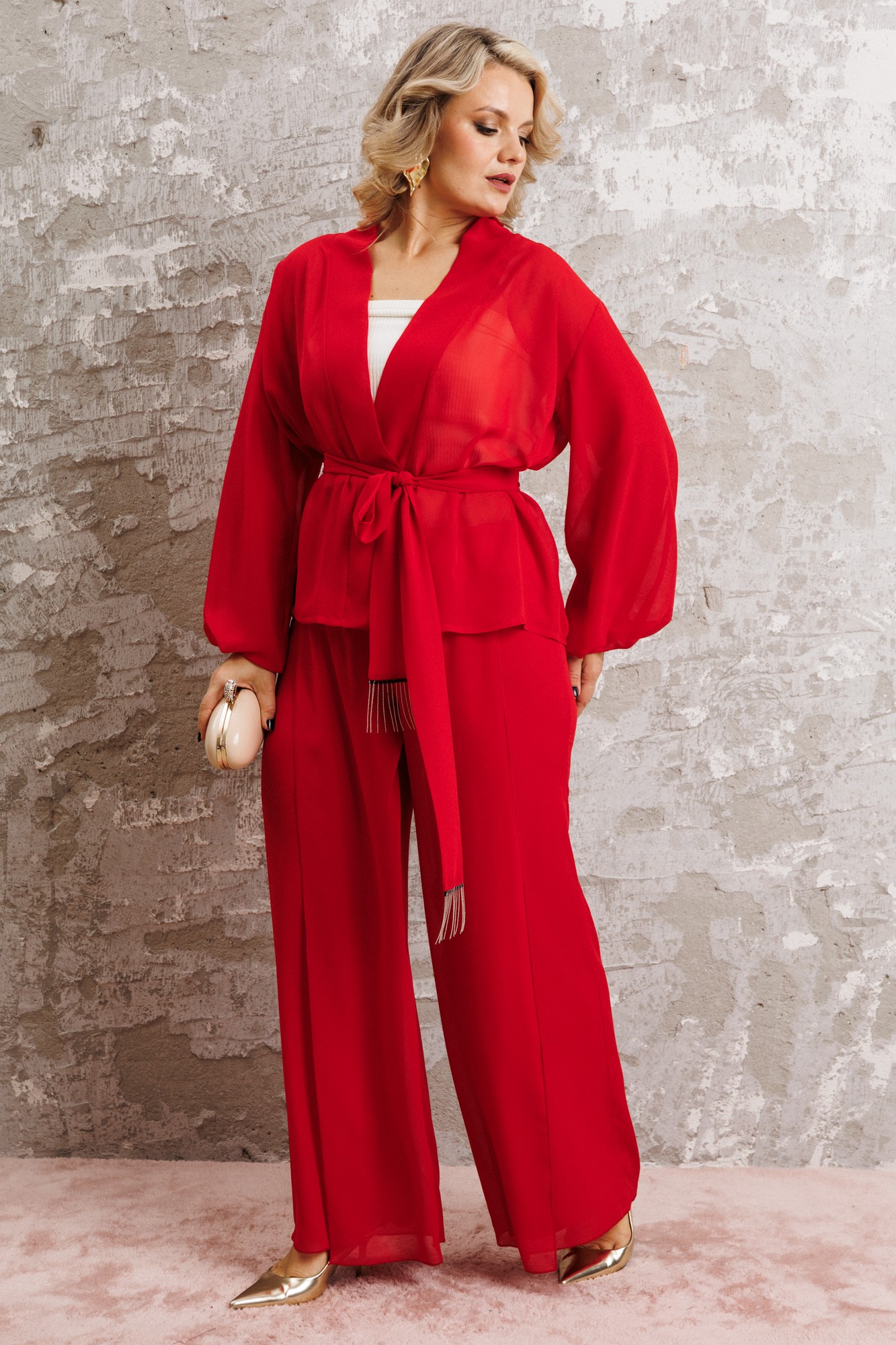 Элегантный вечерний костюм-двойка из шифона, состоящий из блузки свободного кроя и широких брюк. Красивый и эффектный брючный костюм - это идеальный образ для особых случаев, вечерних выходов, праздничных и торжественных мероприятий, будь то корпоратив, свадьба, юбилей, выпускной, день рождения, Новый год Блузка прямого силуэта из шифона со пущенной линией плеча. Рукав двойной, расширенный к низу со складками. По спинке и полочке идет планка. В комплекте с блузкой идет съемный пояс. На концах пояса металлизированная бахрома. Брюки прямые на трикотажной подкладке масло, с запахом по переду, пояс на резинке. Благодаря фасону и крою, костюм визуально вытянет силуэт, сделает фигуру стройнее, подчеркнет ее достоинства, скроет недостатки. Элегантный брючный костюм от Anastasia- комфорт и уверенность в себе на любом мероприятии