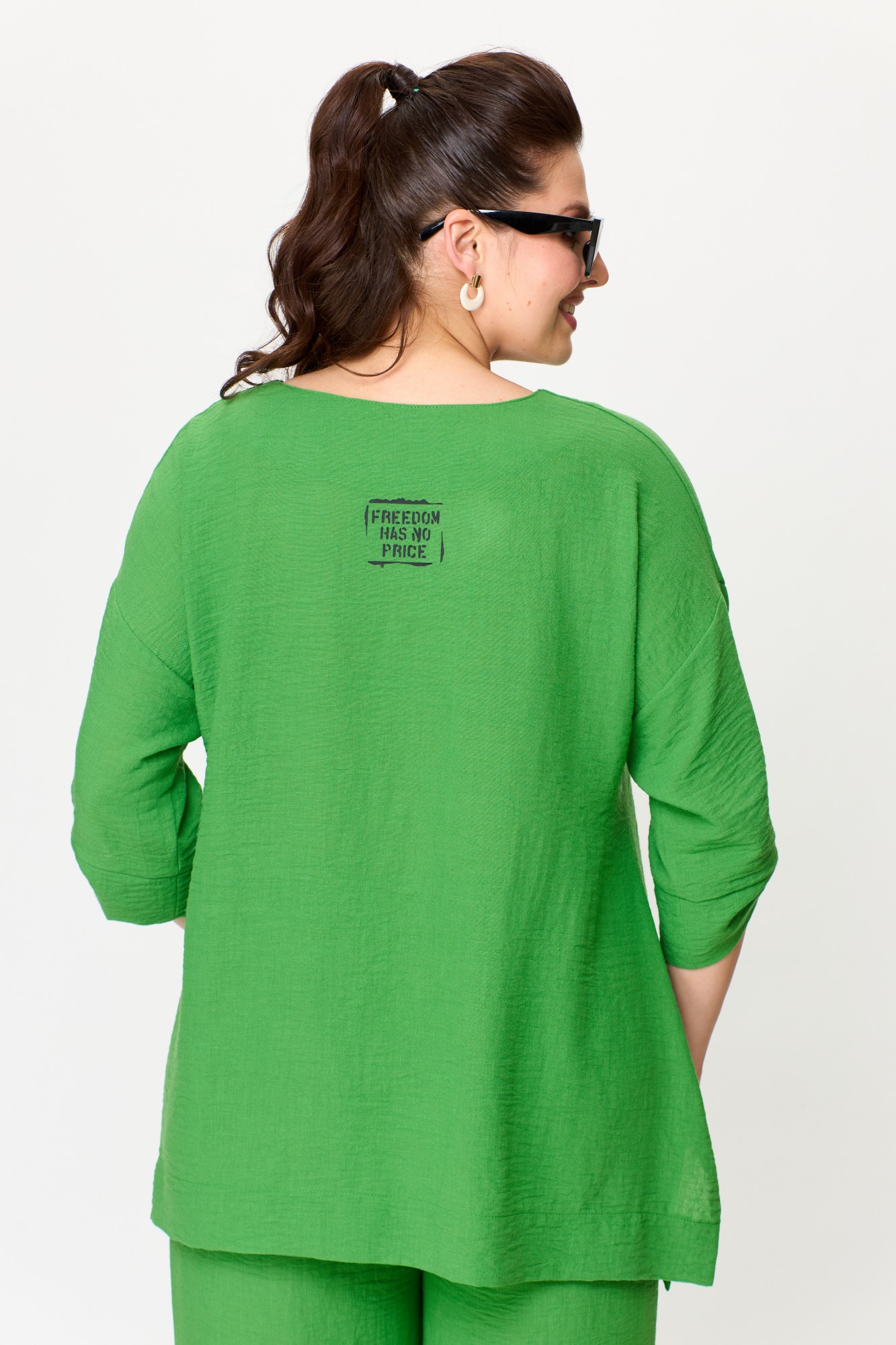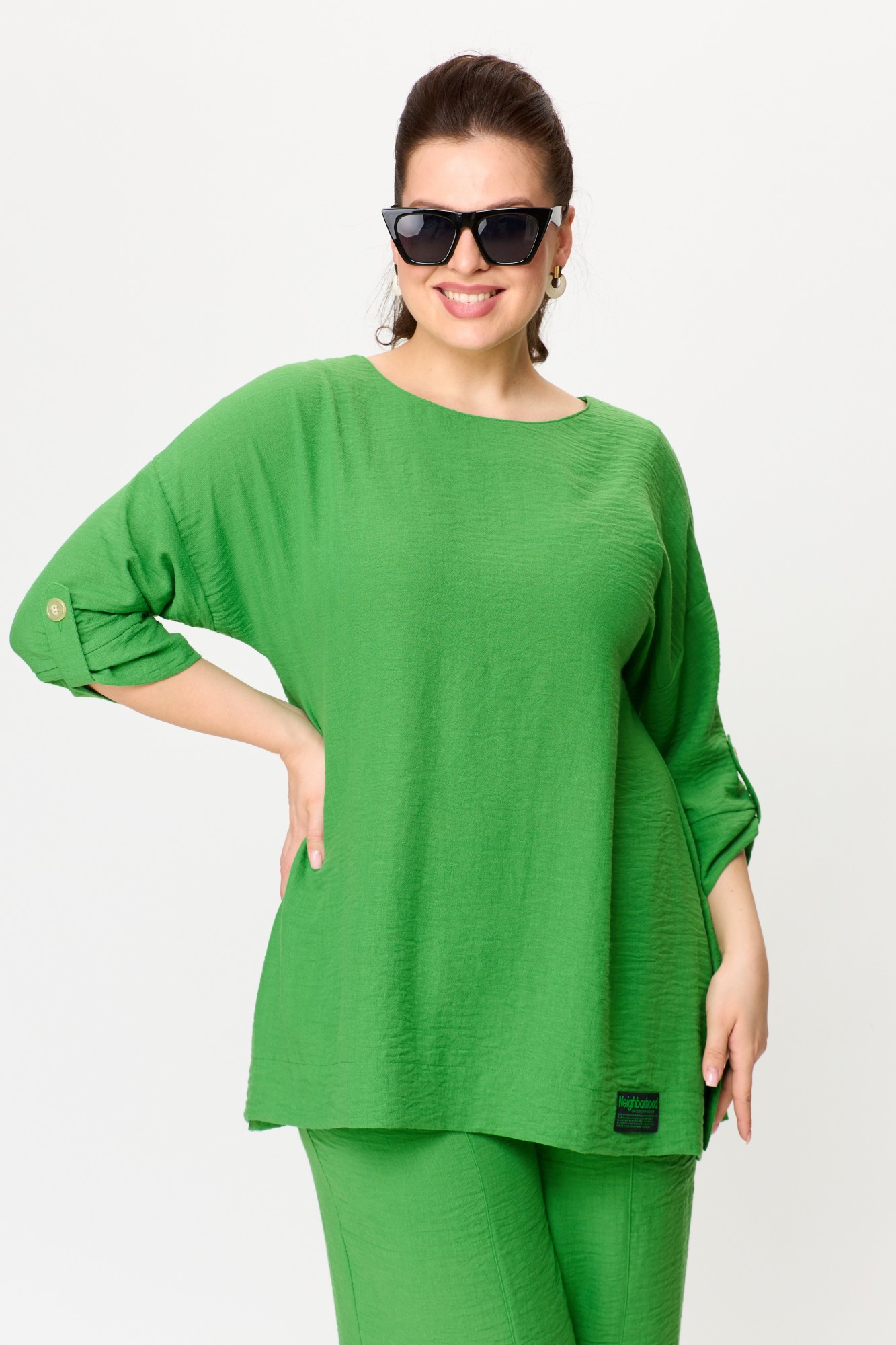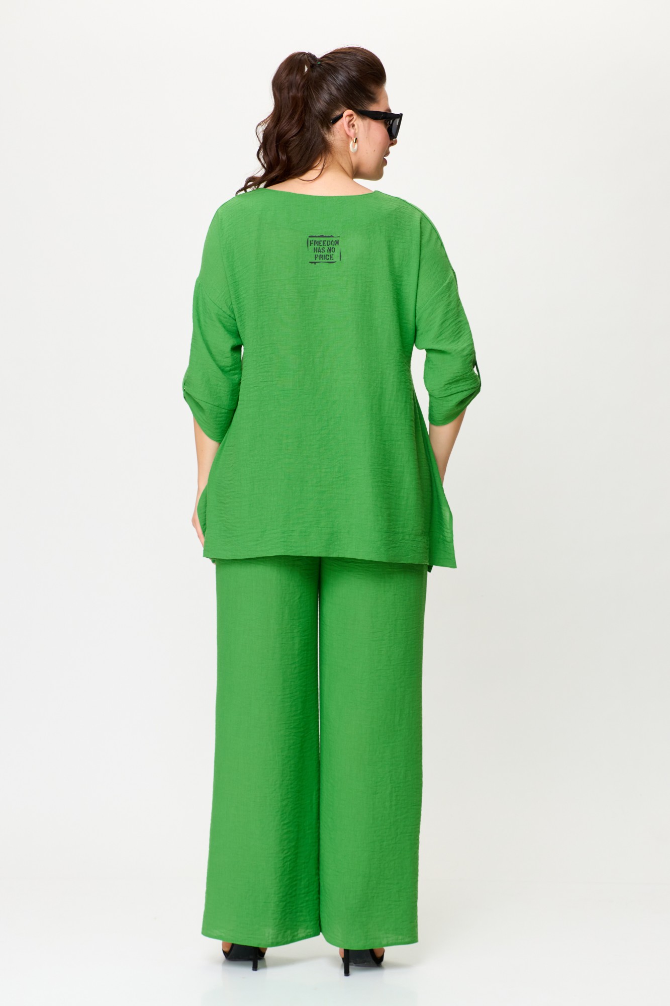 Комплект женский 2-х предметный (блузка, брюки) из текстильной ткани в изумительном зеленом цвете станет акцентным дополнением к вашему гардеробу. Отлично подойдет как для повседневной носки (работа, офис, прогулки), так и для праздничных выходов. Достаточно дополнить его соответствующими аксессуарами. Предметы комплекта легко будут сочетаться с вещами из Вашего гардероба. Блузка со спущенным плечом, трапециевидного силуэта с разрезами по бокам. Рукав 3/4 длины с манжетой. Длина рукава фиксируется патой. В качестве декора - нашивка по низу блузки и в верхней части спинки термонаклейка. Брюки прямые, пояс на резинке. По передней части брюк идут подрезы с карманами.