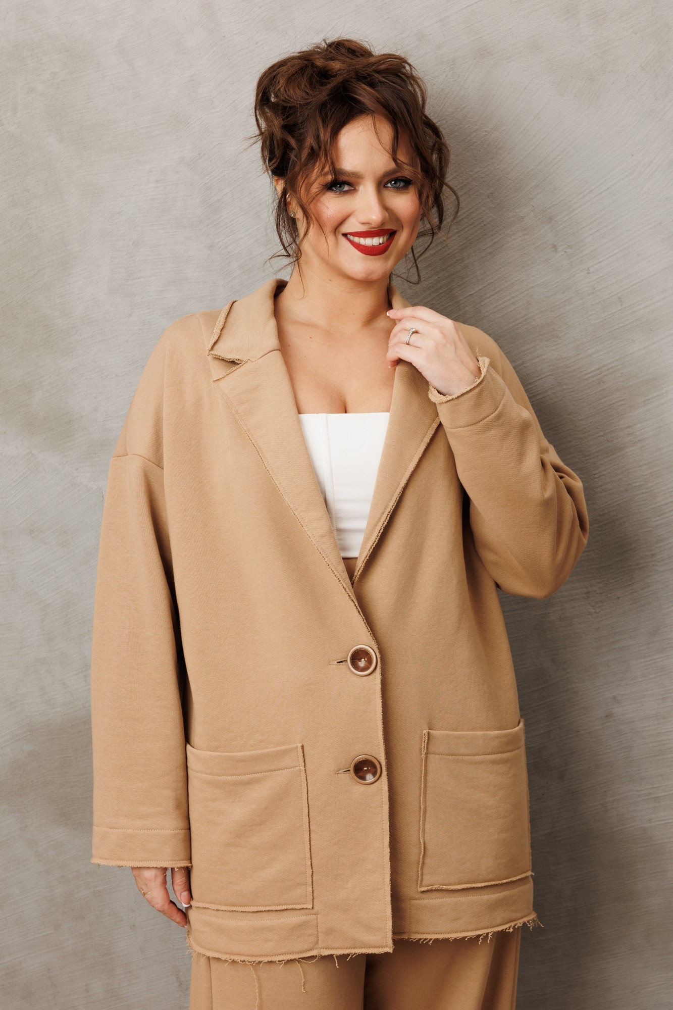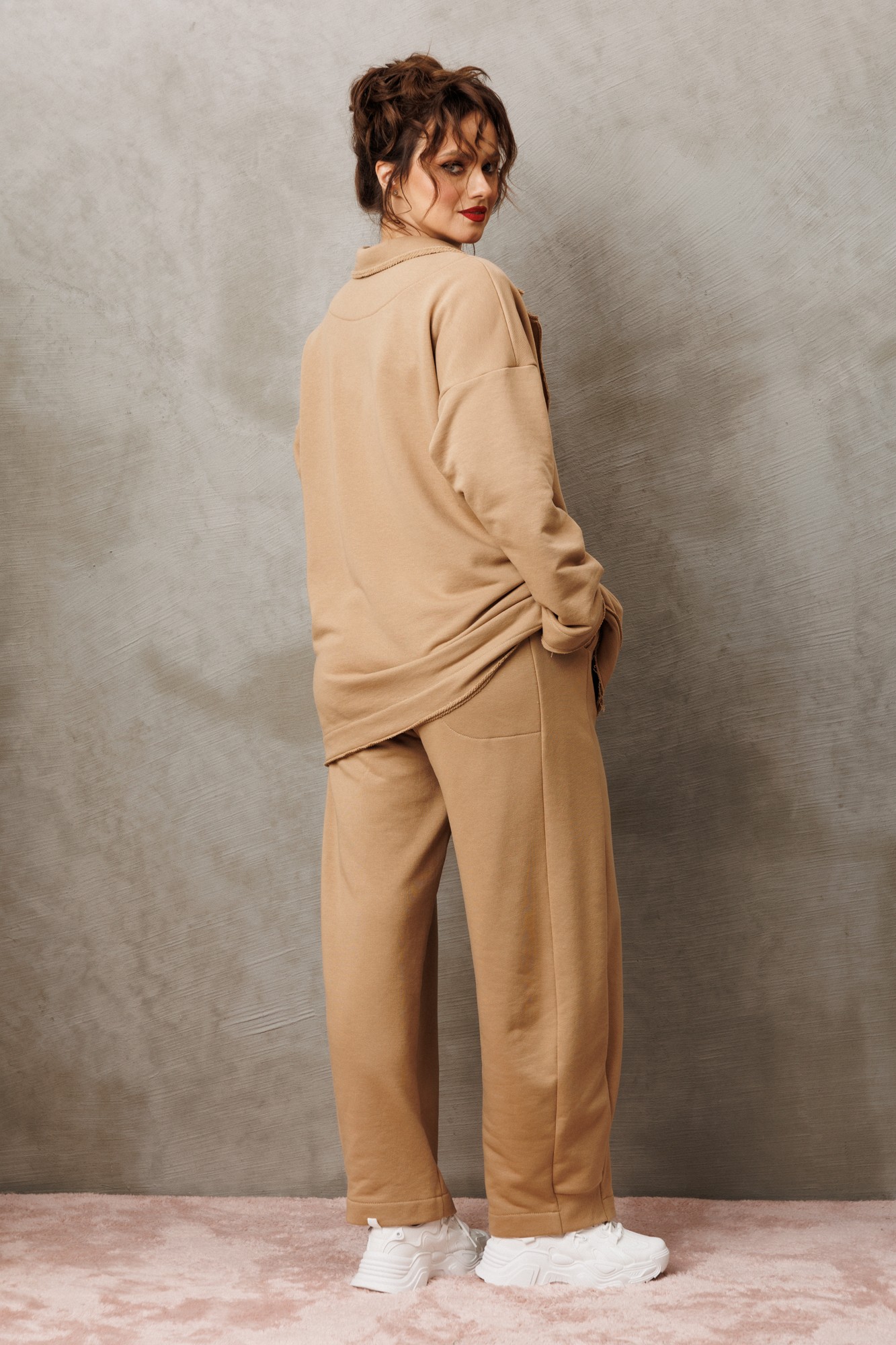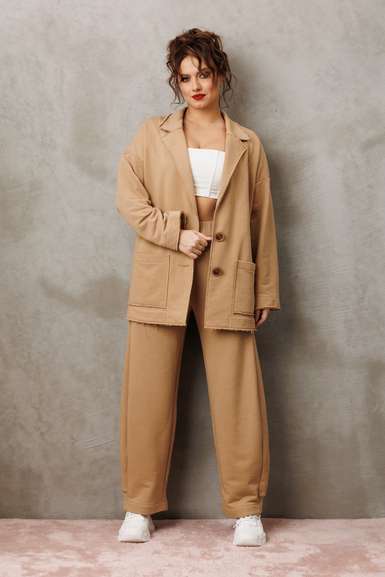 Костюм женский кэжуал (casual) из трикотажного материала трехнитка свободного кроя, который создает расслабленный силуэт -это отличный выбор для активных и стильных девушек и женщин, которые ценят моду и комфорт! Жакет со спущенным плечом. Воротник пиджачного типа, по полочке идут накладные карманы. Жакет без подкладки, мягкий и легкий. Края борта воротника, низов и карманов не обработаны. Застежка на петли и пуговицы. Выполнен в крое Oversize свободной формы и посадкой по фигуре. Если хотите силуэтную посадку, выбирайте на размер меньше. Если хотите посадку свободнее - заказывайте свой размер.