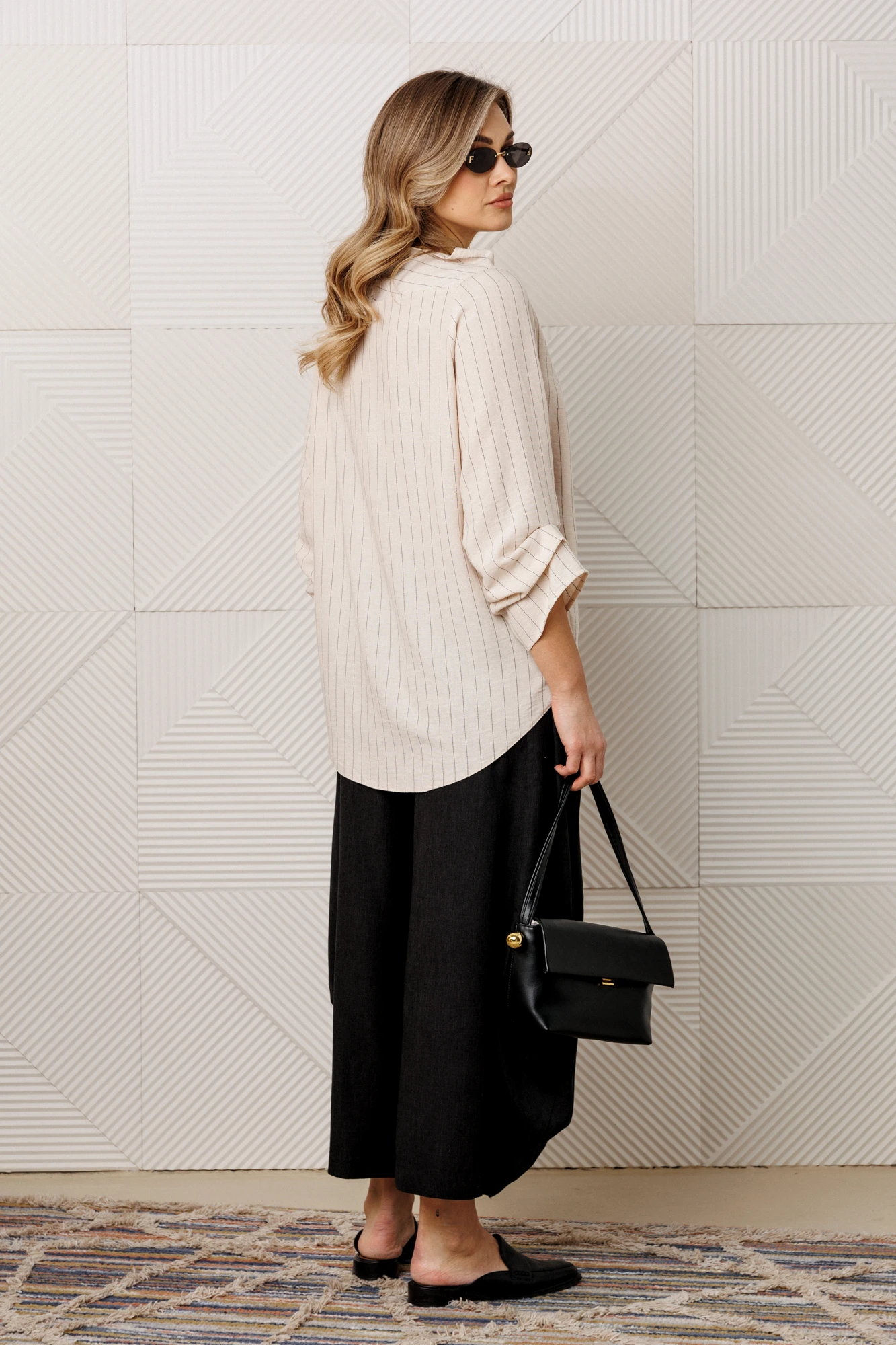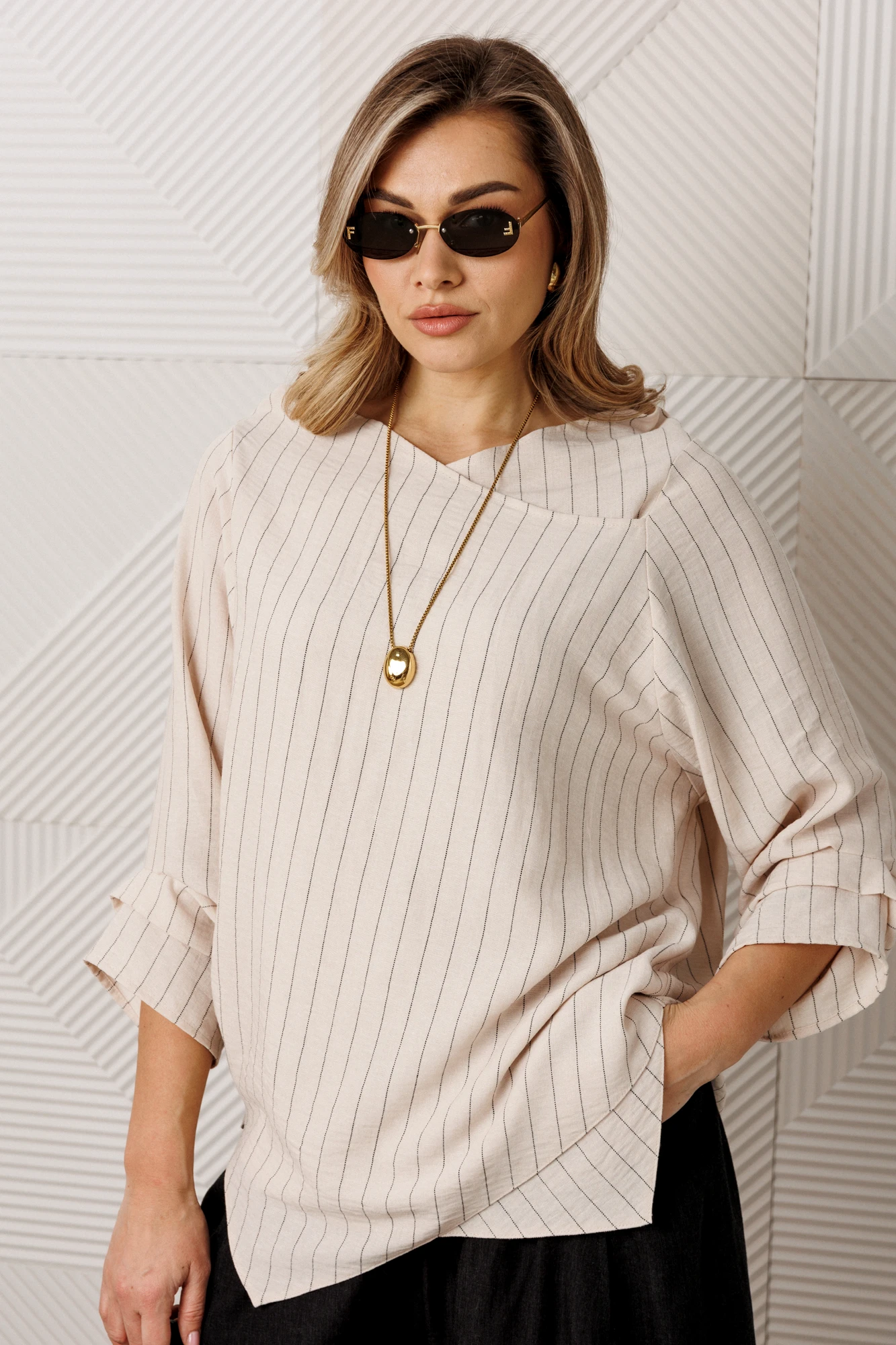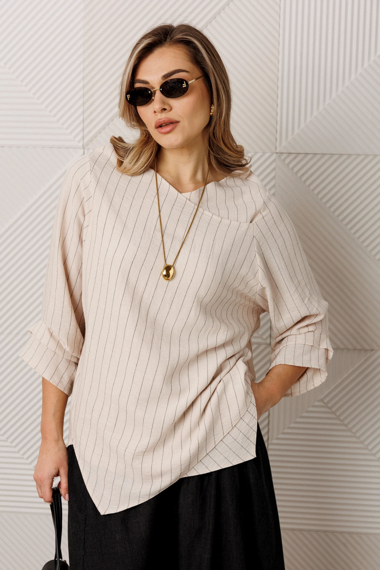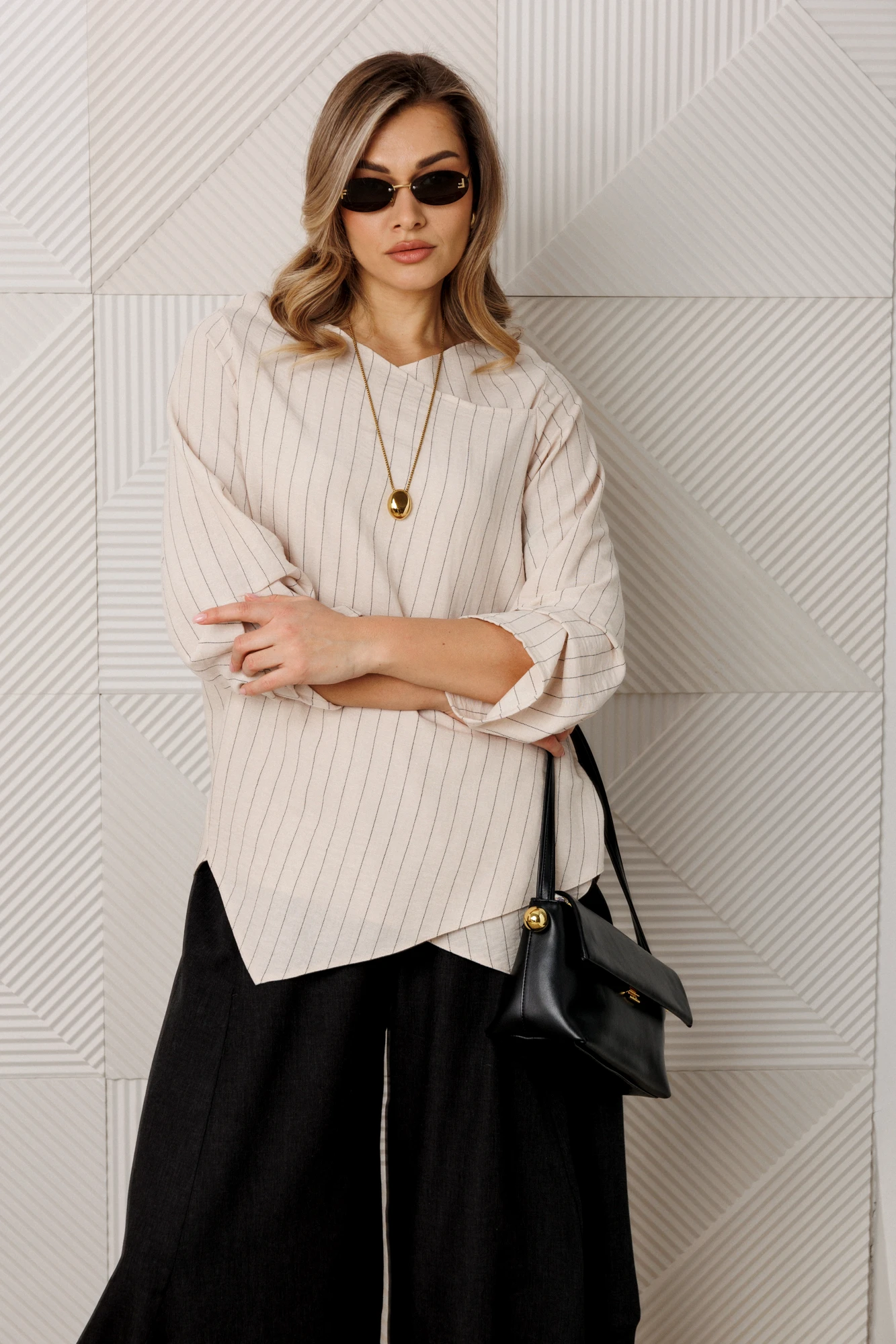 Представляем вашему вниманию стильный комплект, который станет настоящим маст-хэвом в вашем гардеробе. Комплект состоит из блузки и брюк. Модель прямого силуэта, рукав углублённый, рубашечного типа. Перед идет с запахом, низ блузы асимметричный, по полочке углы, спинка закруглённая, удлинённая. По рукаву идут защипы. По горловине нашит металлический логотип бренда. Брюки - алладины. Свободный фасон от бедра и лёгкое заужение книзу за счет резинки визуально делают ноги стройнее и длиннее. Эластичный пояс и удобные глубокие карманы придают брюкам не только стиль, но и функциональность. По бокам карманы. Благодаря мягкой резинке модель удачно садится практически на любую фигуру. А также в них комфортно весной и летом - практически универсальный вариант. Модель можно отнести к стилю кэжуал. Костюм можно носить с туфлями, кроссовками или ботинками. Обязательно добавьте наш бренд в избранное и следите за новинками, распродажами, скидками и акциями! Хороших покупок от «Анастасия».