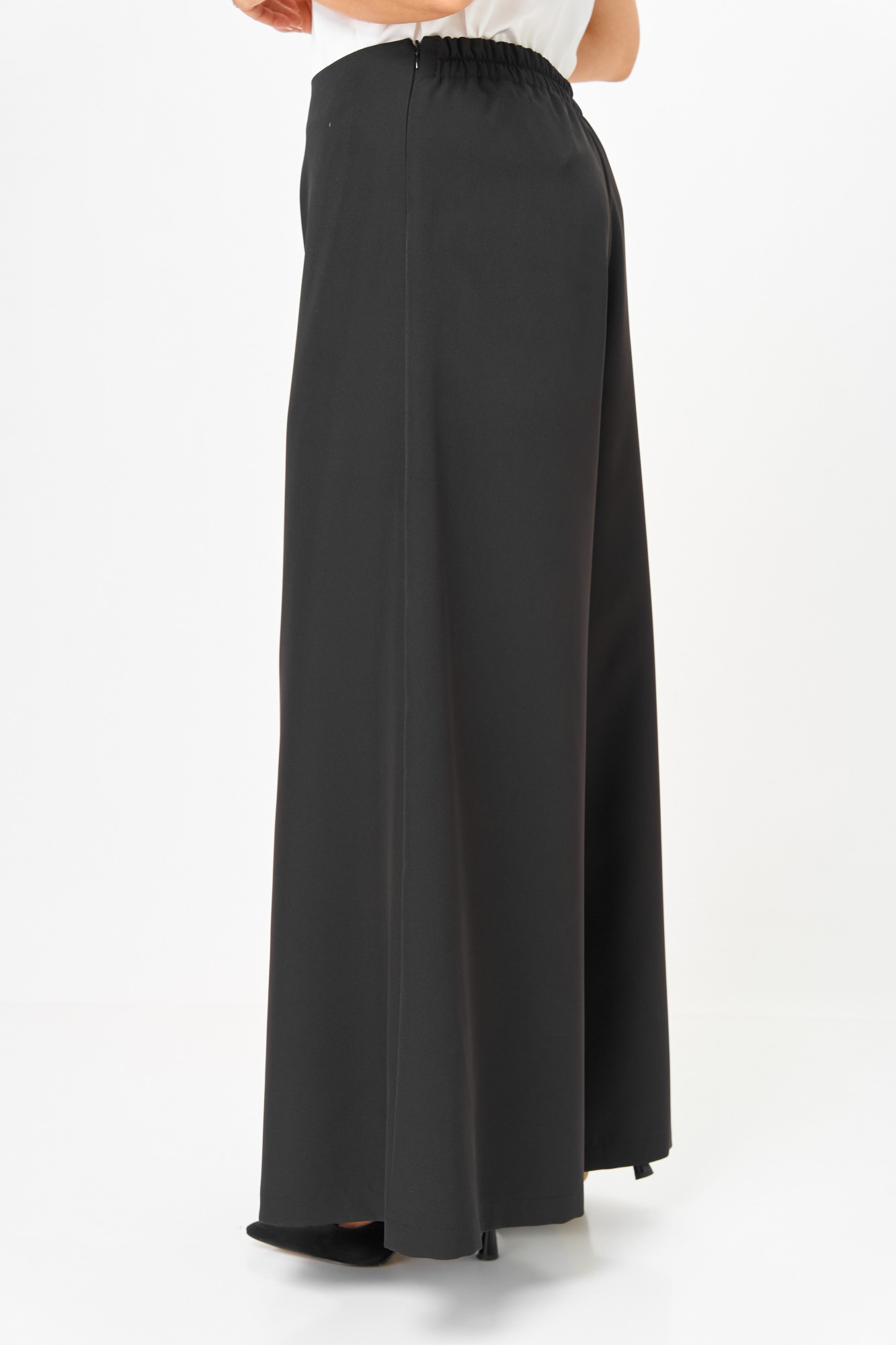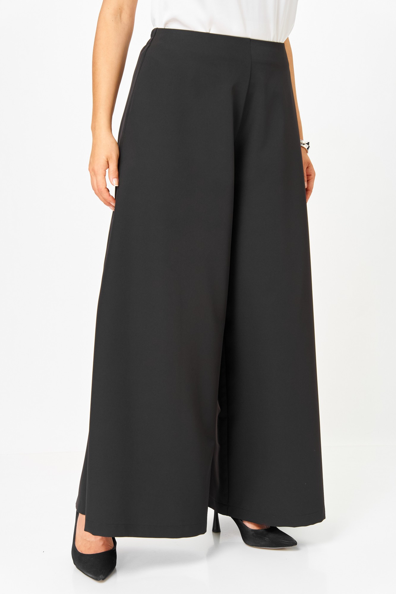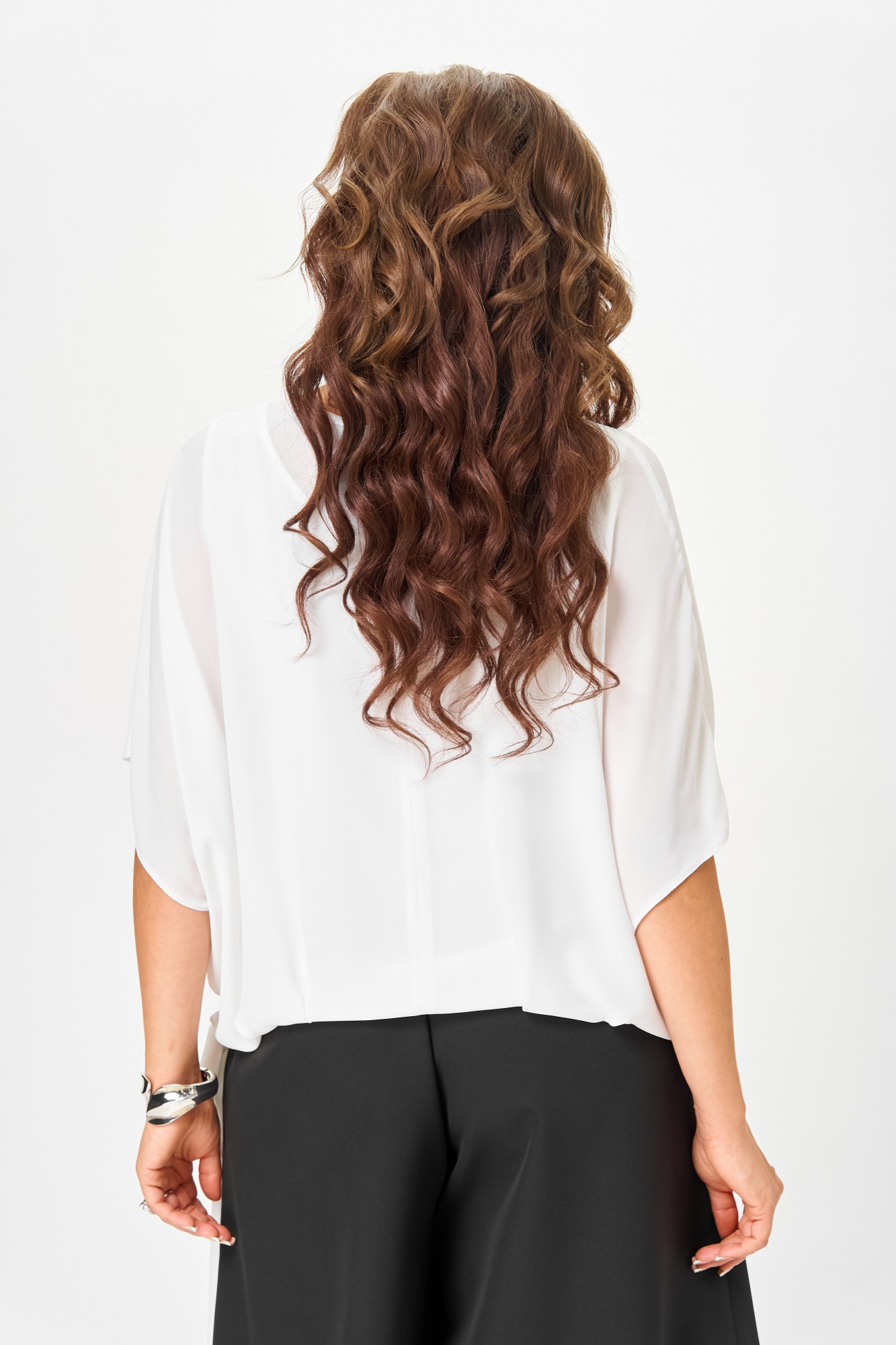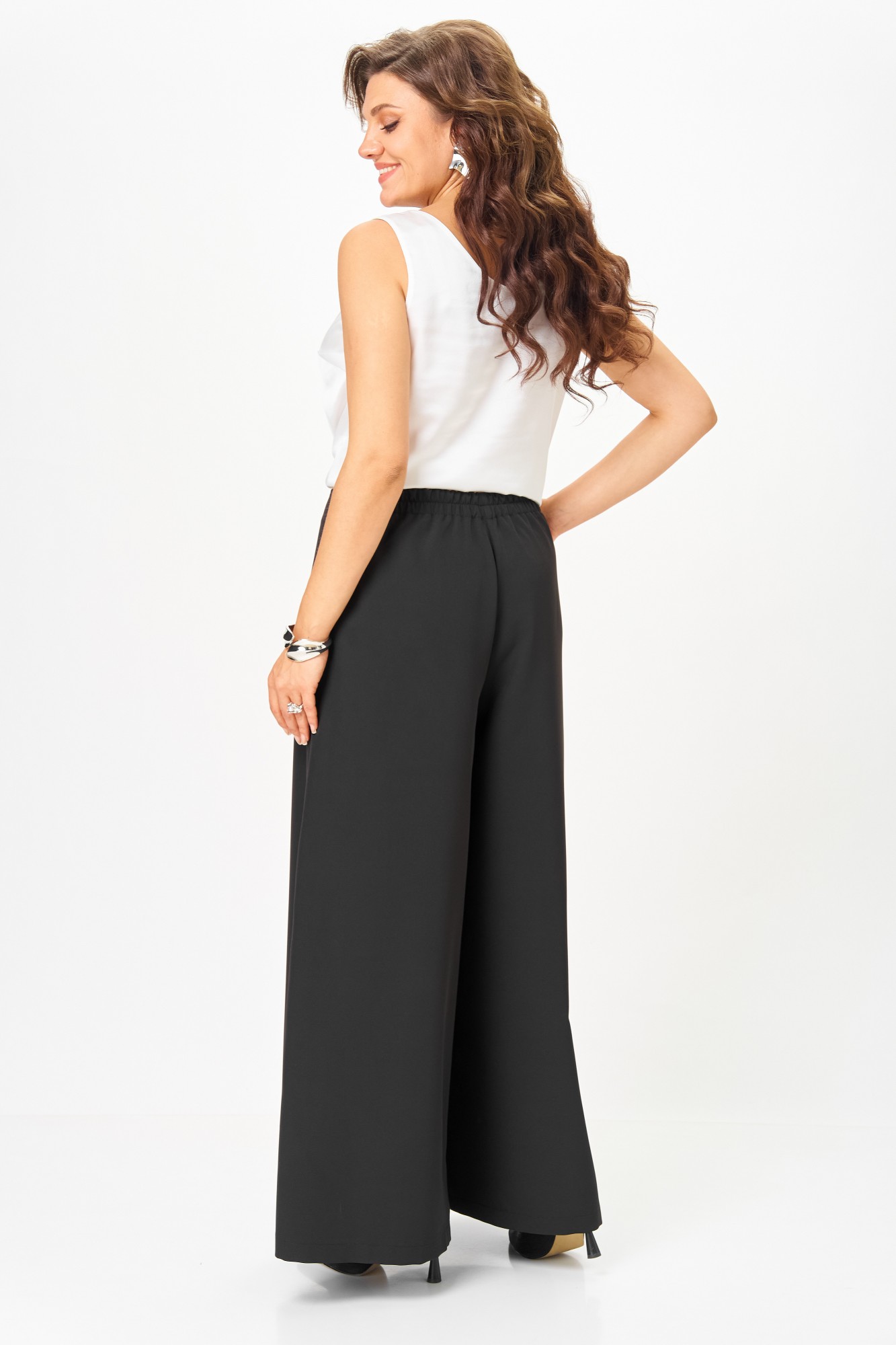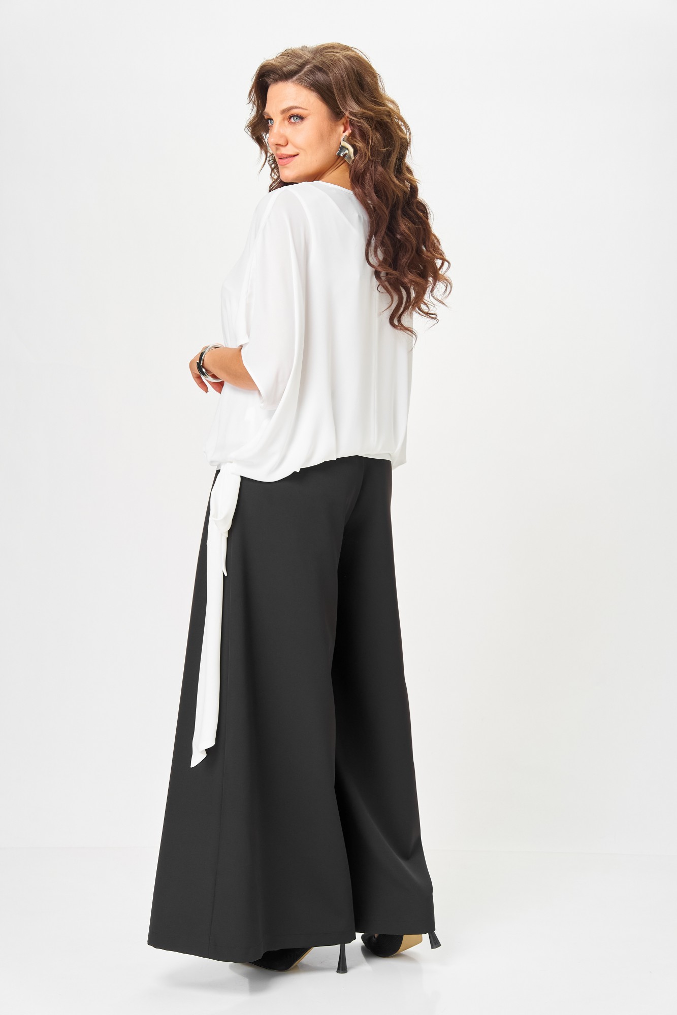 Комплект состоит из блузки топа и брюк. Блузка выполнена из однотонного креп-шифона, топ выполнен из блузочной однотонной ткани, брюки выполнены из однотонной струящейся ткани, контрастной по цвету. Блузка свободного силуэта. Полочка блузки с круглой горловиной. Спинка со средним швом, в верхней части которого обработан разрез, крепящийся по горловине на навесную петлю и пуговицу. Рукав цельнокроеный, длиной до локтя. По низу блузка со складками и на притачном поясе, завязывающемся на левом боковом. Топ на бретельках, с регуляторами длины бретелей. Полочка топа с нагрудными вытачками. Спинка цельная.