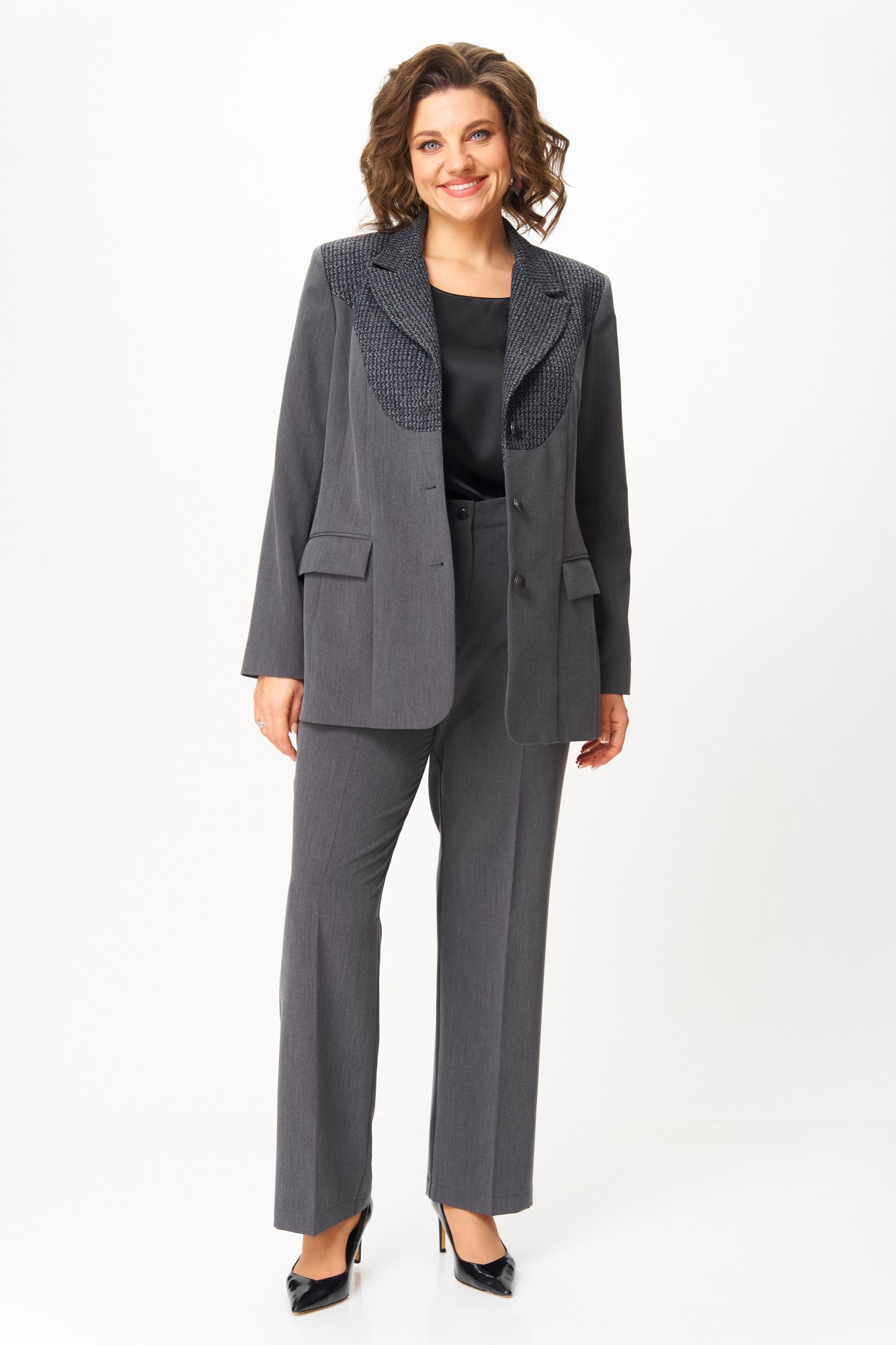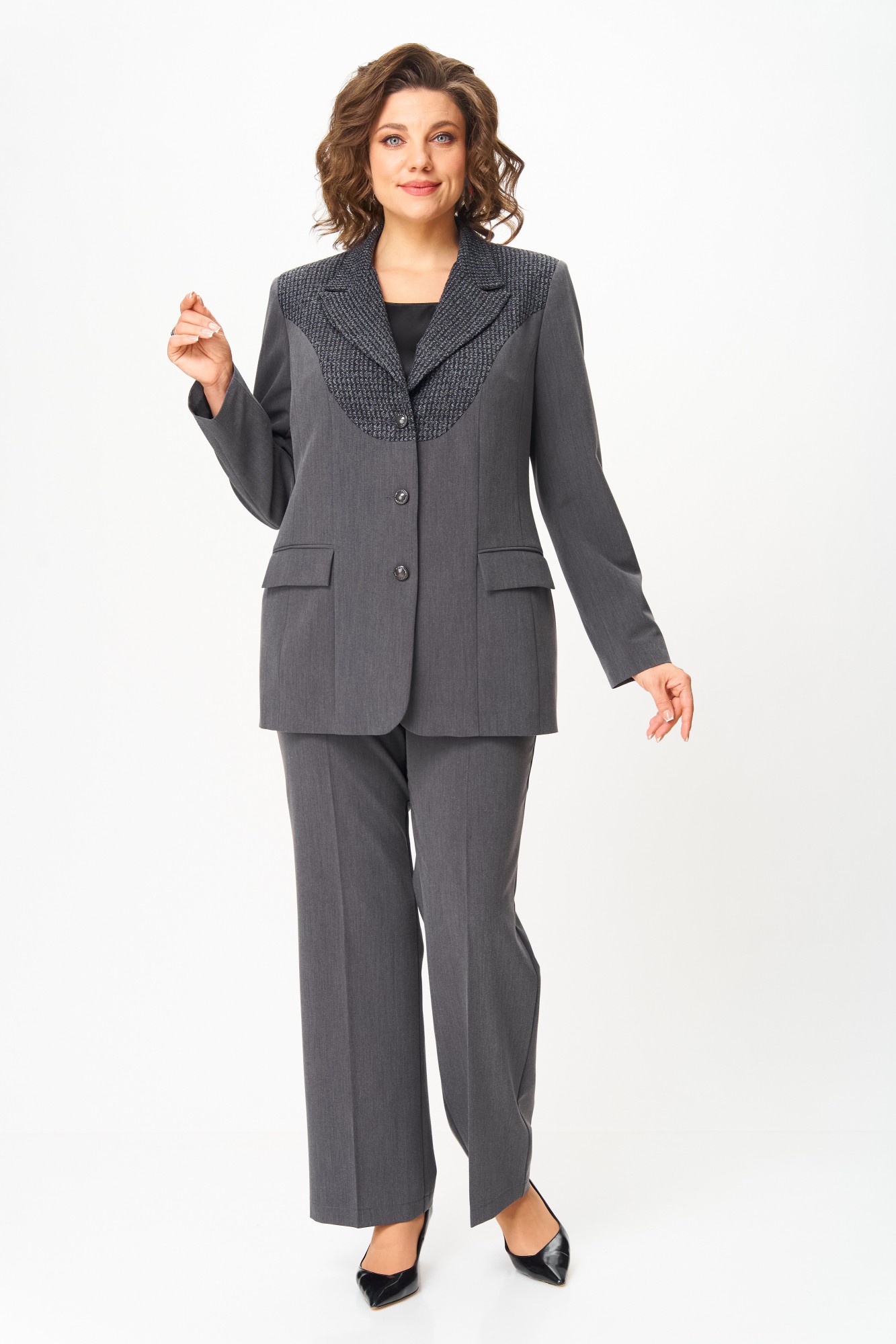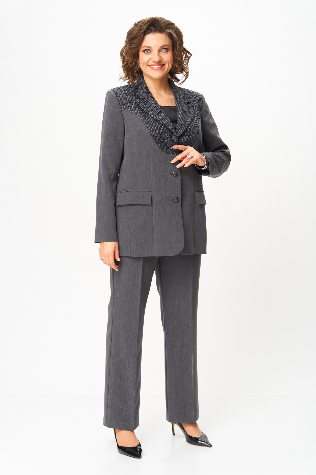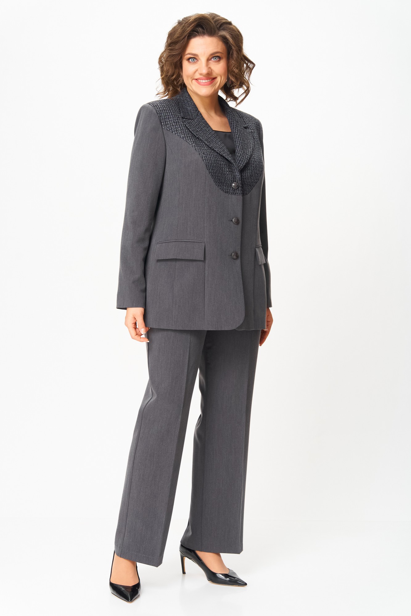 Костюм полуприлегающего силуэта, состоящий из жакета и брюк, выполнен из однотонной костюмной ткани.Ткань верха имеет механическое растяжение благодаря содержанию в ней эластана. Брючный костюм идеальный вариант как на торжественные мероприятия, так и отличный офисный вариант. Жакет полуприлегающего силуэта, на подкладке, выполнен из костюмной однотонной ткани, в качестве отделки использован твид, имеющий структурное переплетение. Полочка жакета с однобортной центральной застежкой на петли и пуговицы, вертикальными рельефами и прорезным карманом с клапаном. В верхней части полочки обработана фигурная кокетка из отделочной ткани. Горловина V-образной формы, с отложными лацканами и воротником пиджачного типа. Спинка со средним швом и вертикальными рельефами. Рукав длинный, двухшовный, втачной. Брюки полной длины, прилегающие в области бедер и свободные в колене и по низу. Брюки со стрелками. По передним половинкам выполнены наклонные карманы. В левом боковом шве обработана застежка на потайную молнию. По талии брюки на притачном поясе с эластичной тесьмой и застежкой на петлю и пуговицу. По поясу брюк обработаны шлевки под ремень.