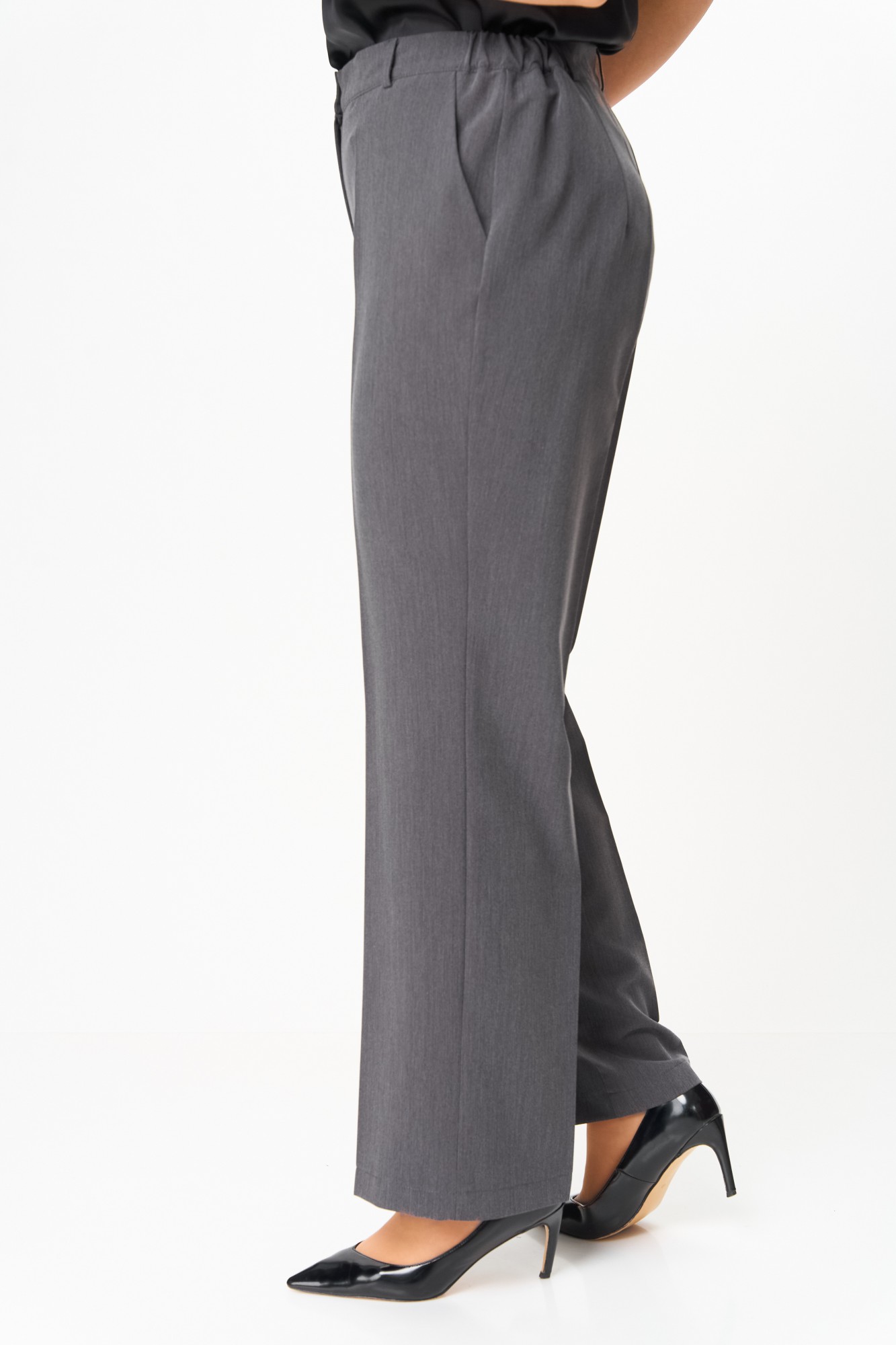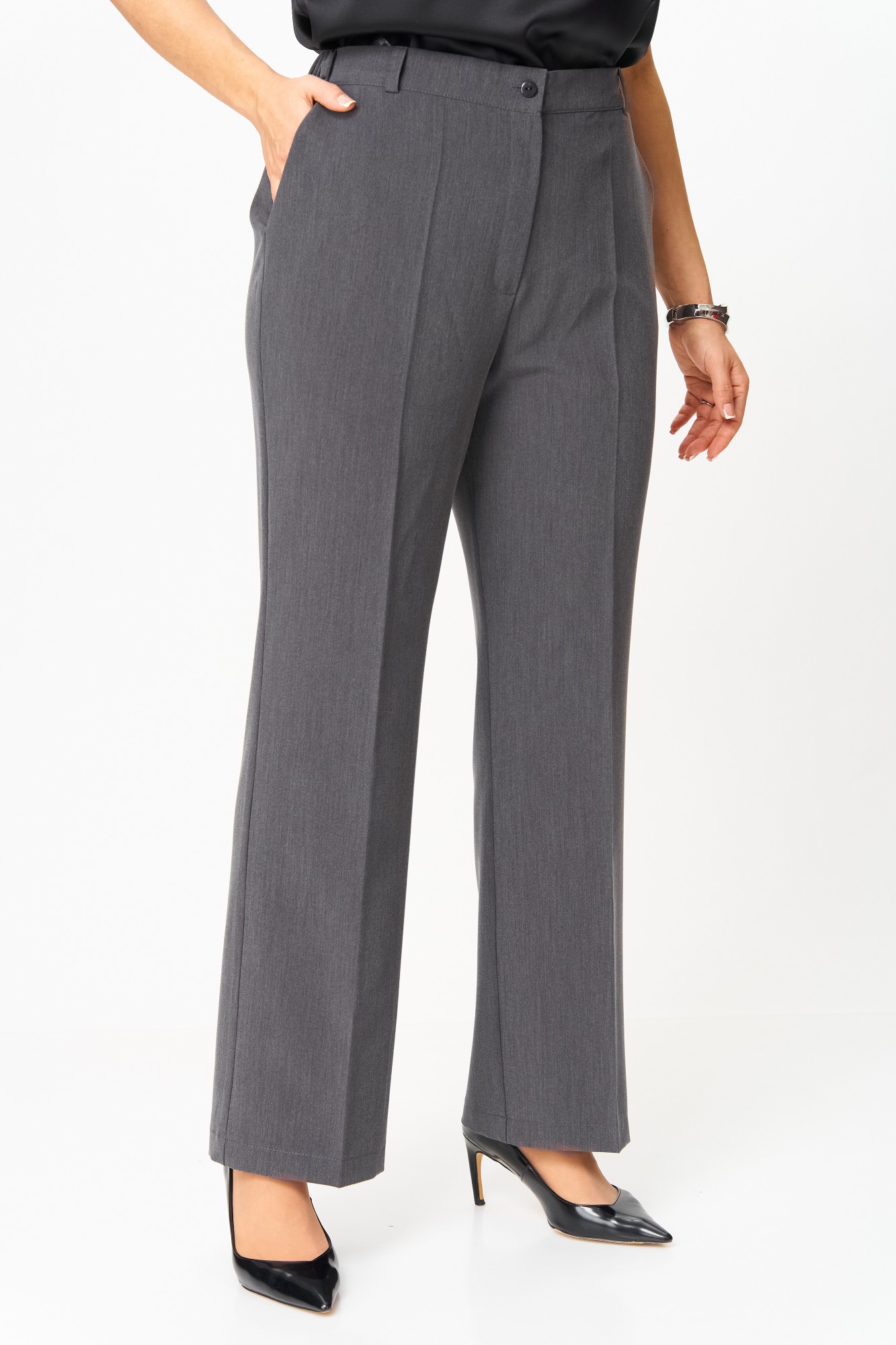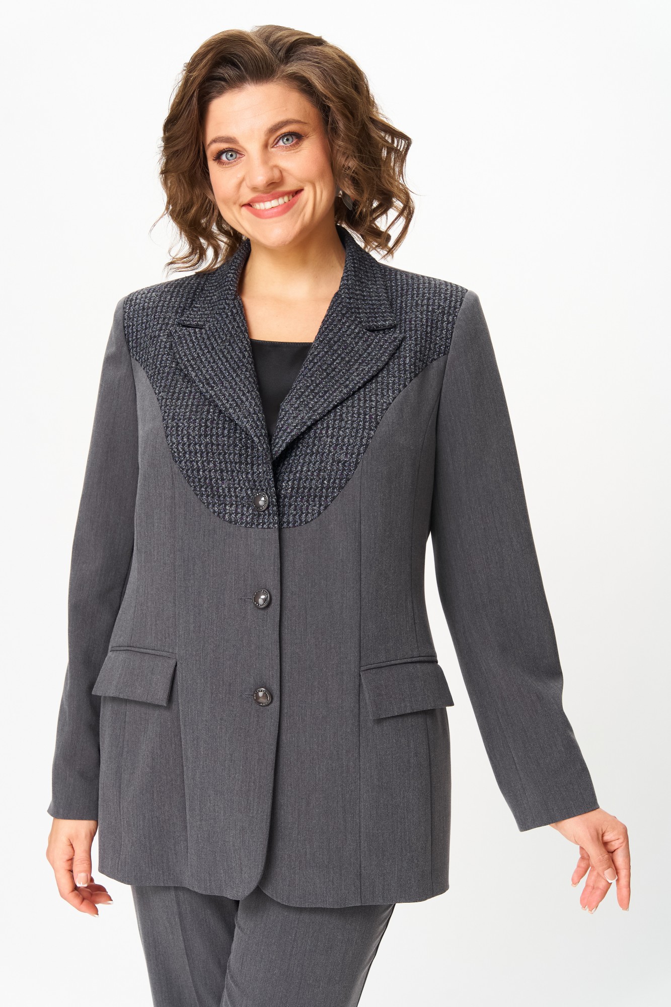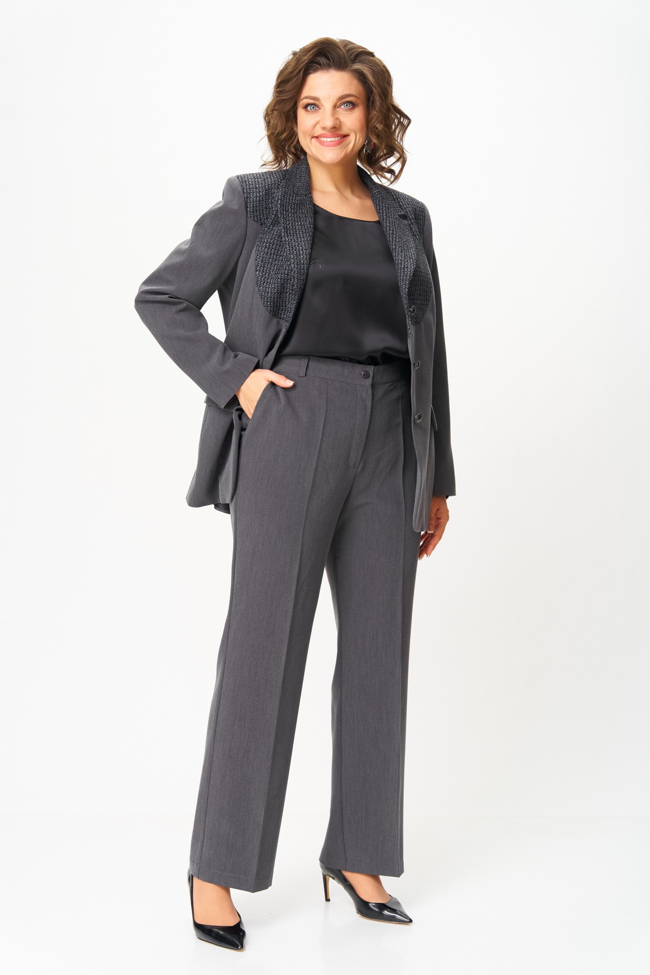 Костюм полуприлегающего силуэта, состоящий из жакета и брюк, выполнен из однотонной костюмной ткани.Ткань верха имеет механическое растяжение благодаря содержанию в ней эластана. Брючный костюм идеальный вариант как на торжественные мероприятия, так и отличный офисный вариант. Жакет полуприлегающего силуэта, на подкладке, выполнен из костюмной однотонной ткани, в качестве отделки использован твид, имеющий структурное переплетение. Полочка жакета с однобортной центральной застежкой на петли и пуговицы, вертикальными рельефами и прорезным карманом с клапаном. В верхней части полочки обработана фигурная кокетка из отделочной ткани. Горловина V-образной формы, с отложными лацканами и воротником пиджачного типа. Спинка со средним швом и вертикальными рельефами. Рукав длинный, двухшовный, втачной. Брюки полной длины, прилегающие в области бедер и свободные в колене и по низу. Брюки со стрелками. По передним половинкам выполнены наклонные карманы. В левом боковом шве обработана застежка на потайную молнию. По талии брюки на притачном поясе с эластичной тесьмой и застежкой на петлю и пуговицу. По поясу брюк обработаны шлевки под ремень.