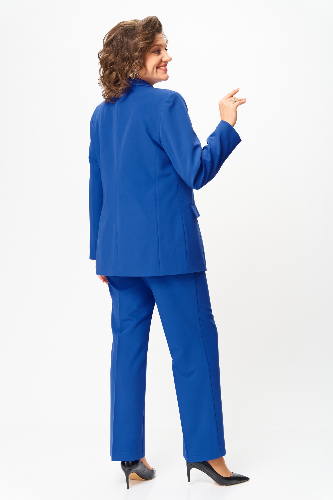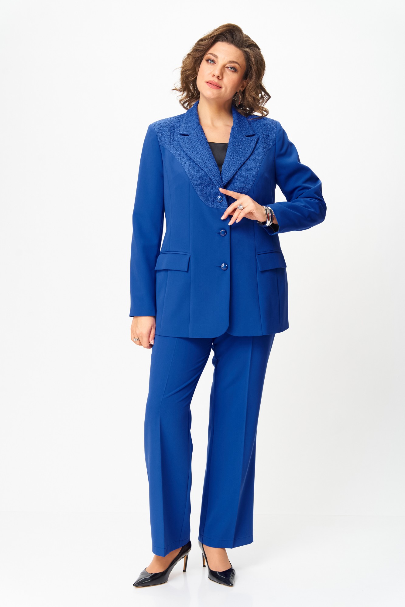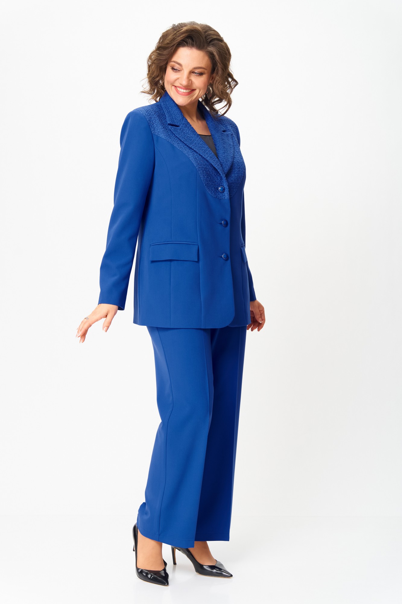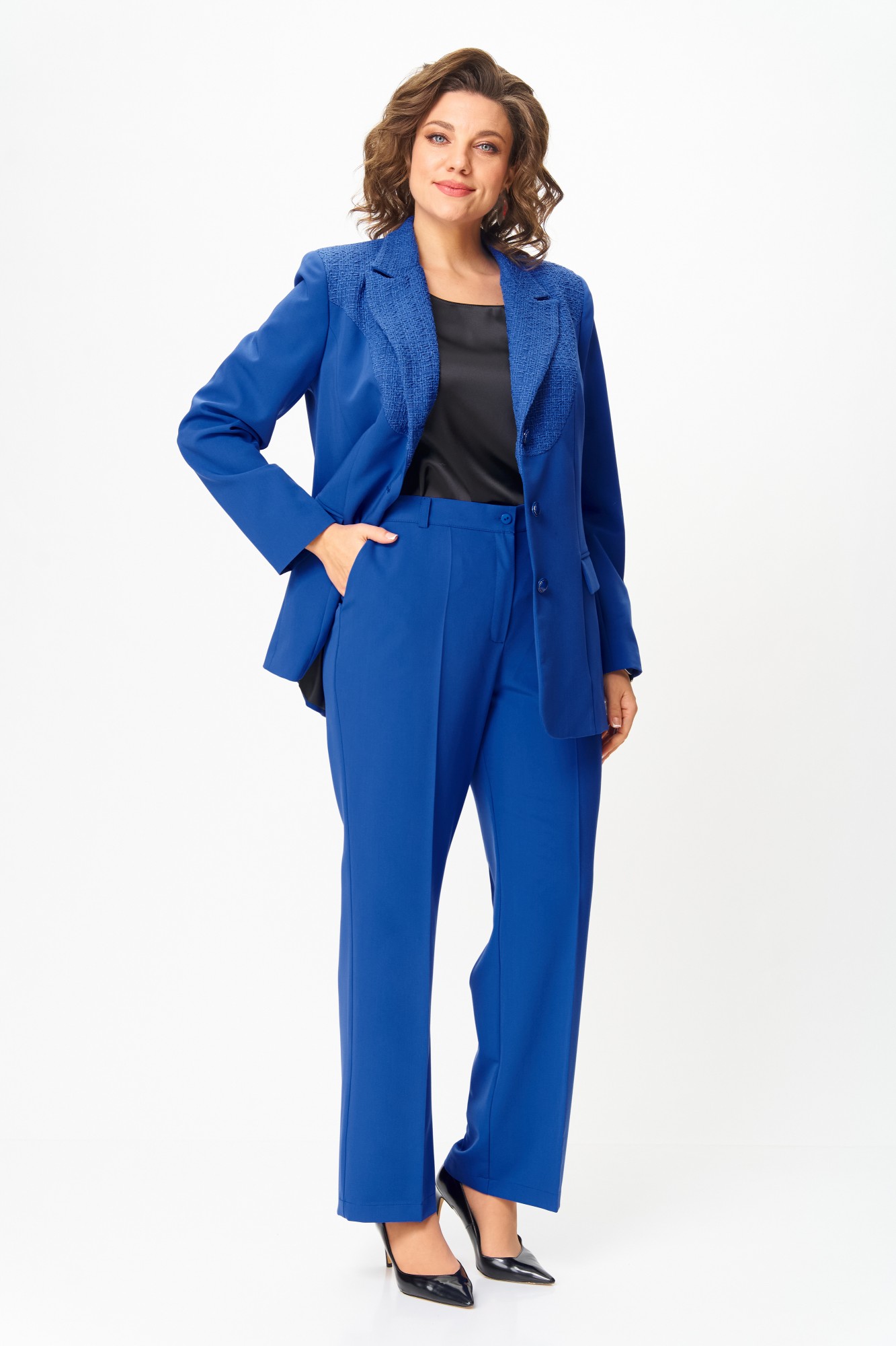 Костюм полуприлегающего силуэта, состоящий из жакета и брюк, выполнен из однотонной костюмной ткани.Ткань верха имеет механическое растяжение благодаря содержанию в ней эластана. Брючный костюм идеальный вариант как на торжественные мероприятия, так и отличный офисный вариант. Жакет полуприлегающего силуэта, на подкладке, выполнен из костюмной однотонной ткани, в качестве отделки использован твид, имеющий структурное переплетение. Полочка жакета с однобортной центральной застежкой на петли и пуговицы, вертикальными рельефами и прорезным карманом с клапаном. В верхней части полочки обработана фигурная кокетка из отделочной ткани. Горловина V-образной формы, с отложными лацканами и воротником пиджачного типа. Спинка со средним швом и вертикальными рельефами. Рукав длинный, двухшовный, втачной. Брюки полной длины, прилегающие в области бедер и свободные в колене и по низу. Брюки со стрелками. По передним половинкам выполнены наклонные карманы. В левом боковом шве обработана застежка на потайную молнию. По талии брюки на притачном поясе с эластичной тесьмой и застежкой на петлю и пуговицу. По поясу брюк обработаны шлевки под ремень.
