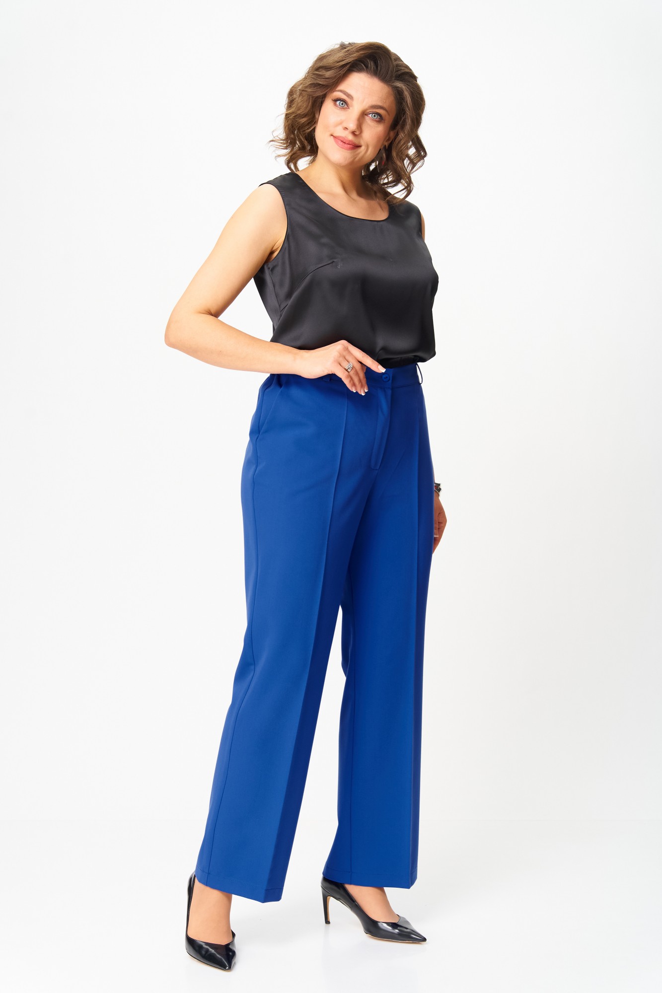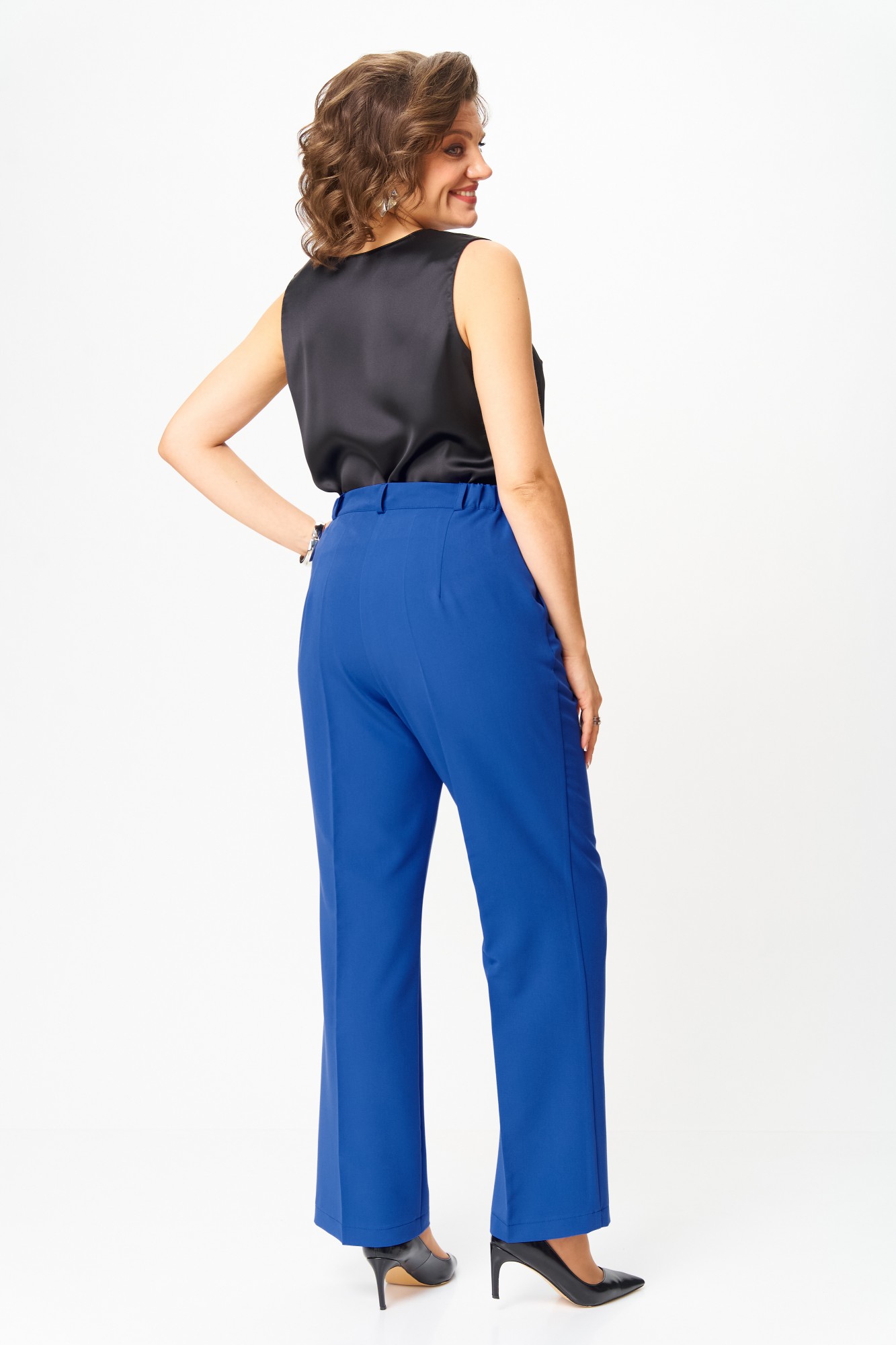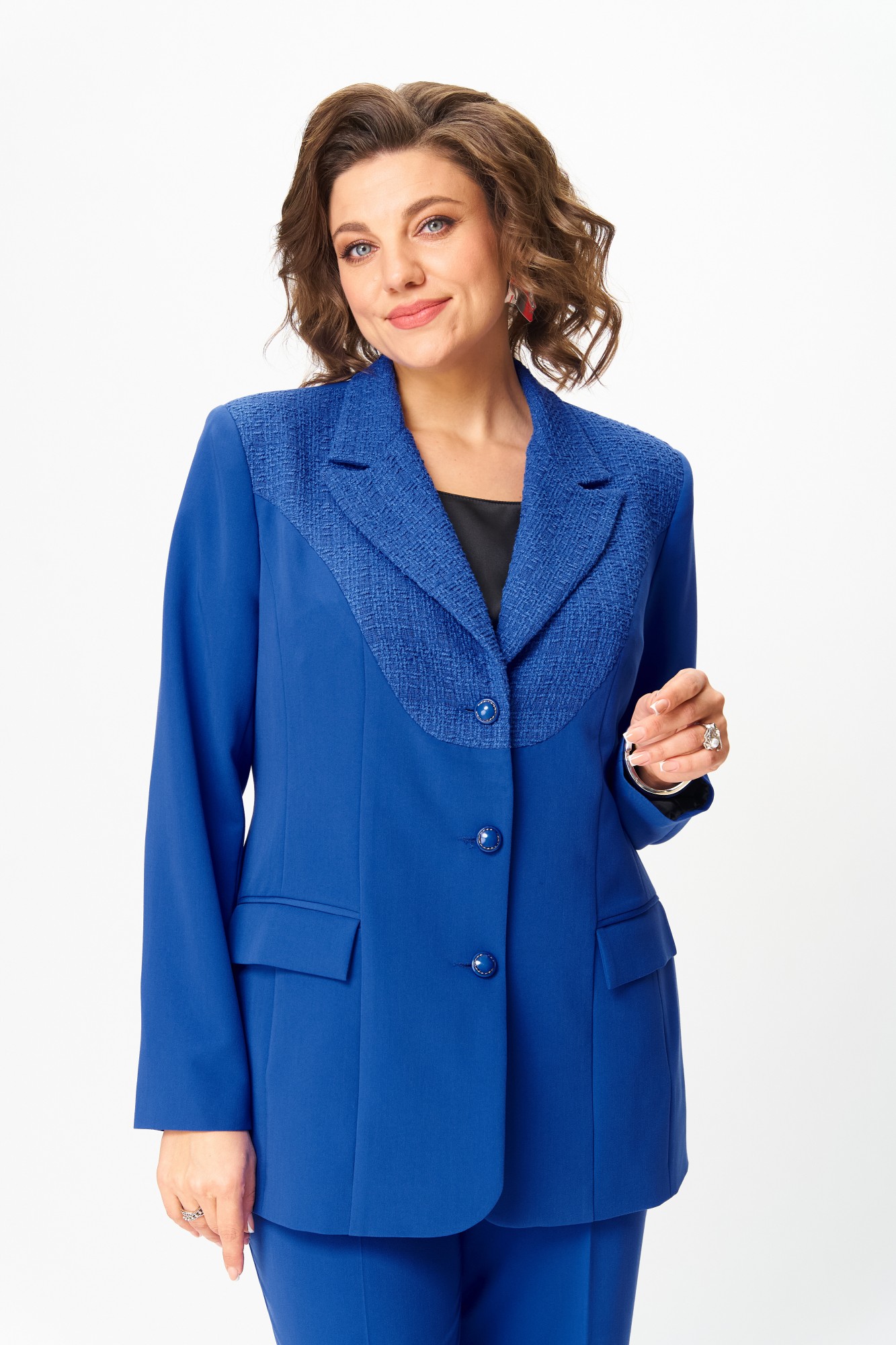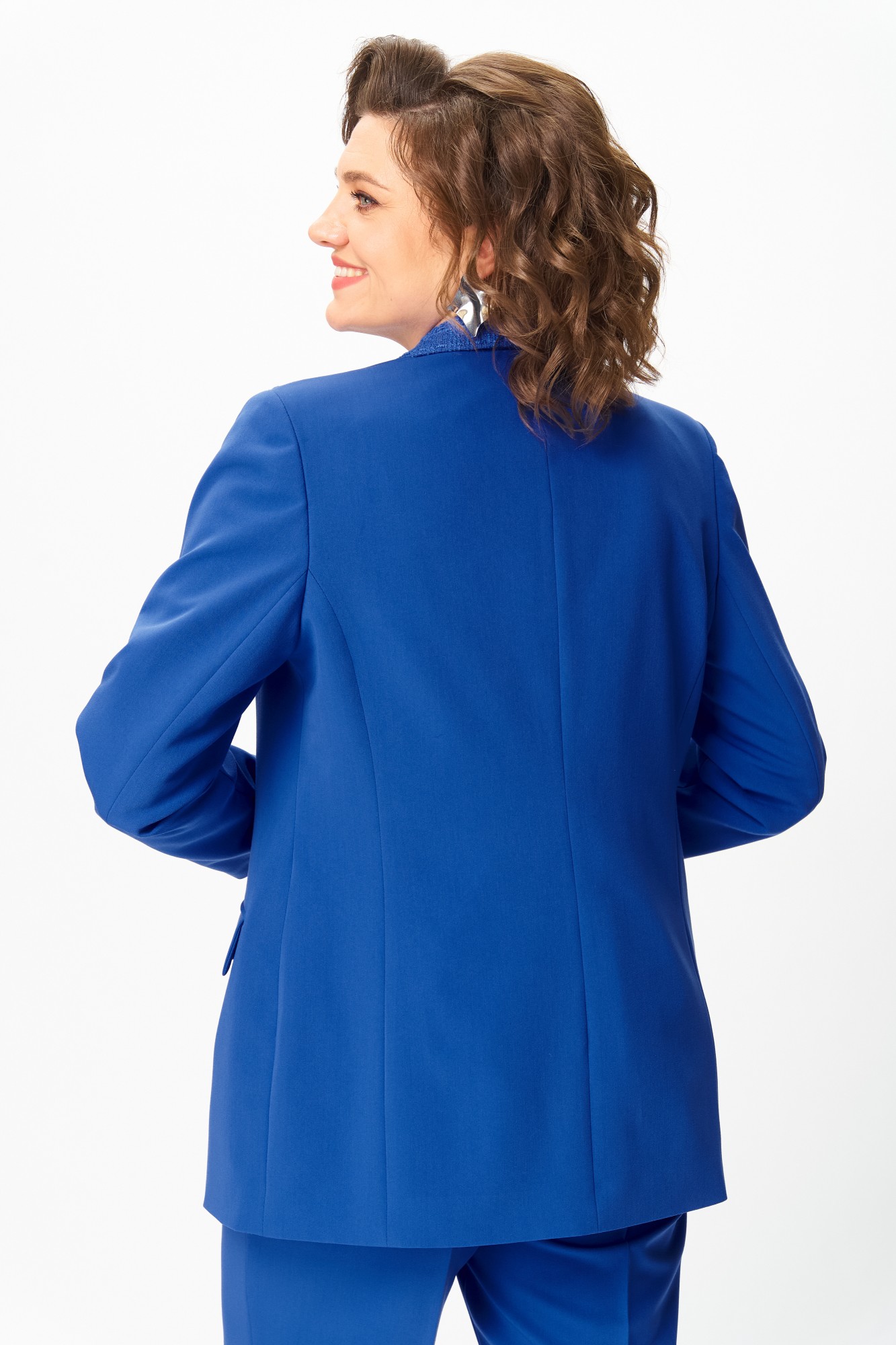 Костюм полуприлегающего силуэта, состоящий из жакета и брюк, выполнен из однотонной костюмной ткани.Ткань верха имеет механическое растяжение благодаря содержанию в ней эластана. Брючный костюм идеальный вариант как на торжественные мероприятия, так и отличный офисный вариант. Жакет полуприлегающего силуэта, на подкладке, выполнен из костюмной однотонной ткани, в качестве отделки использован твид, имеющий структурное переплетение. Полочка жакета с однобортной центральной застежкой на петли и пуговицы, вертикальными рельефами и прорезным карманом с клапаном. В верхней части полочки обработана фигурная кокетка из отделочной ткани. Горловина V-образной формы, с отложными лацканами и воротником пиджачного типа. Спинка со средним швом и вертикальными рельефами. Рукав длинный, двухшовный, втачной. Брюки полной длины, прилегающие в области бедер и свободные в колене и по низу. Брюки со стрелками. По передним половинкам выполнены наклонные карманы. В левом боковом шве обработана застежка на потайную молнию. По талии брюки на притачном поясе с эластичной тесьмой и застежкой на петлю и пуговицу. По поясу брюк обработаны шлевки под ремень.