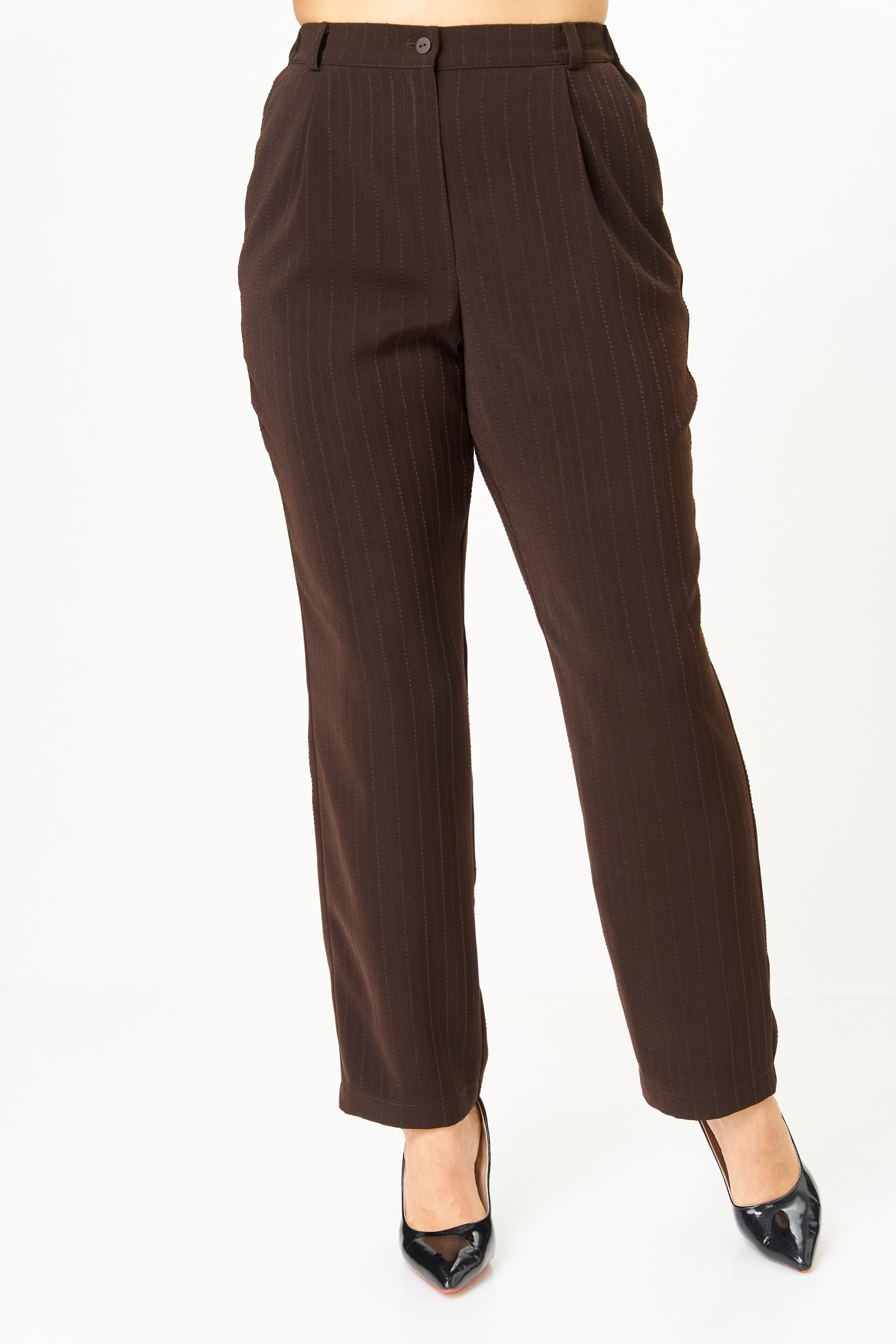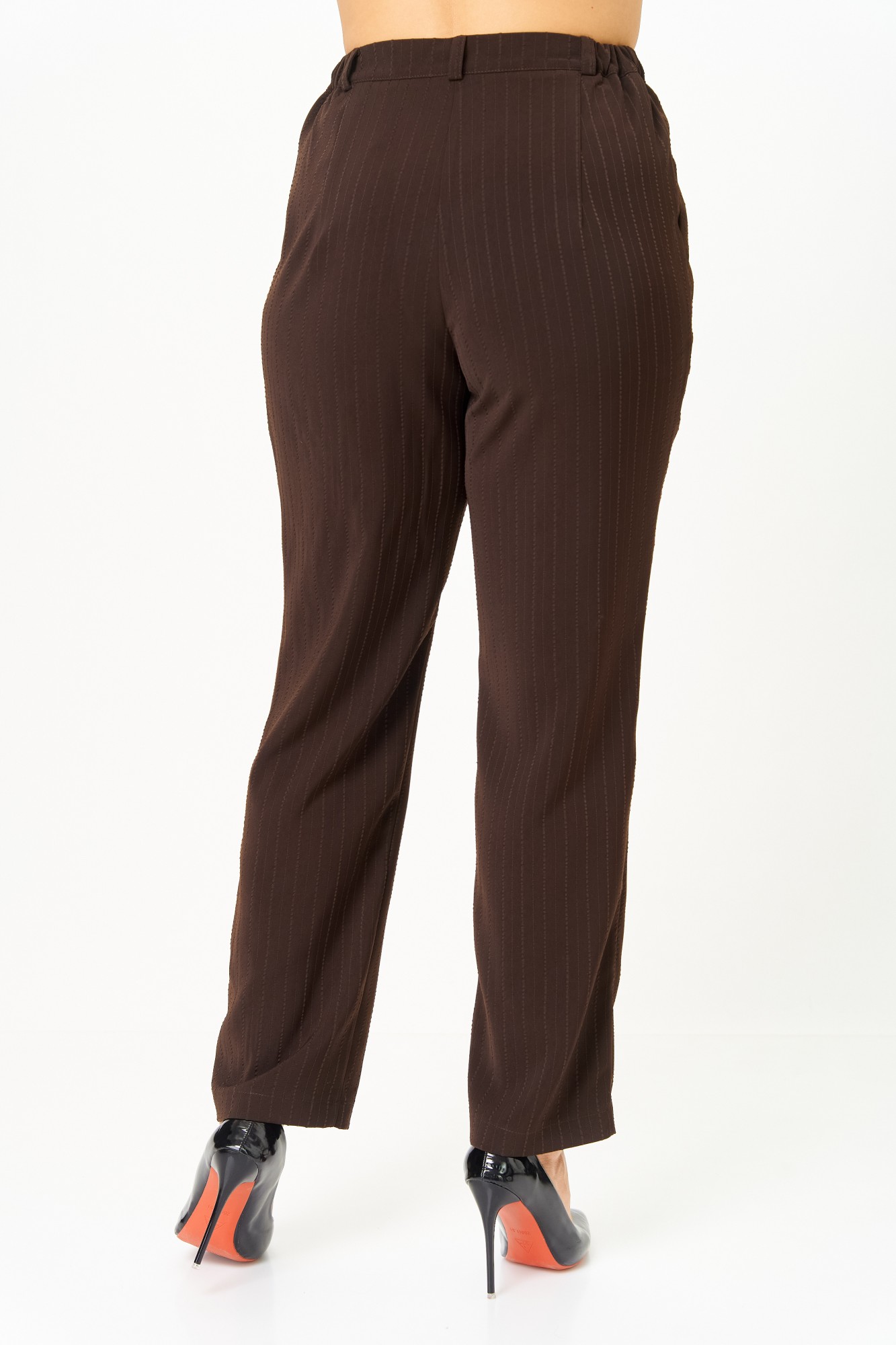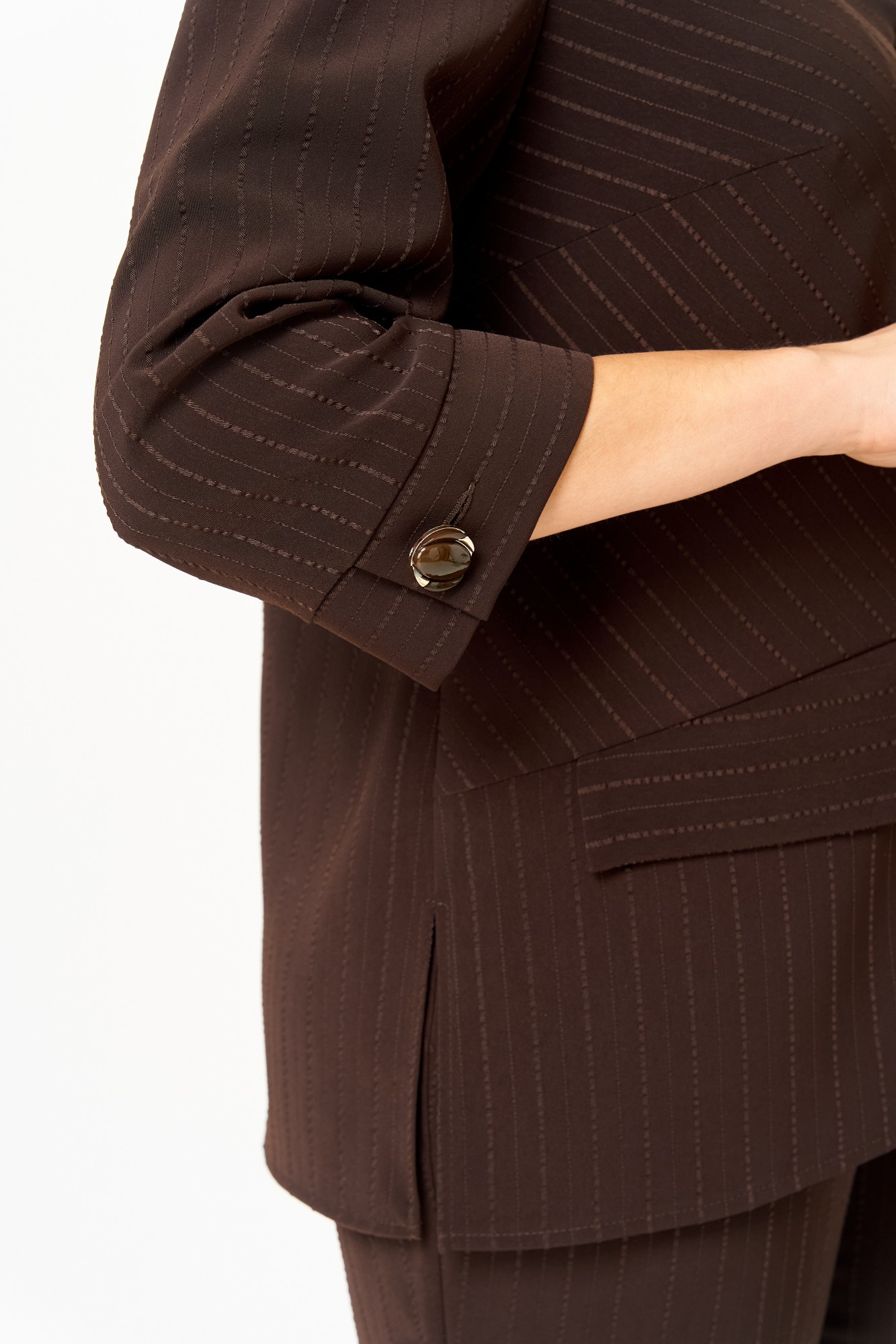 Костюм состоящий из жакета и брюк, выполнен из костюмной ткани в полоску. Жакет полуприлегающего силуэта, без подкладки. Полочка жакета с центральной застежкой на петли и пуговицы. Верхняя часть полочки с нагрудной вытачкой, нижняя часть отрезная с карманом и клапаном в шве. Горловина круглой формы, со стояче-отложным воротником. Спинка цельная. Рукав втачной, одношовный, длиной ¾. По низу рукав обработан притачной манжетой с декоративной застежкой на петлю и пуговицу. Низ жакета полочки ассиметричный. В нижней части боковых швов обработаны разрезы. Брюки классические, полной длины. В области бедер полуприлегающие, в колене и по низу прямые. По передним половинкам обработаны складки по линии талии и наклонные карманы. По задним половинкам обработаны таллиевые вытачки. Брюки на притачном поясе с эластичной тесьмой и застежкой на петлю и пуговицу.