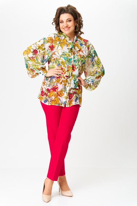 Комплект дополняет блузка шифоновая с синими и красными цветами, с объемными рукавами покроя реглан на манжетах, с планкой на пуговицах. V-образная горловина с воротником-стойкой с удлинёнными концами, которые завязываются на бант. Блузка прекрасно сидит на фигуре, прямой крой вещи вытягивает силуэт, скрывает несовершенства и подчёркивает достоинства.