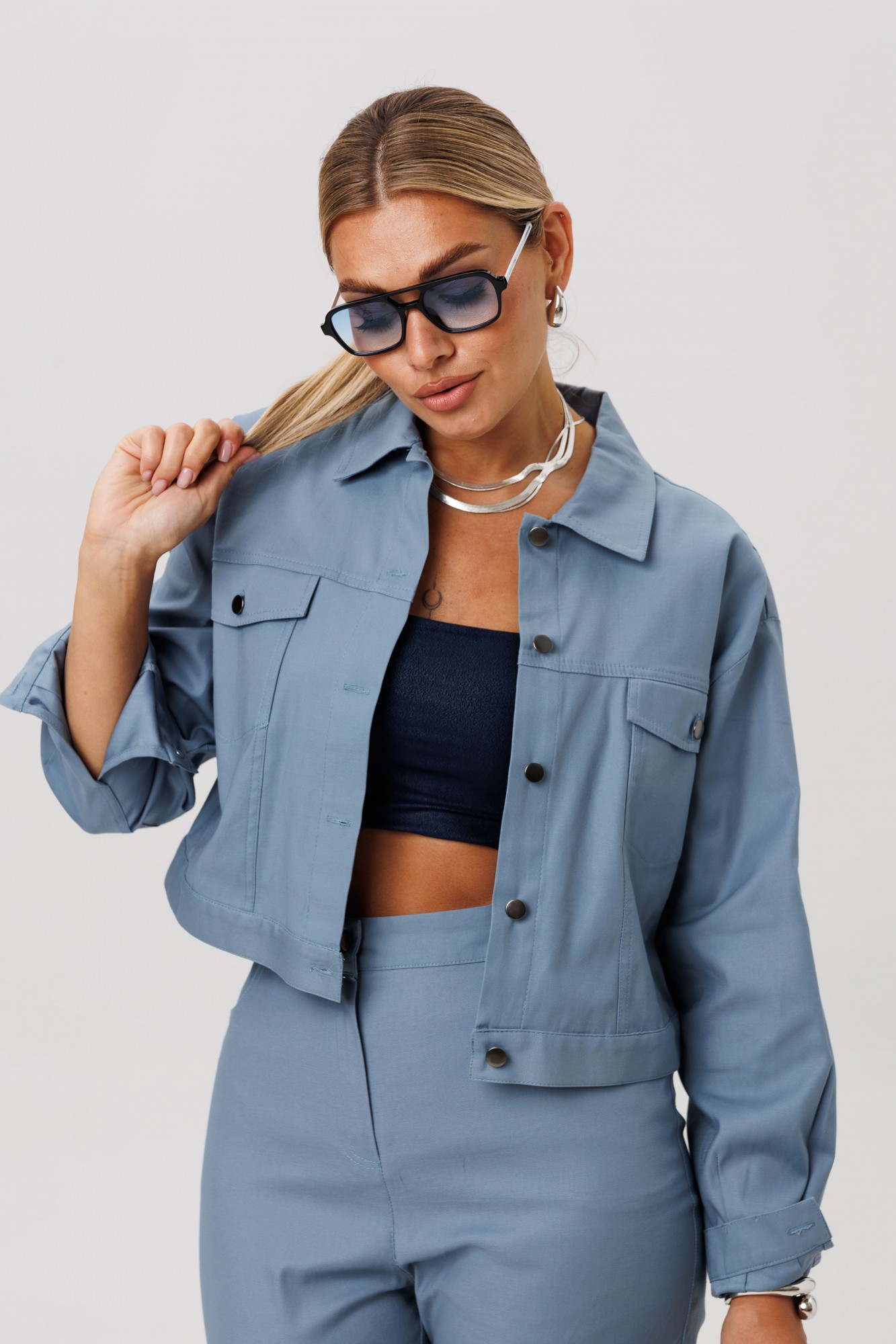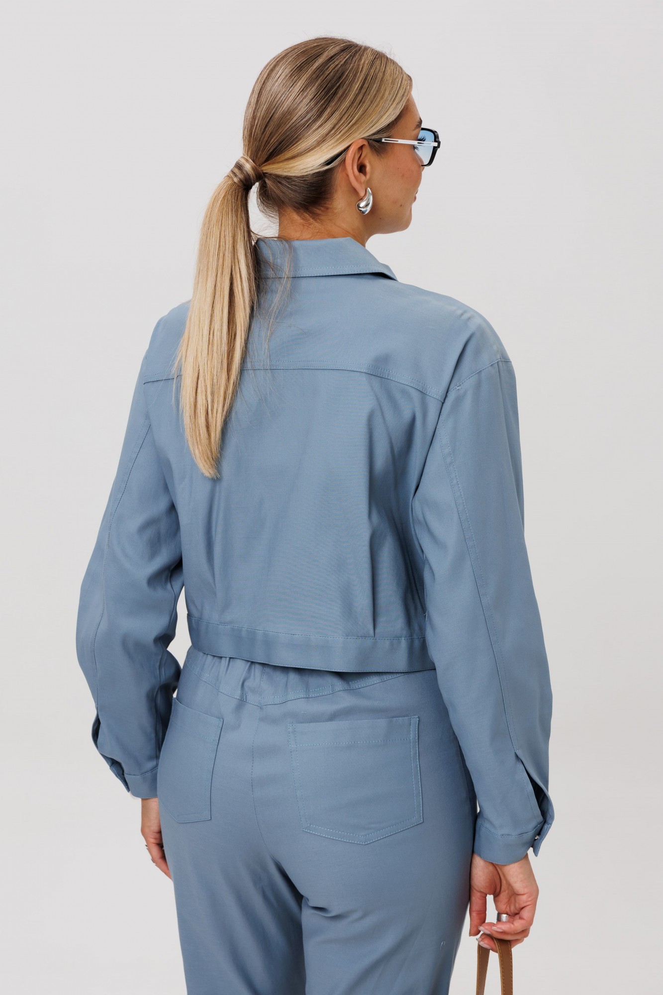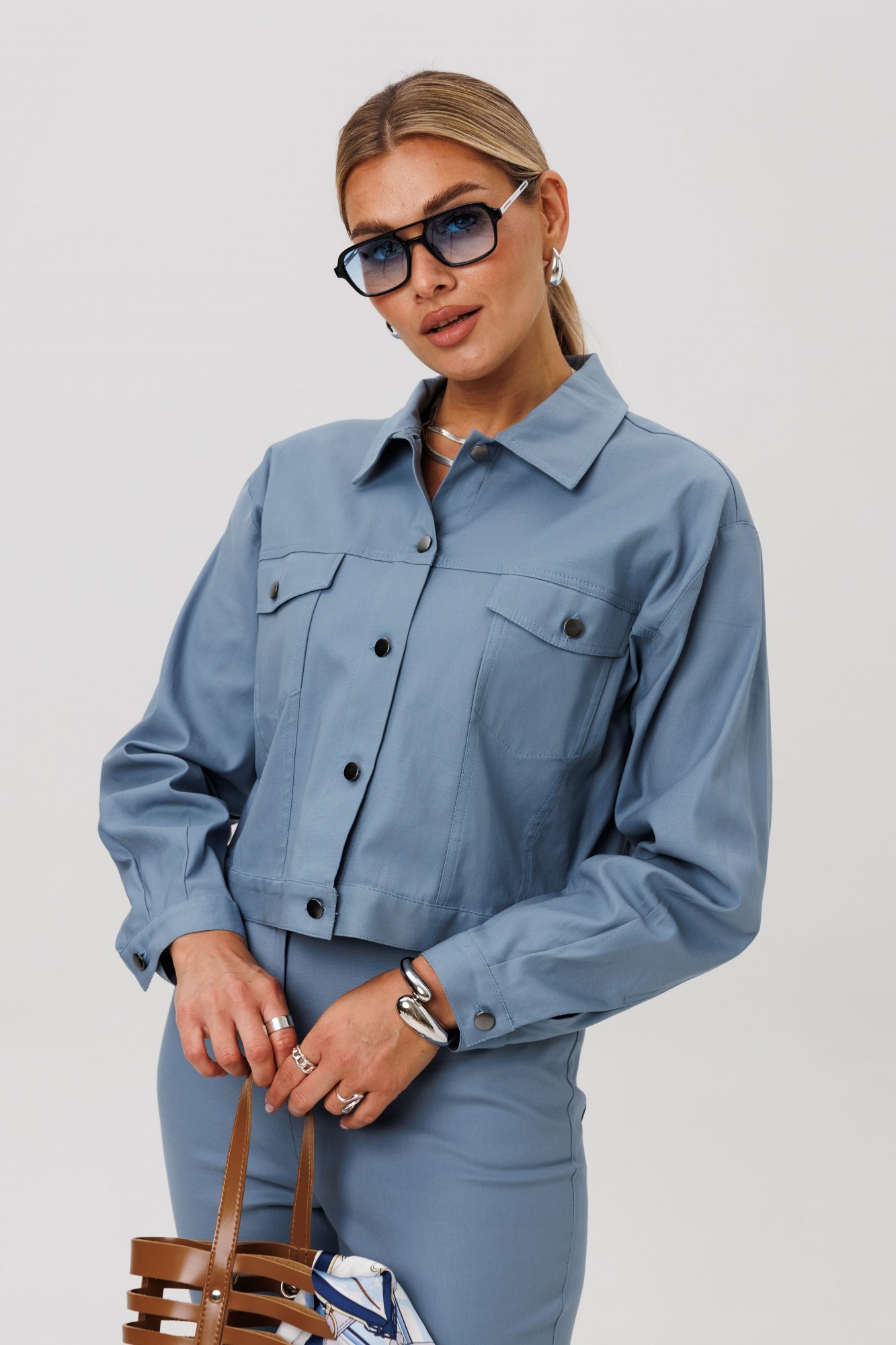 Джут укороченный, прямого кроя. Переднюю часть украшают нагрудные карманы с декоративными клапанами. Застёжка на петли и кнопки добавляет модели характер, а спинку завершает изящная кокетка. Длинные рукава заканчиваются манжетами, а горловина обработана аккуратным воротником.