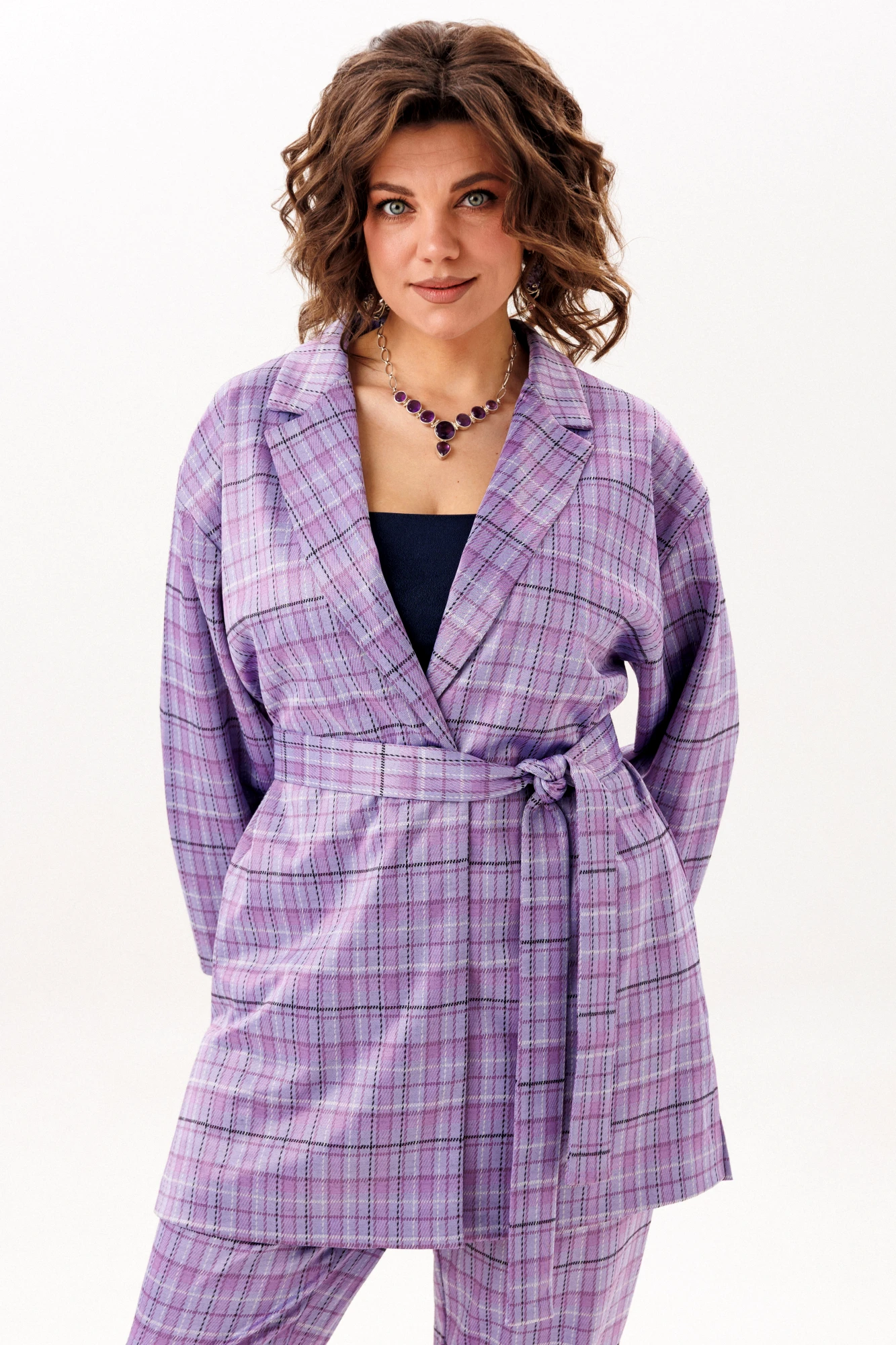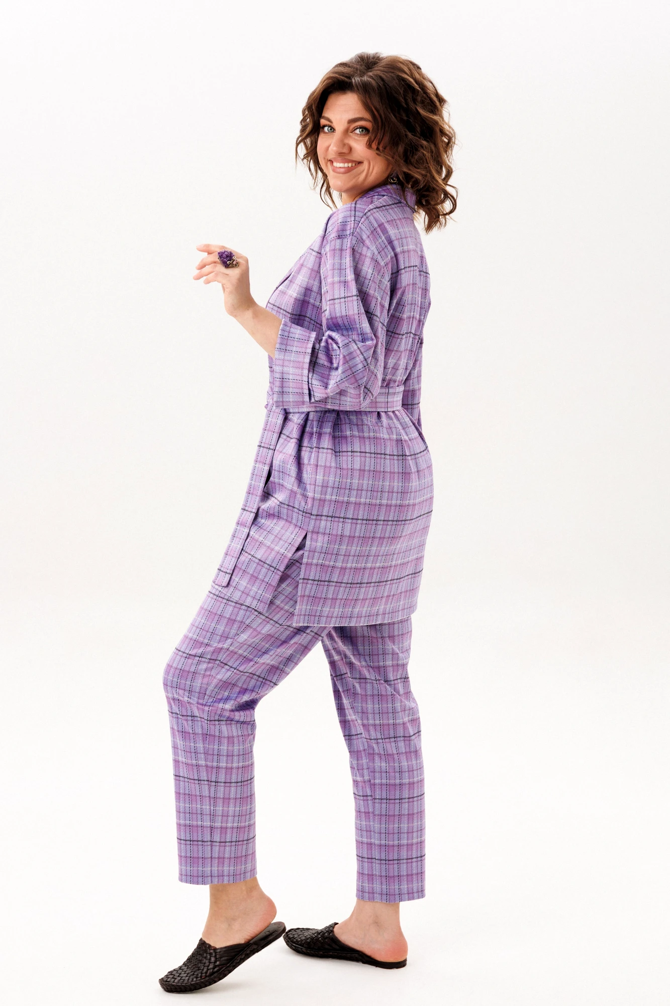 Костюм из утеплённого трикотажного полотна, выполненный в цвете «лавандовая история» с классическим клетчатым принтом. Этот актуальный предмет гардероба обладает вневременной притягательностью, оставаясь стильным независимо от сменяющихся тенденций.