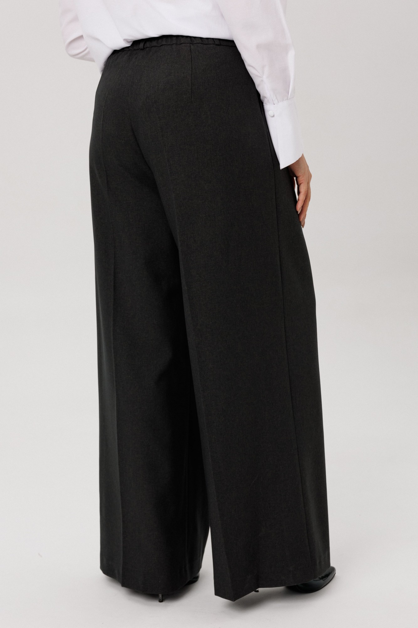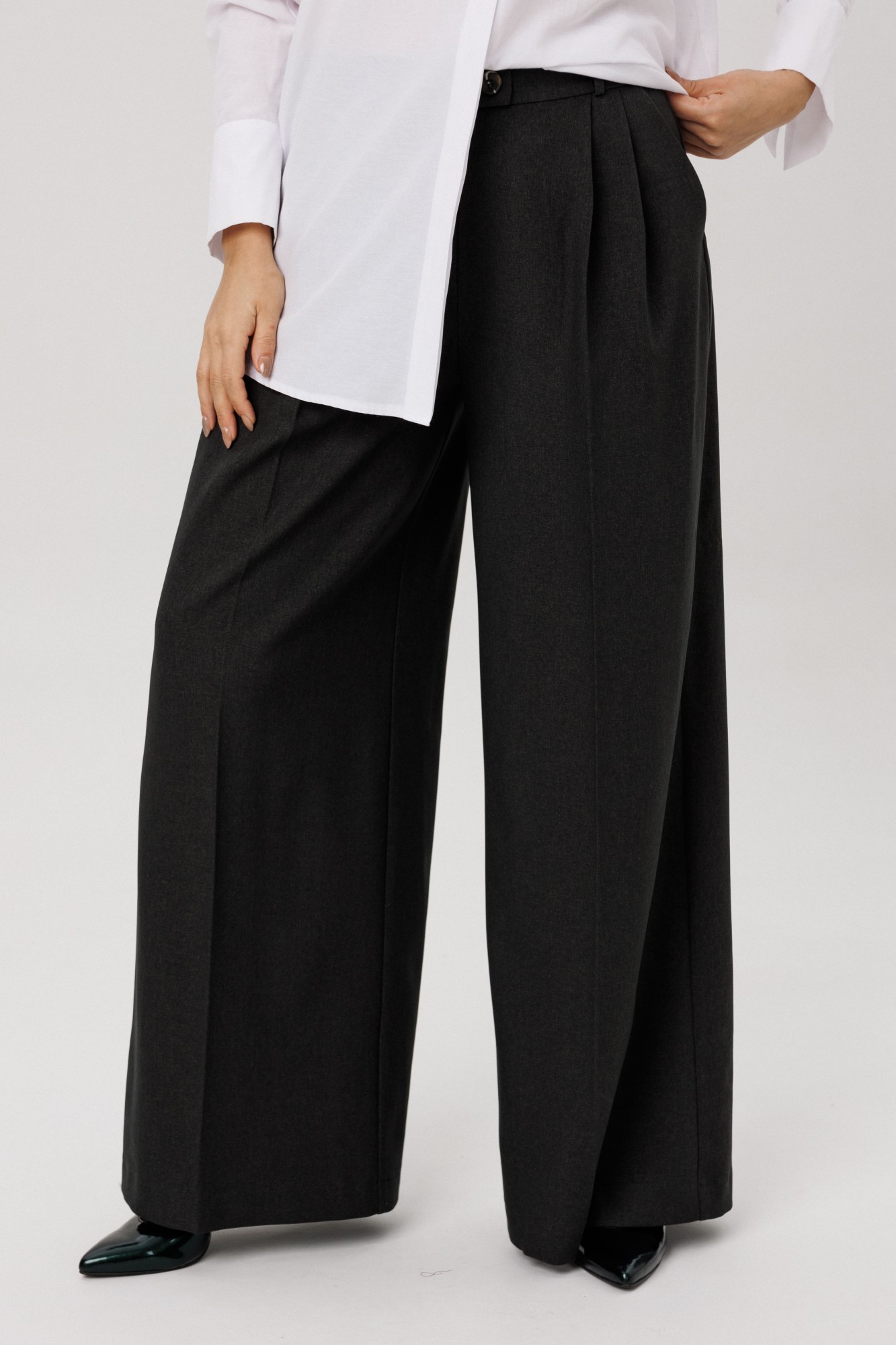 Длинные брюки палаццо с завышенной талией и защипами по переду отлично сядут на любую фигуру, подчеркнут достоинства и ловко скроют недостатки. Брюки имеют боковые карманы и застежку молнию, притачной пояс, застежку на петли пуговицы по переду.