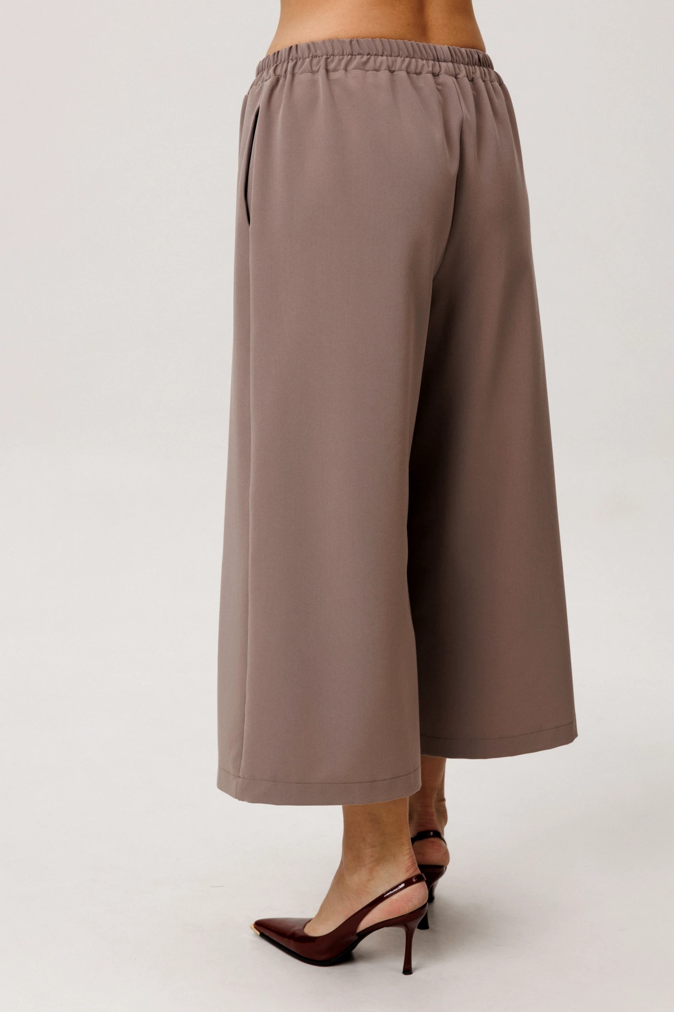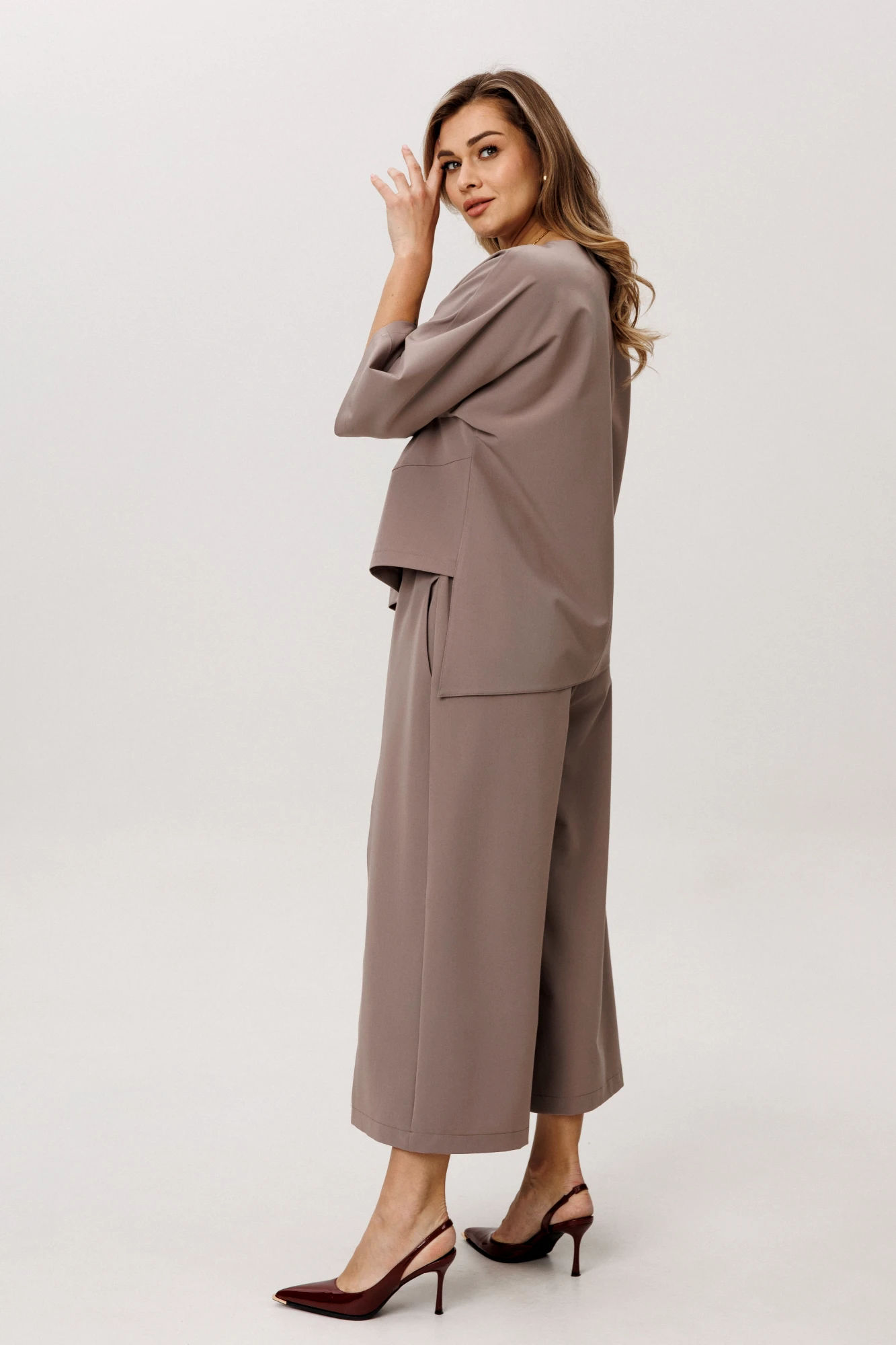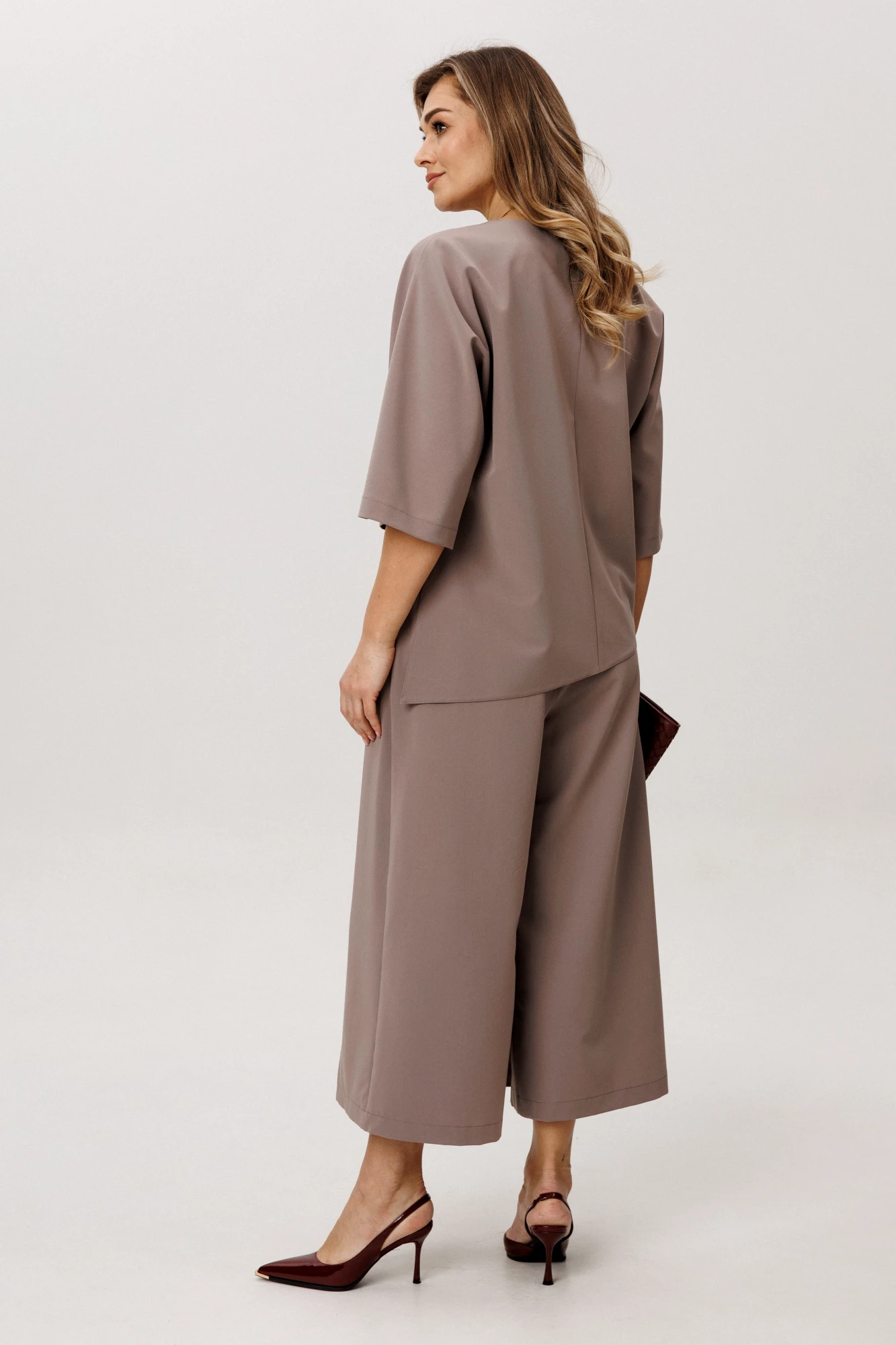 Низ костюма это юбка-брюки-кюлоты на высокой талии, струящиеся и расклешённые. Модель на запах с мягкими складками создаёт ощущение простора и лёгкости, а скрытые, фигурные карманы в швах берегут чистоту линий.