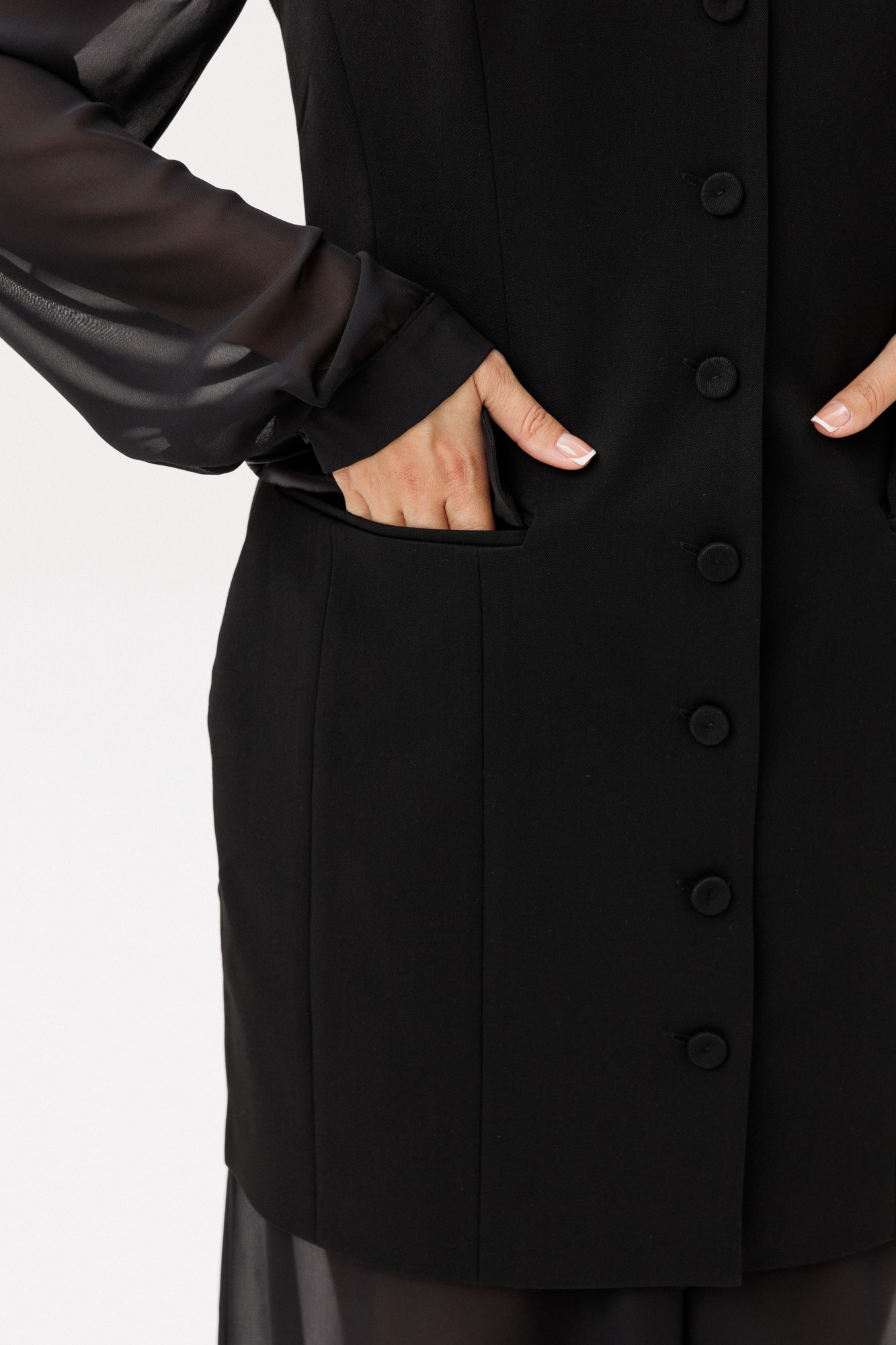 Костюм из жакета с имитацией рубашки и широких брюк. Жакет из костюмной ткани малого объема, приталенного силуэта с имитацией рубашки из шифона, на частичной подкладке по переду. На широких бретелях. Брюки широкие на подкладке. Застежка на потайную молнию в боковом шве, на поясе, по спинке резинка. Рост модели на фото 170 см.