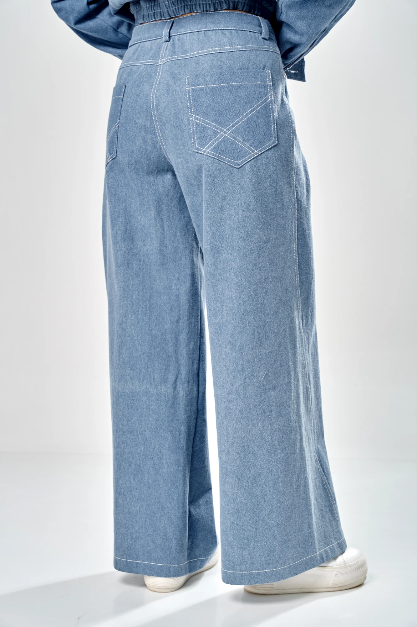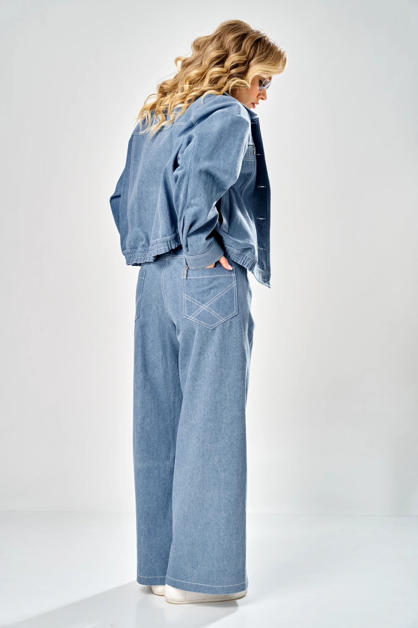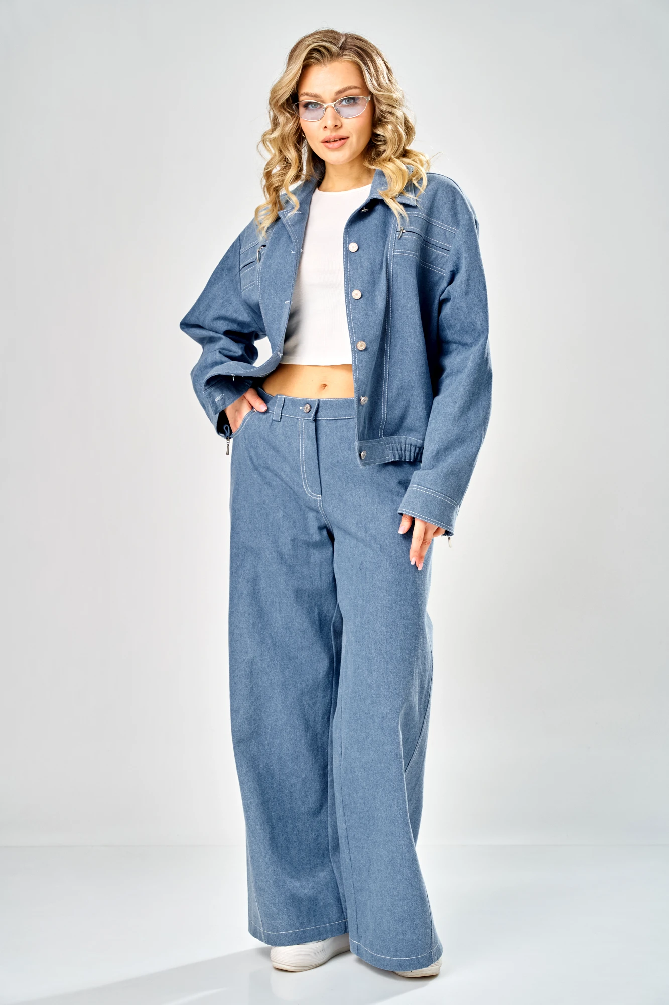 Комплект женский выполнен из джинсовой ткани, состоит из брюк и куртки.